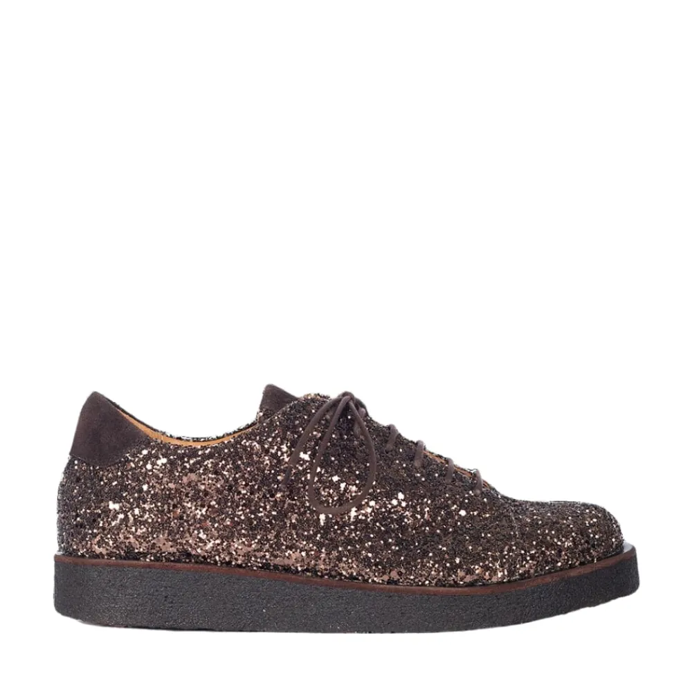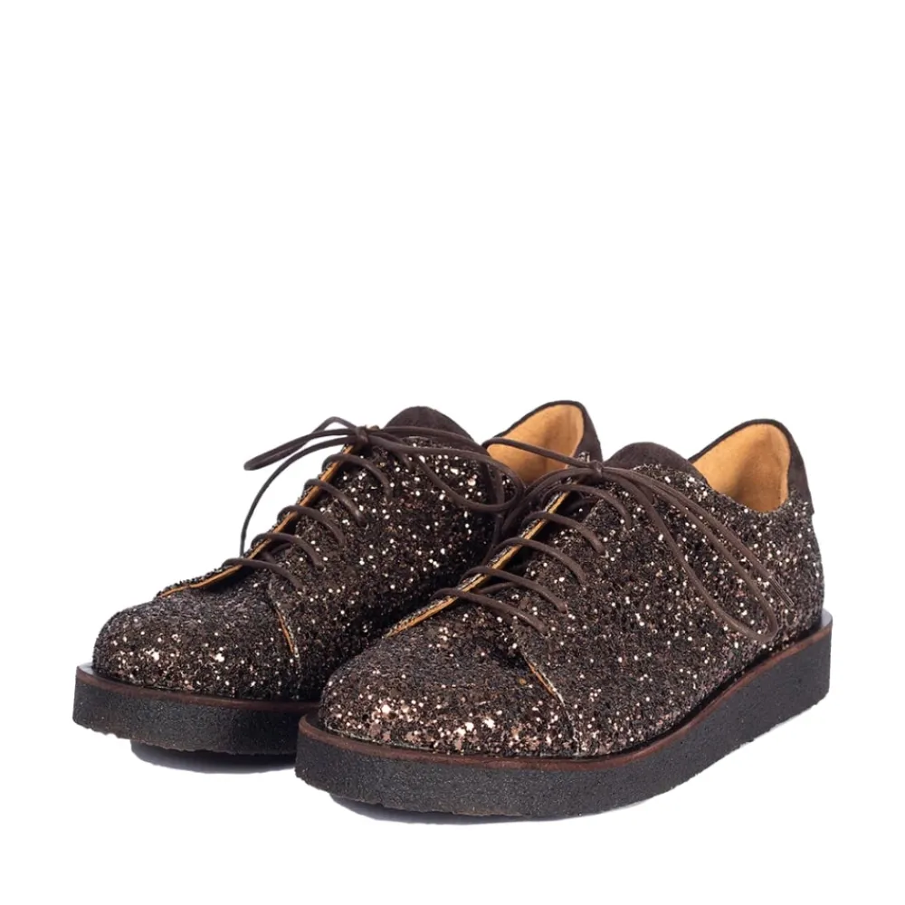 Angulus sko til dame i brun glimmer. Denne glitter og ruskinds sko er skabt med omhu, med fokus på både stil og komfort. Skoen er lavet med en blanding af glitter og ruskind, og er foret med kromfrit skindfoer for at sikre optimal komfort og en sund oplevelse for dine fødder. Den brune rågummisål giver solidt fodfæste og er blød samt fleksibel, lavet af fornybar naturgummi. Designet omfatter en rund snude, justerbar snørelukning og et ruskindslogo på tungen, hvilket tilføjer unik karakter til skoen. En polstret ruskindskrave tilbyder ekstra komfort og støtte, mens den polstrede indersål og læderforing sikrer en behagelig pasform hele dagen. Skoen er håndlavet i Portugal af dygtige håndværkere og designet i Danmark for at tilføje en smule skandinavisk elegance til din garderobe.