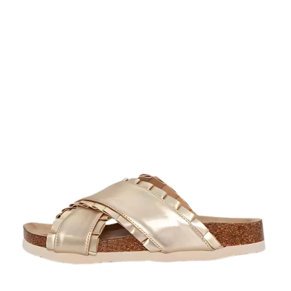 Duffy Florens Uno sandal til dame i guld. Denne fortryllende sandal i en moderne gylden farvetone er en sand fryd for øjet. Med sine smukt krydsende remme og plisserede kanter tilføjer den et unikt touch af elegance til ethvert outfit. Sandalen har også en dejlig blød sål, komplet med en ekstra pude i hælen, der sikrer optimal komfort hele dagen. Denne sandal er simpelthen uundværlig til sommeren, hvor dens fortryllende farve skaber et strålende look, mens dens solide sål giver stabilitet og støtte.