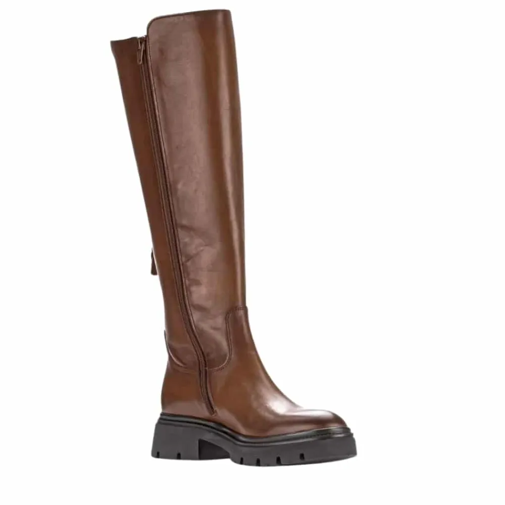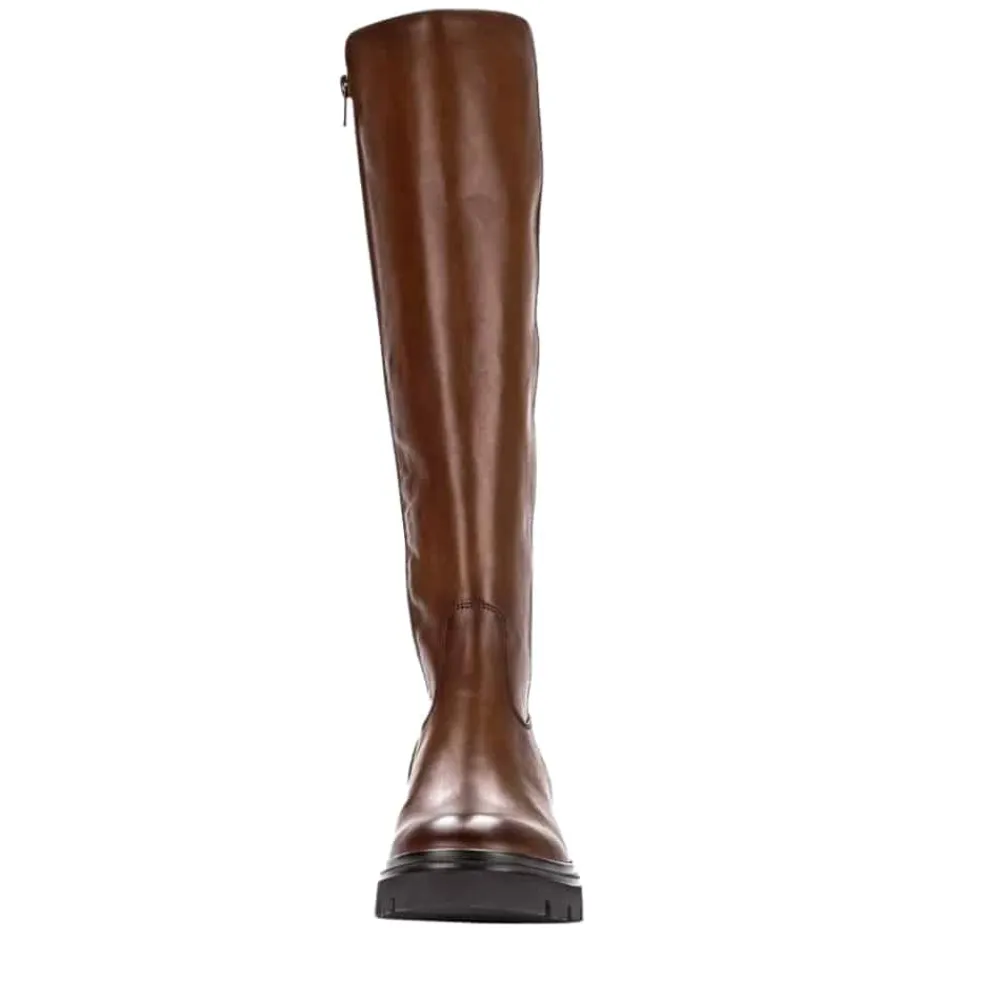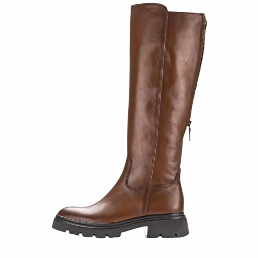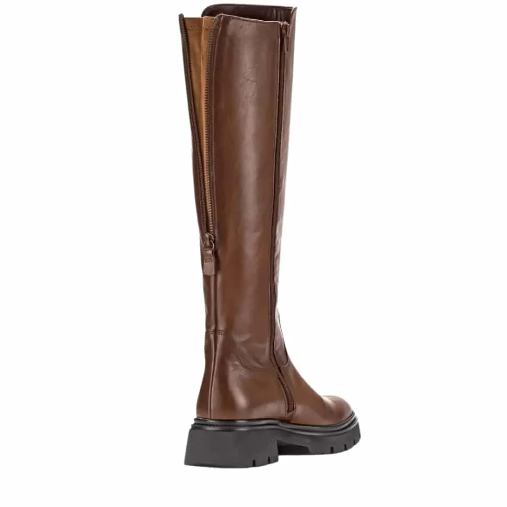 Gabor lang støvle til dame i brun. Denne lange brune støvle er fremstillet i skind og kombinerer klassisk elegance med praktiske detaljer. Støvlen har en funktionel lynlås bagpå, som giver en rummelig pasform og et feminint udtryk, mens lynlåsen på indersiden gør den let at få af og på. Indvendigt er støvlen udstyret med en blød, udtagelig sål og en let foring, som giver behagelig komfort dagen igennem. Den chunky ydersål er mønstret og sikrer godt greb og øget skridsikkerhed.