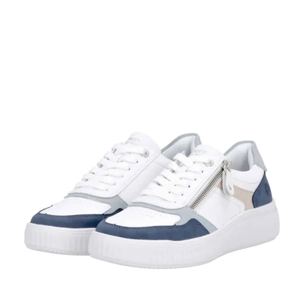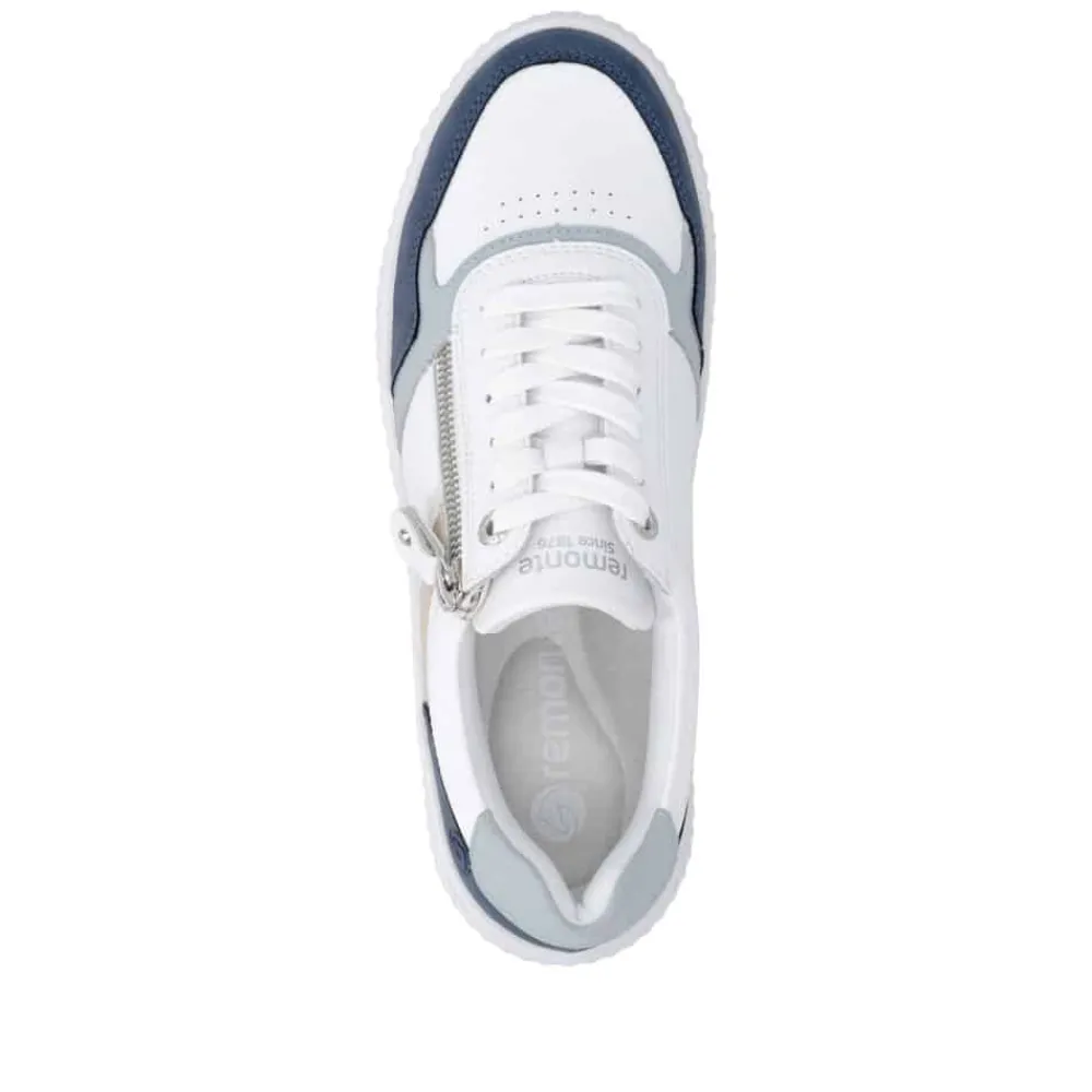 Remonte sneakers til dame i hvid. Disse smarte sneakers med skindoverdel i hvid og blå detaljer kombinerer stil med praktiske løsninger til hverdagen. Skoen er udstyret med både snørebånd og en funktionel lynlås, så pasformen nemt kan justeres efter foden. Indvendigt bliver du mødt af en blød og udtagelig indersål samt ekstra bredde (H), som giver god rummelighed og høj komfort hele dagen. Ydersålen er designet med et mønster, der giver øget stødabsorbering og skridsikkerhed i hvert skridt.