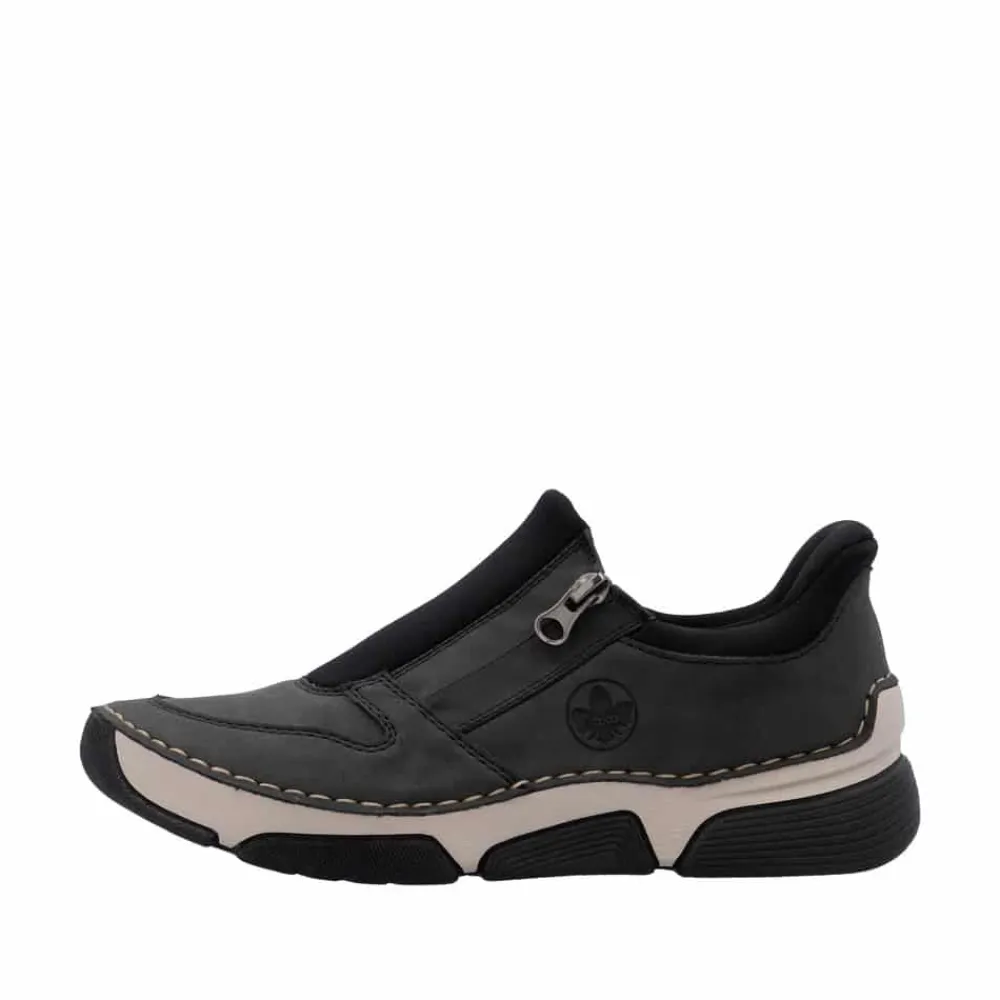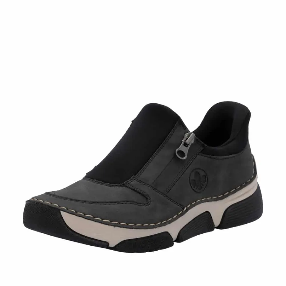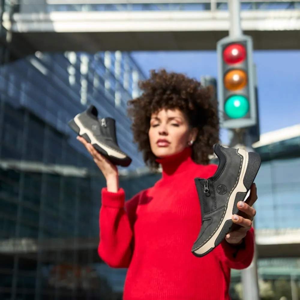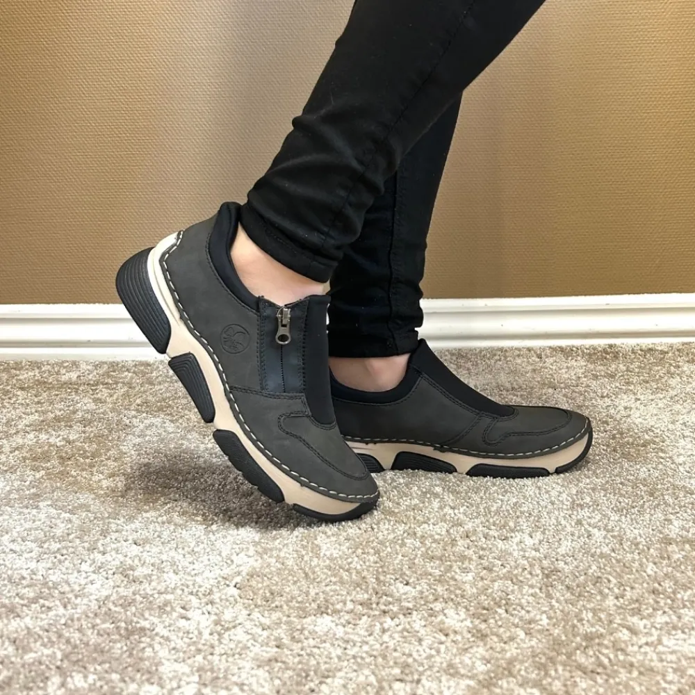 Rieker Ready 2 Go sko til dame i grå og sort. Moderne sko til dame i sort og grå med smarte detaljer. Skoen er udstyret med Ready 2 Go-teknologi og en fast hælkappe, som gør det nemt at komme i og af skoen uden brug af hænder. På siden har skoen en funktionel lynlås, der tilføjer både stil og funktion. Indvendigt bliver du mødt af en blød udtagelig indersål i skind, som giver god komfort dagen lang. Skoen er let og fleksibel, og ydersålens mønster er med til at øge både stødabsorbering og skridsikkerhed.