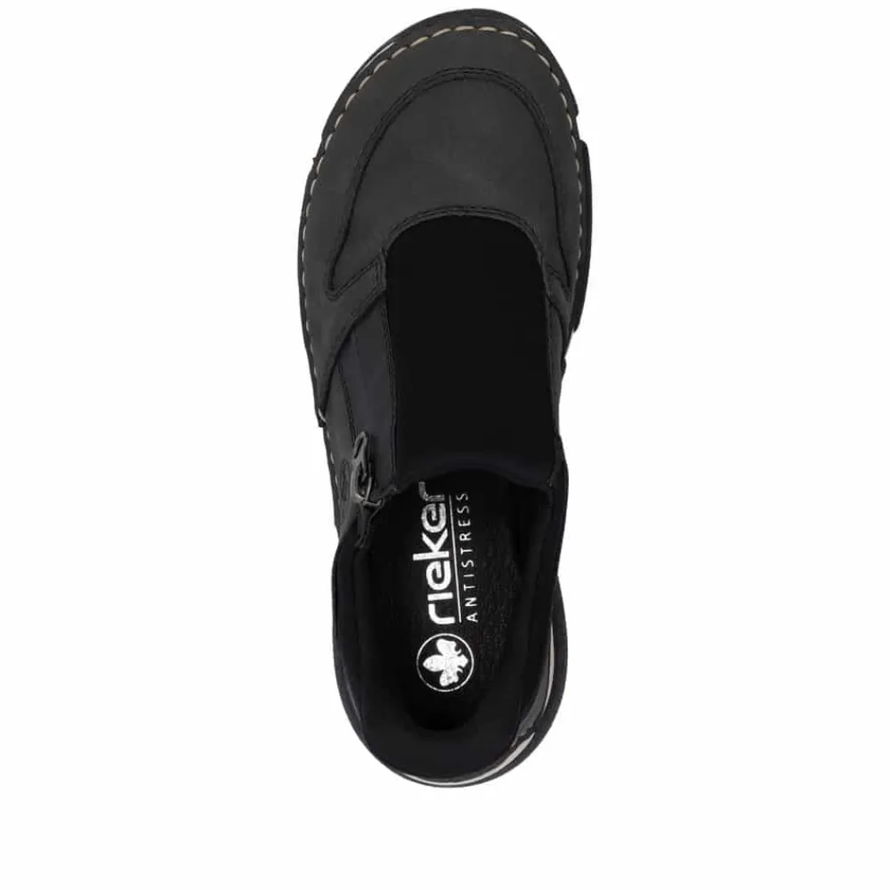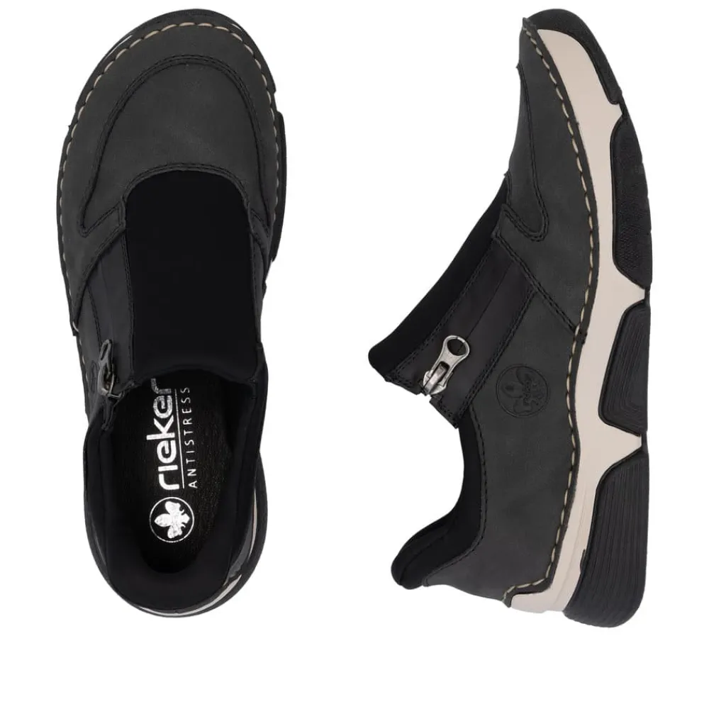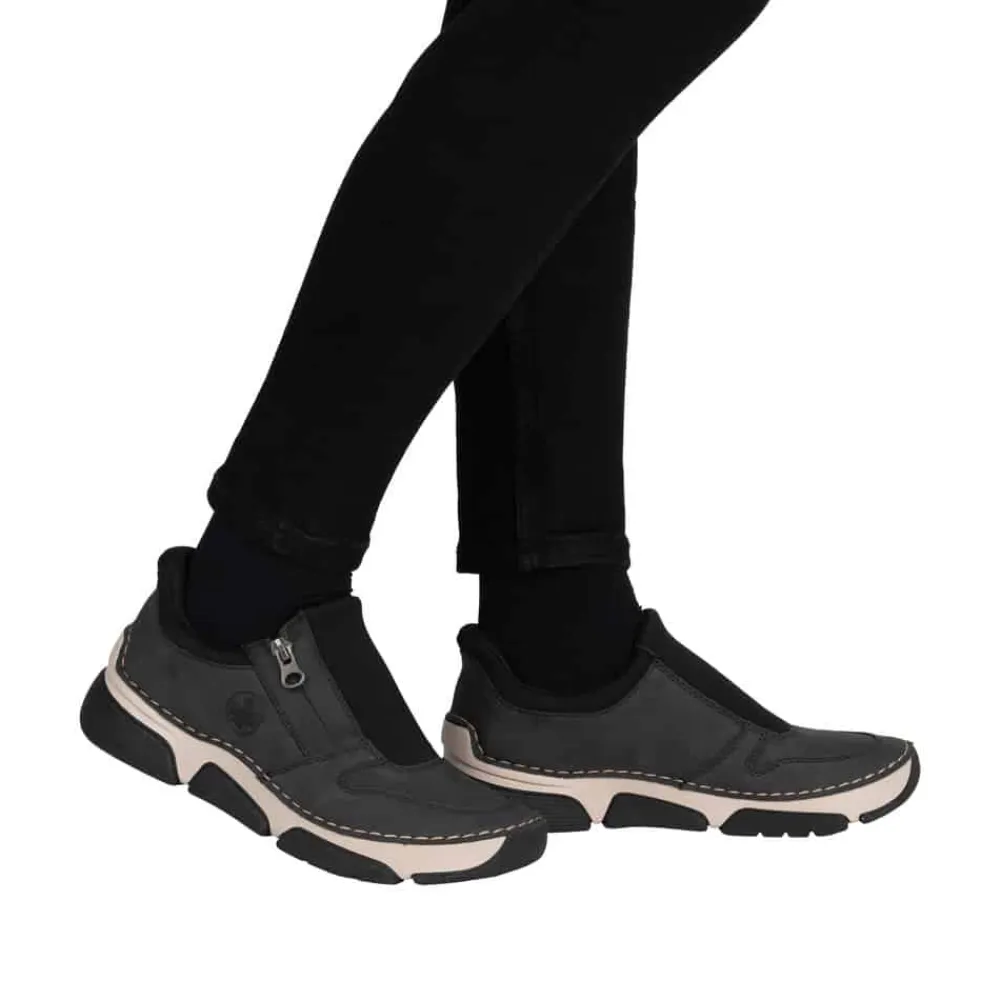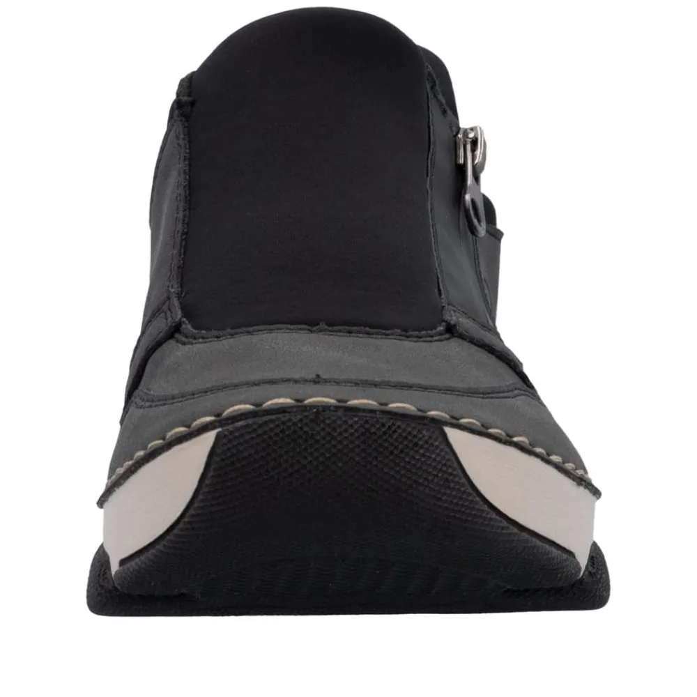 Rieker Ready 2 Go sko til dame i grå og sort. Moderne sko til dame i sort og grå med smarte detaljer. Skoen er udstyret med Ready 2 Go-teknologi og en fast hælkappe, som gør det nemt at komme i og af skoen uden brug af hænder. På siden har skoen en funktionel lynlås, der tilføjer både stil og funktion. Indvendigt bliver du mødt af en blød udtagelig indersål i skind, som giver god komfort dagen lang. Skoen er let og fleksibel, og ydersålens mønster er med til at øge både stødabsorbering og skridsikkerhed.
