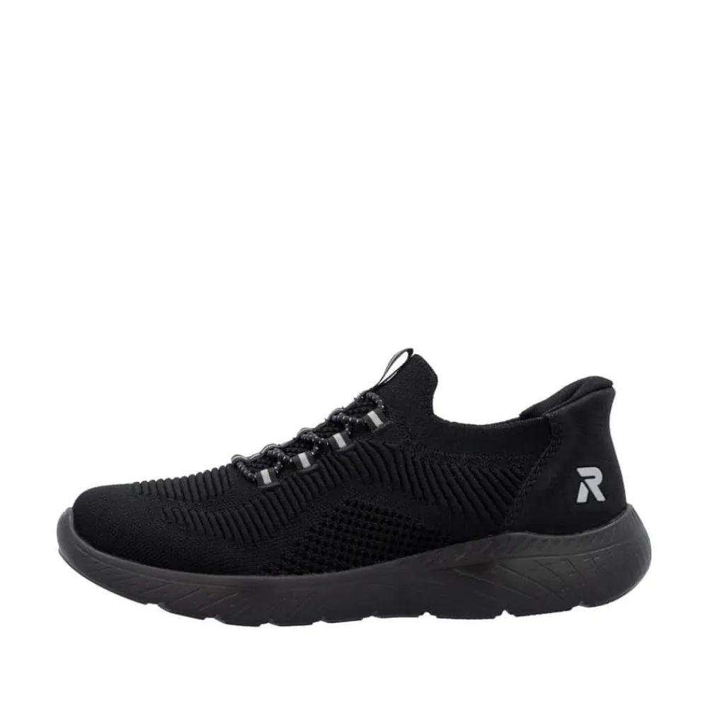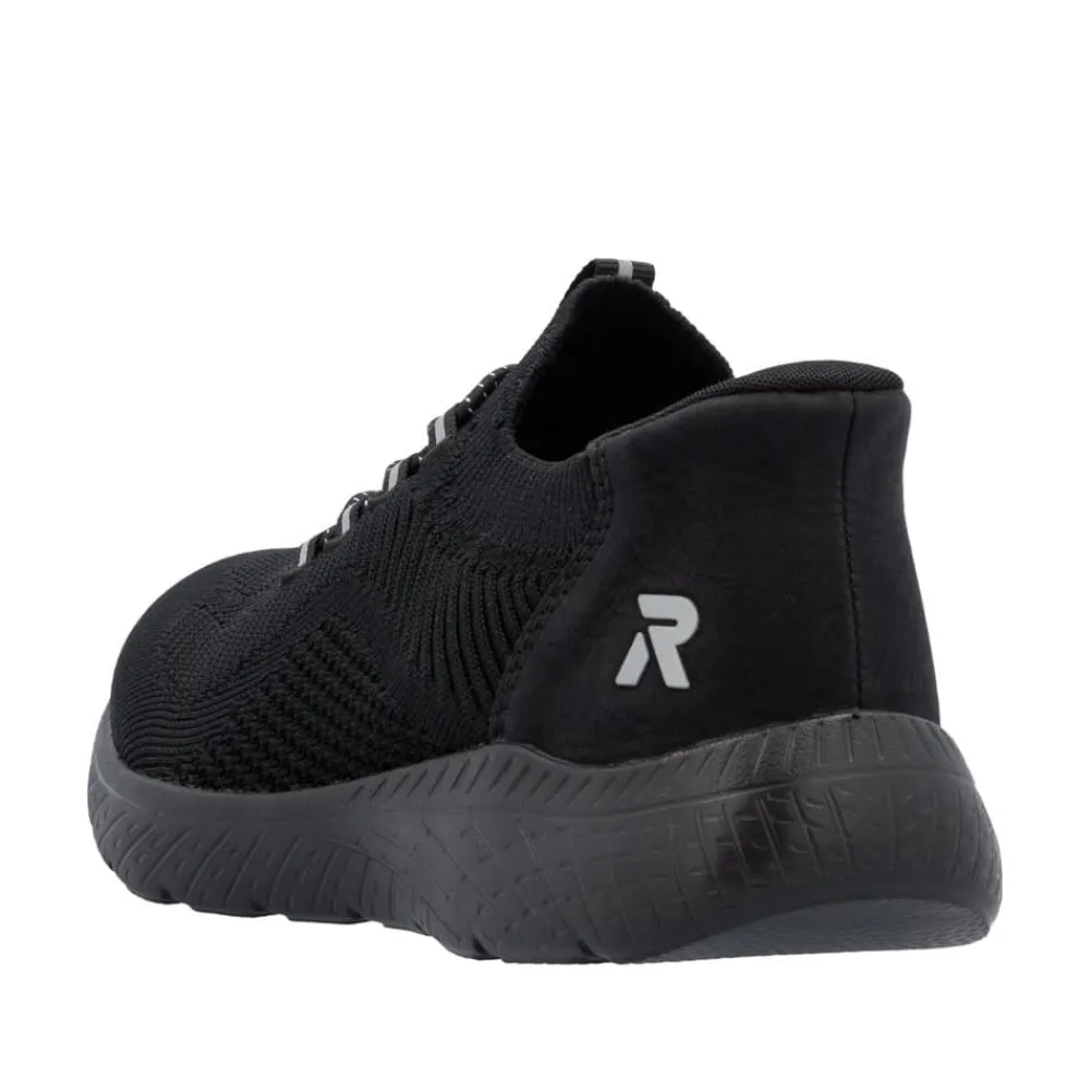Rieker Ready 2 Go sneakers til dame i sort. Moderne sneakers i sort med flotte detaljer og elastik foran, der sikrer en fleksibel og behagelig pasform. Skoen er udstyret med Hands Free Ready 2 Go teknologi og en fast hælkappe, så du nemt kan tage skoen på uden at bruge hænder. Indvendigt finder du en blød memosoft sål, som giver maksimal komfort hele dagen. Ydersålen er stødabsorberende og har et mønster, der giver øget stabilitet og skridsikkerhed.