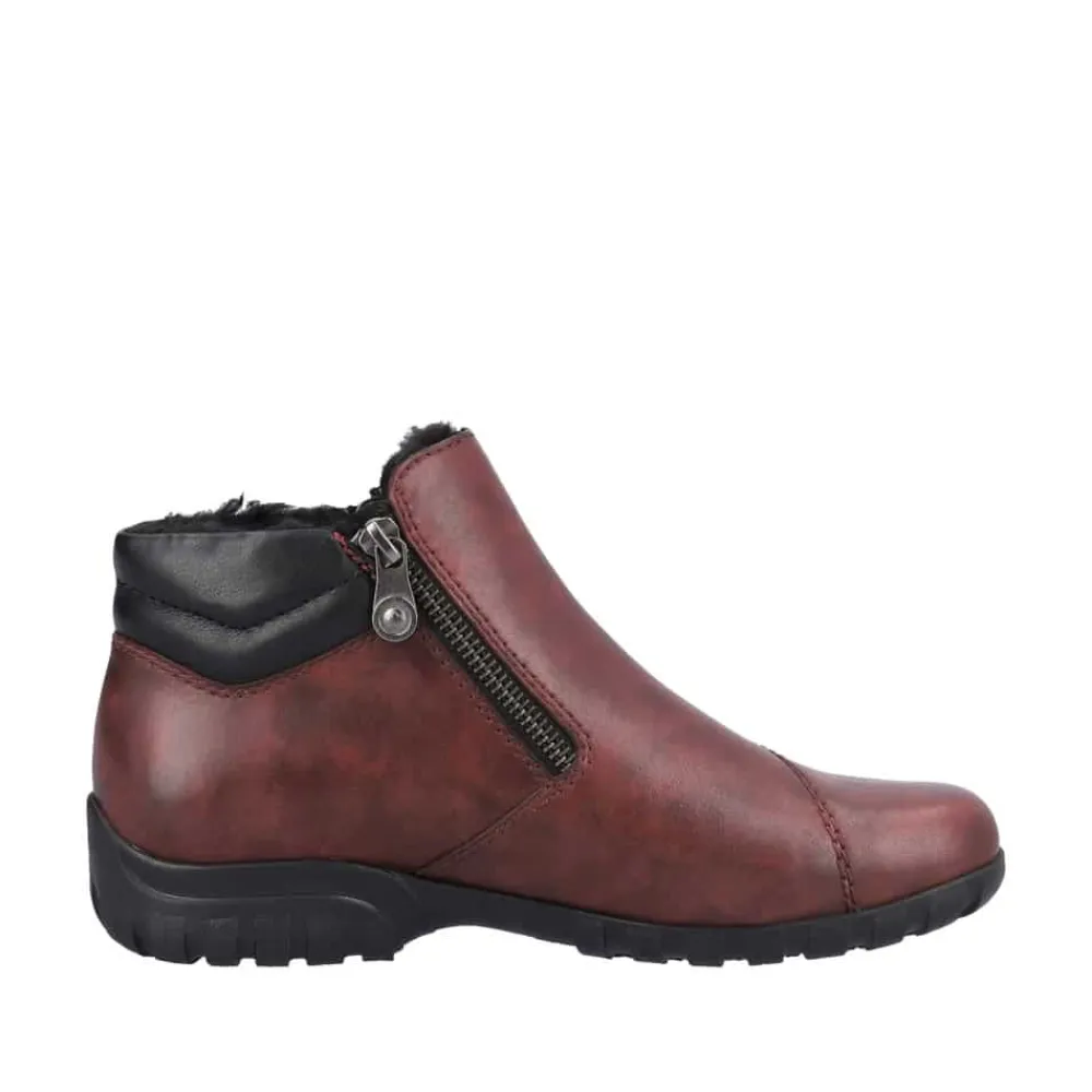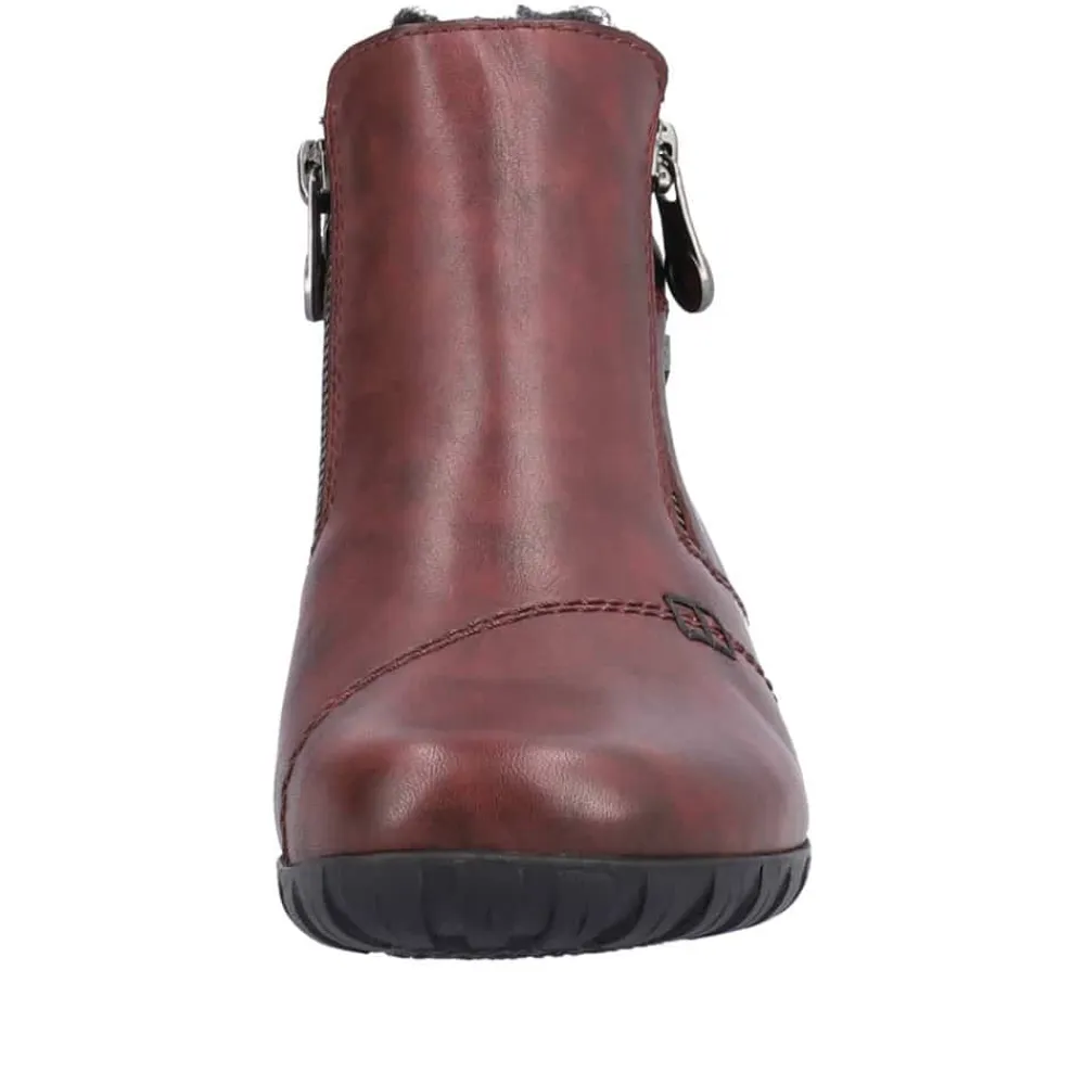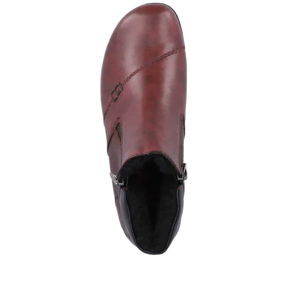 Rieker støvle til dame i bordeaux. Flot støvle i bordeaux skind med fine detaljer, der giver et stilfuldt udtryk. Modellen har to funktionelle lynlåse, som gør den nem at tage af og på. Indvendigt finder du en varm foring samt en blød udtagelig sål, der giver høj komfort hele dagen. Mens Rieker-Tex gør støvlen kraftig vandafvisende, og den mønstrede ydersål øger både stødabsorbering og skridsikkerhed.