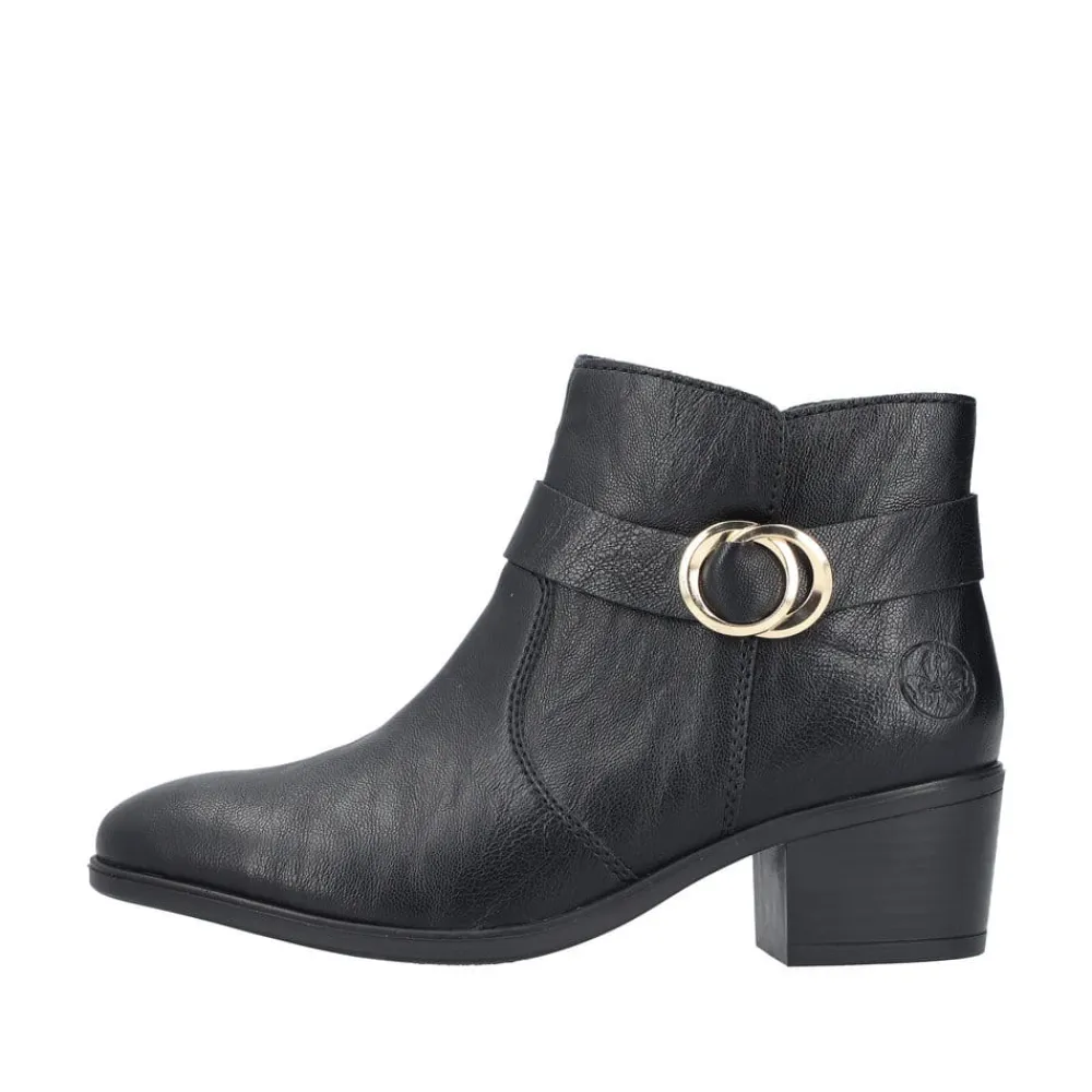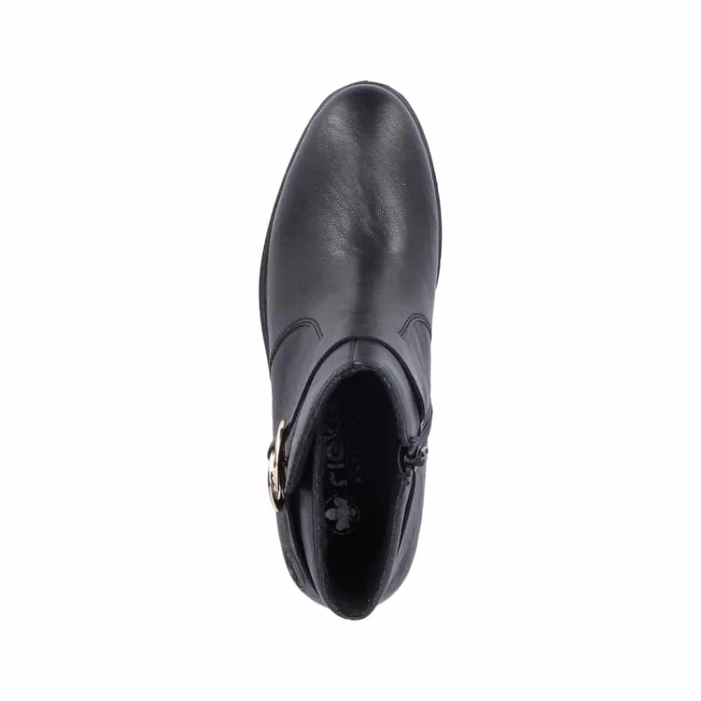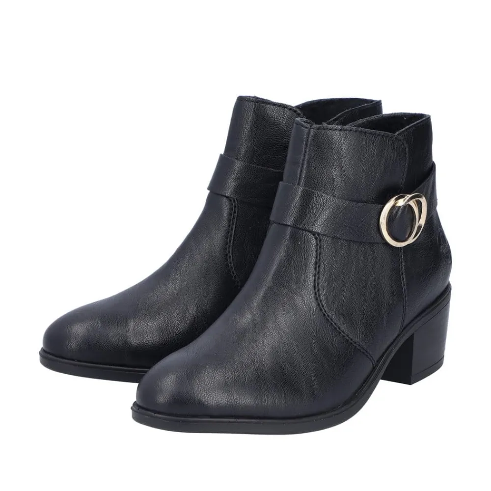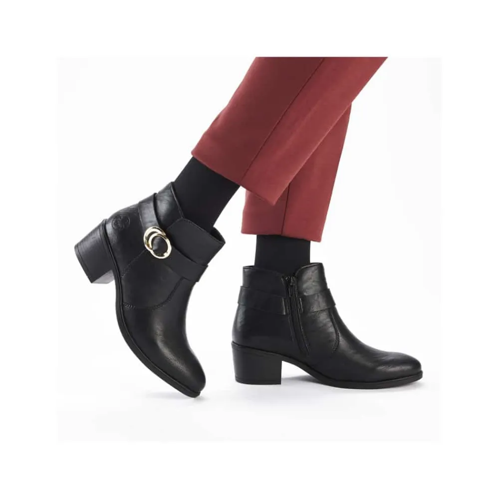 Rieker støvle til dame i sort. Oplev en elegant ankelstøvle, der kombinerer stil og komfort til perfektion. Modellen har en sort overdel med dekorative syninger og et smukt spænde omkring anklen, som tilføjer et stilfuldt udtryk. Indvendigt sikrer en blød indersål og en let foring, at støvlen føles behagelig hele dagen. Med Rieker Antistress er den både let, fleksibel og udstyret med effektiv stødabsorbering, så hvert skridt føles ekstra behageligt. Den 5 cm høje blokhæl giver et elegant løft uden at gå på kompromis med komforten.
