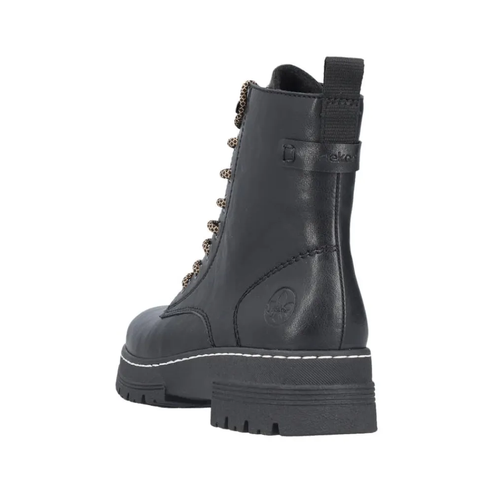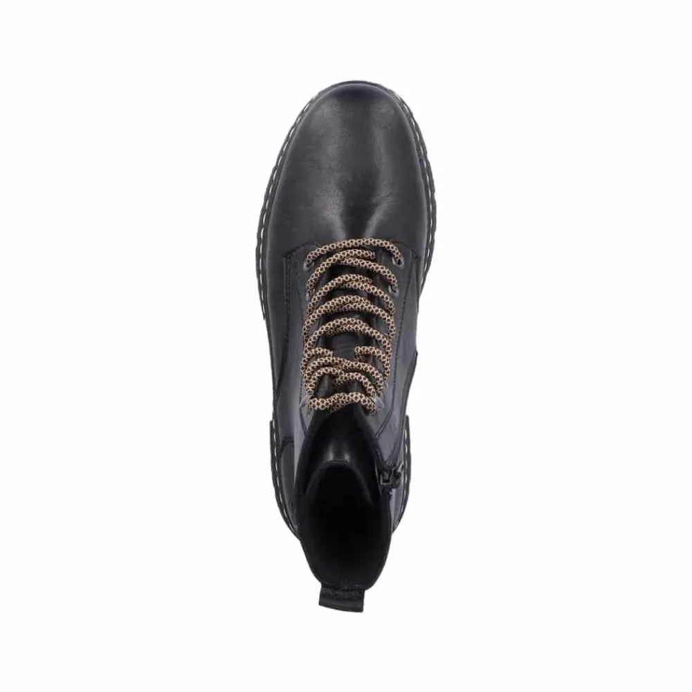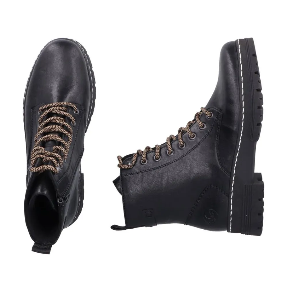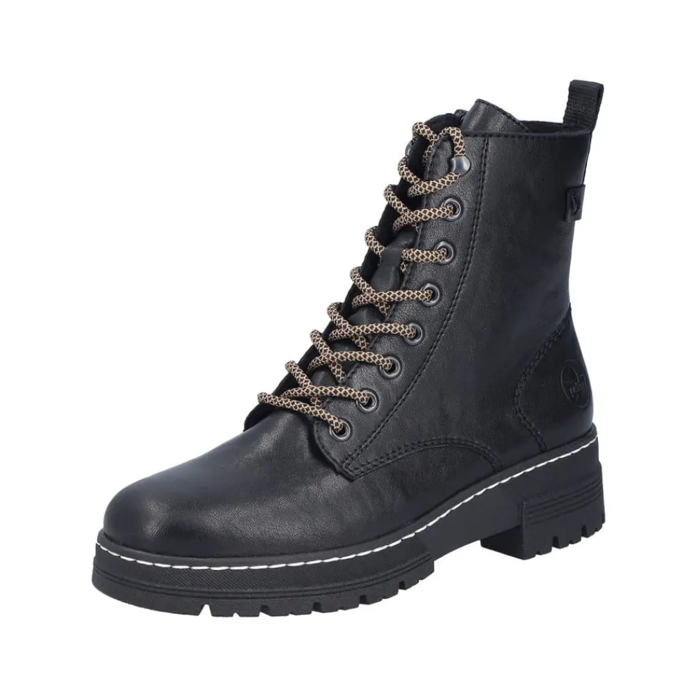 Rieker støvle til dame i sort. Denne smarte sorte støvle er et oplagt valg til hverdagen, hvor komfort og funktion er i fokus. Støvlen har snørebånd samt en funktionel lynlås, der gør det let at komme i og af støvlen og samtidig giver mulighed for at tilpasse pasformen. Indvendigt mødes du af en blød og udtagelig sål samt en let foring, som giver behagelig komfort hele dagen. Den chunky ydersål med en blokhæl på 2 cm giver et flot løft, mens mønsteret giver øget stødabsorbering og skridsikkerhed.