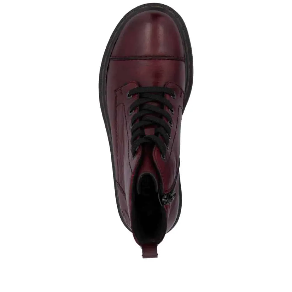 Rieker støvle til dame i bordeaux. En elegant støvle i moderne bordeaux med et enkelt, men stilfuldt look. Støvlen er fremstillet i blødt skind og udstyret med snørebånd foran samt en praktisk lynlås på indersiden, så pasformen kan tilpasses og den er nem at tage af og på. Indvendigt oplever du en behagelig kombination af en blød indersål og en let foring, der giver varme og komfort. Den fleksible ydersål er designet med stødabsorbering og et solidt mønster, som giver øget støtte og sikkerhed i hverdagen.
