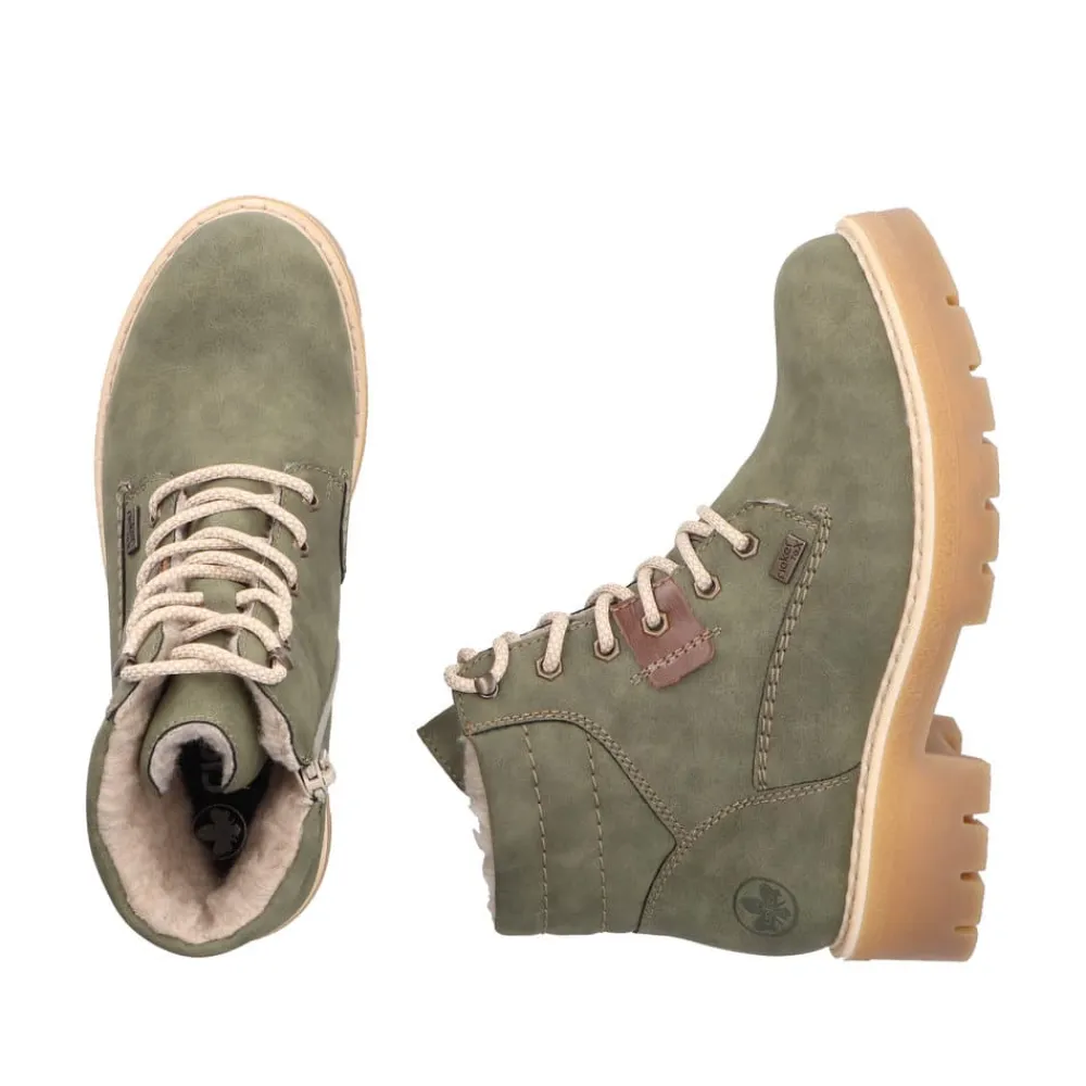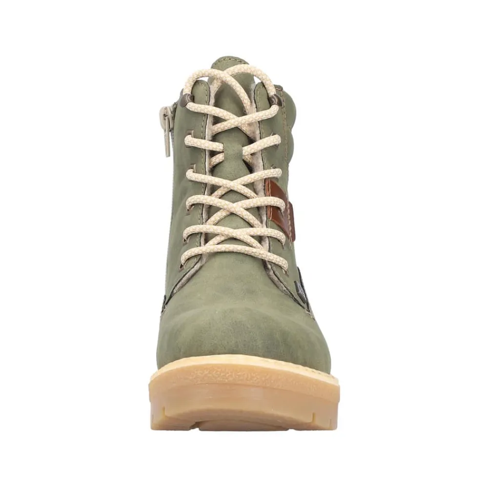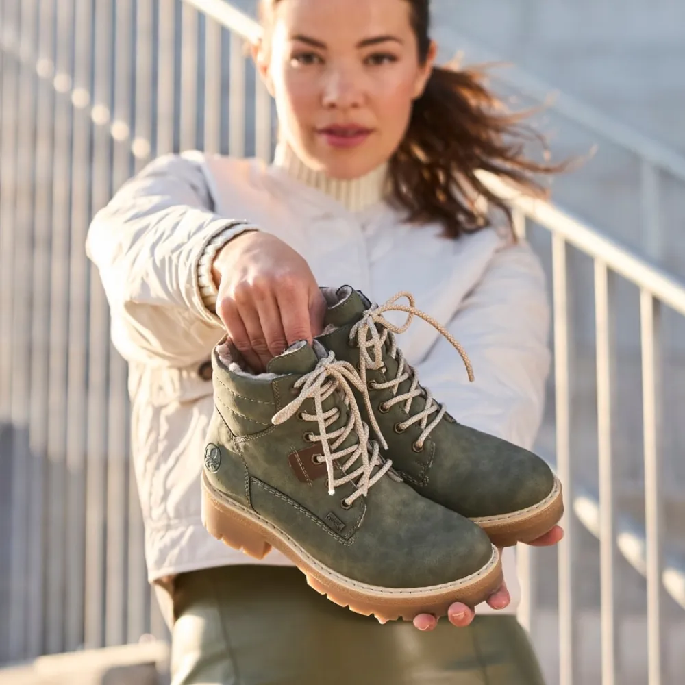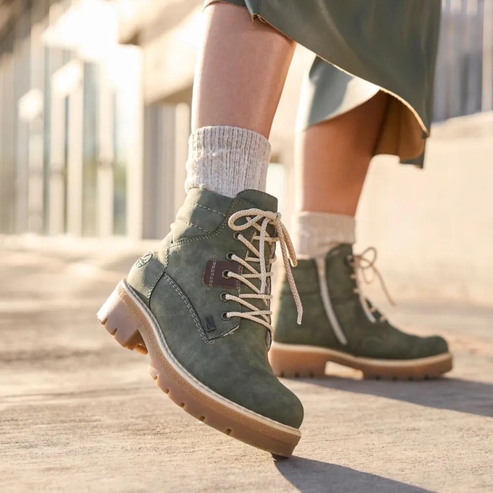 Rieker støvle til dame i grøn. Smart støvle i en moderne grøn farve med fine detaljer, der giver et stilfuldt look. Støvlen har snørebånd foran, så pasformen nemt kan justeres, og en funktionel lynlås på indersiden, der gør den let at komme i og af. Indvendigt mødes du af en varm foring samt en blød og udtagelig indersål, som giver optimal komfort dagen lang. Støvlen er udstyret med Rieker-Tex, der giver kraftig vandafvisning, mens Rieker Antistress sikrer en let og fleksibel pasform. Ydersålen har stødabsorbering og et godt mønster for god skridsikkerhed, og blokhælen på ca. 4,5 cm giver både støtte og et elegant løft.
