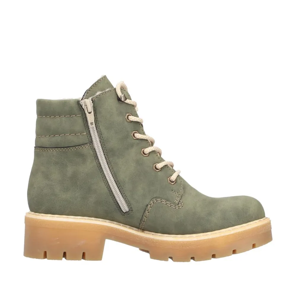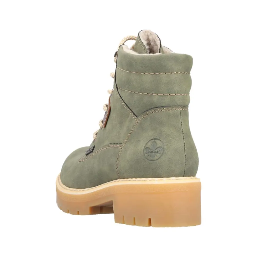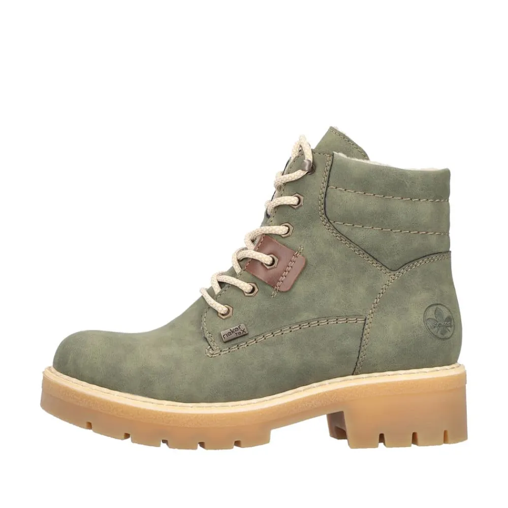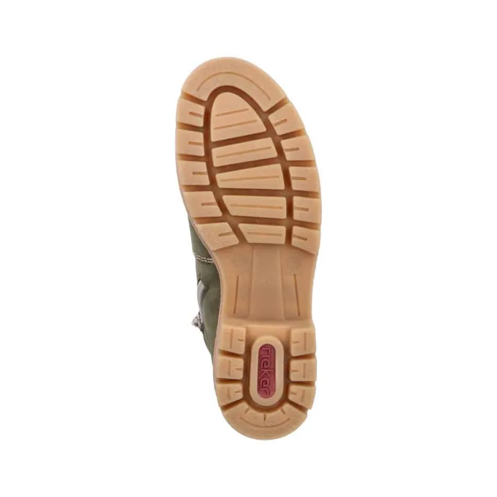 Rieker støvle til dame i grøn. Smart støvle i en moderne grøn farve med fine detaljer, der giver et stilfuldt look. Støvlen har snørebånd foran, så pasformen nemt kan justeres, og en funktionel lynlås på indersiden, der gør den let at komme i og af. Indvendigt mødes du af en varm foring samt en blød og udtagelig indersål, som giver optimal komfort dagen lang. Støvlen er udstyret med Rieker-Tex, der giver kraftig vandafvisning, mens Rieker Antistress sikrer en let og fleksibel pasform. Ydersålen har stødabsorbering og et godt mønster for god skridsikkerhed, og blokhælen på ca. 4,5 cm giver både støtte og et elegant løft.