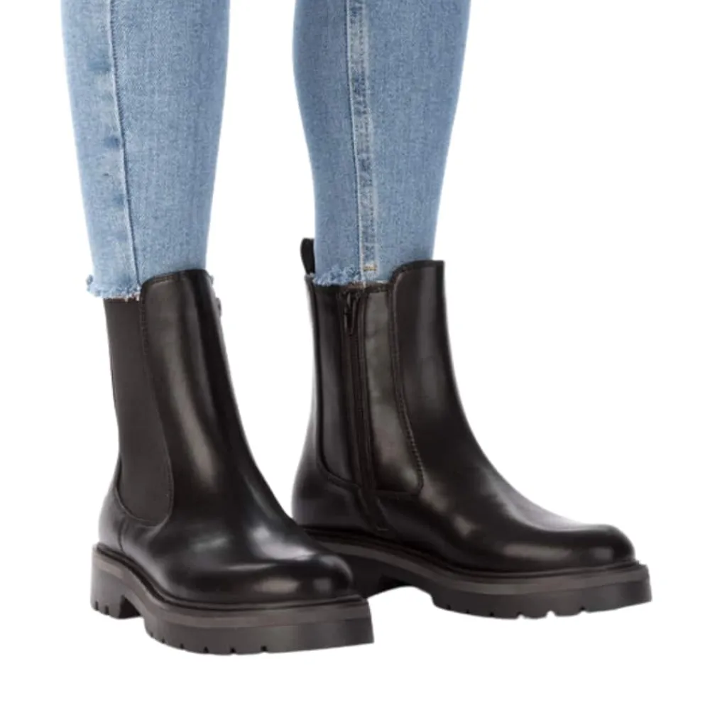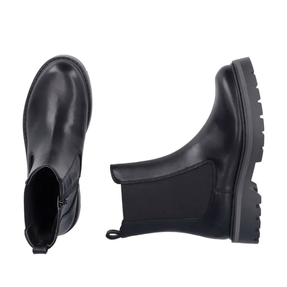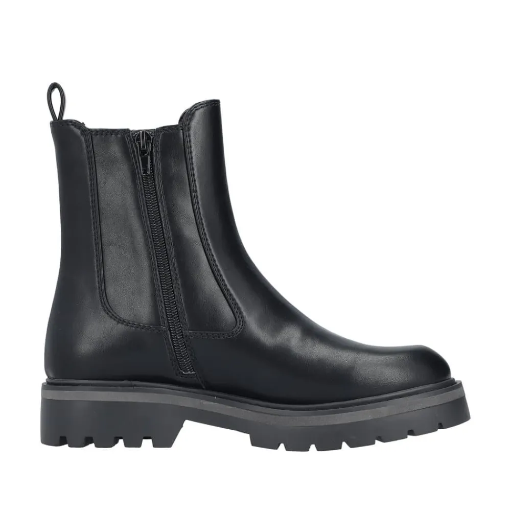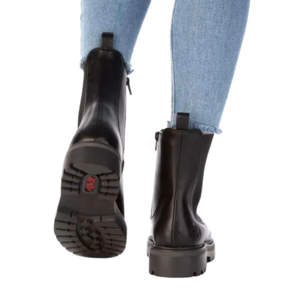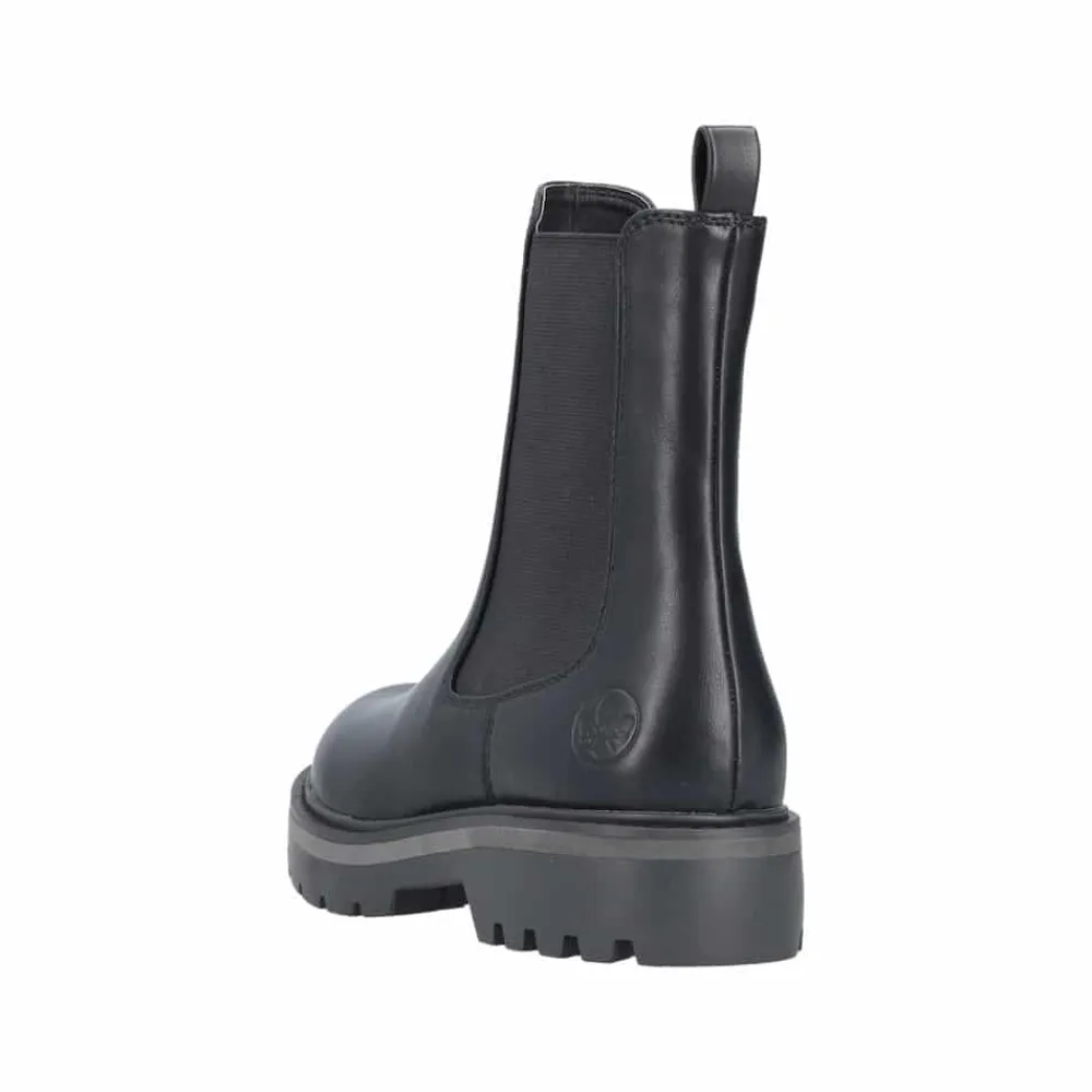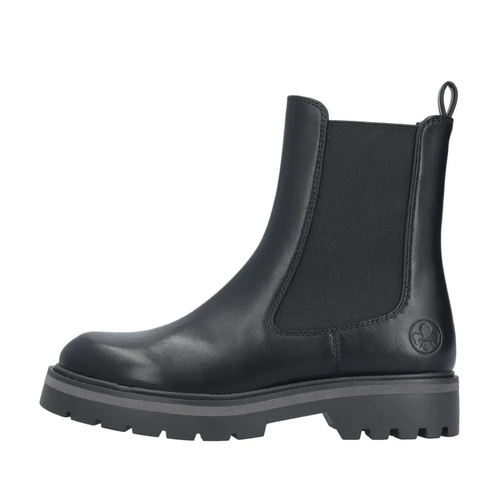 Rieker støvle til dame i sort. Smart vinterstøvle i sort med klassiske detaljer, der giver et stilfuldt look. Støvlen har en funktionel lynlås på indersiden, som gør den nem at tage af og på, samt en elastik på ydersiden, der sikrer en god og fleksibel pasform. Indvendigt finder du en varm foring og en blød indersål, som giver optimal komfort dagen igennem. Den chunky ydersål med mønster og stødabsorbering giver god støtte og øget skridsikkerhed.
