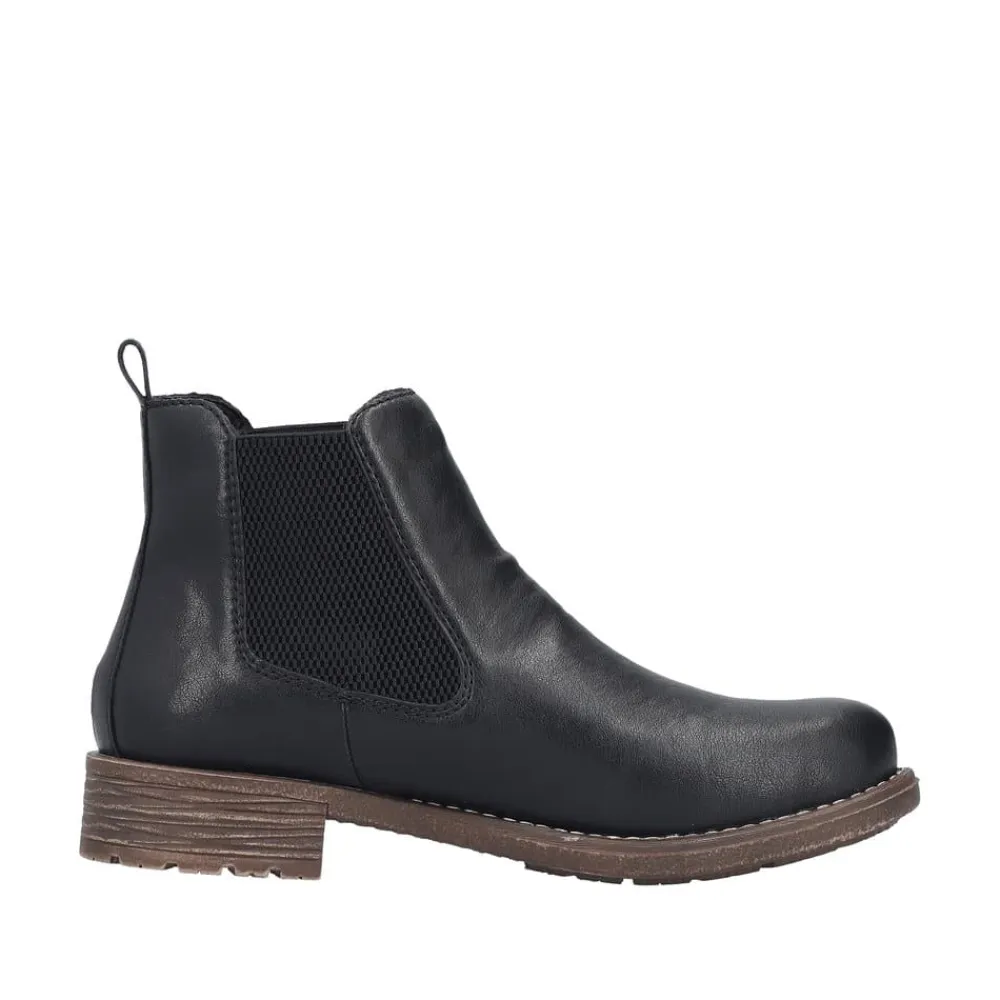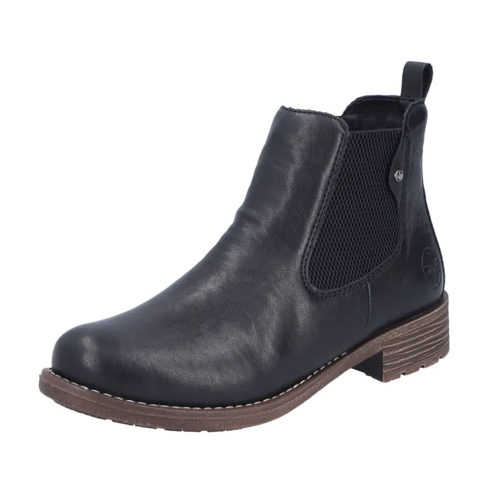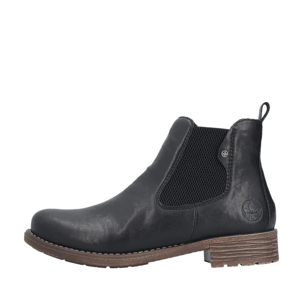 Rieker støvle til dame i sort. Klassisk sort chelseastøvle med elastik i begge sider, som gør den nem at tage af og på. De enkle detaljer giver støvlen et tidløst og stilfuldt udtryk. Indvendigt sørger den varme foring og den bløde, udtagelige indersål for behagelig komfort hele dagen. Den lille blokhæl på ca. 3 cm giver et elegant løft, mens de stødabsorberende egenskaber sikrer ekstra komfort ved hvert skridt.
