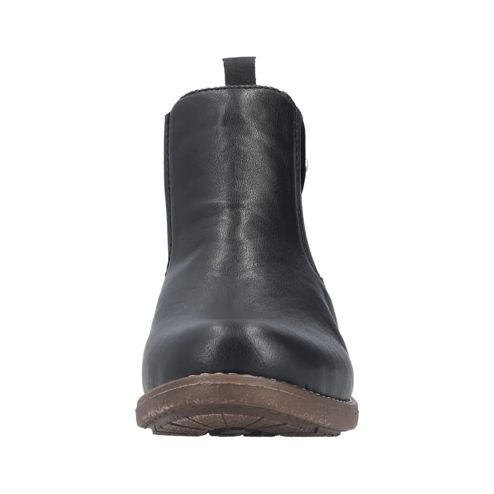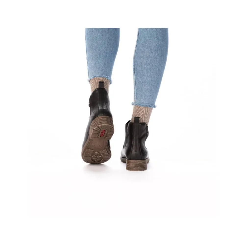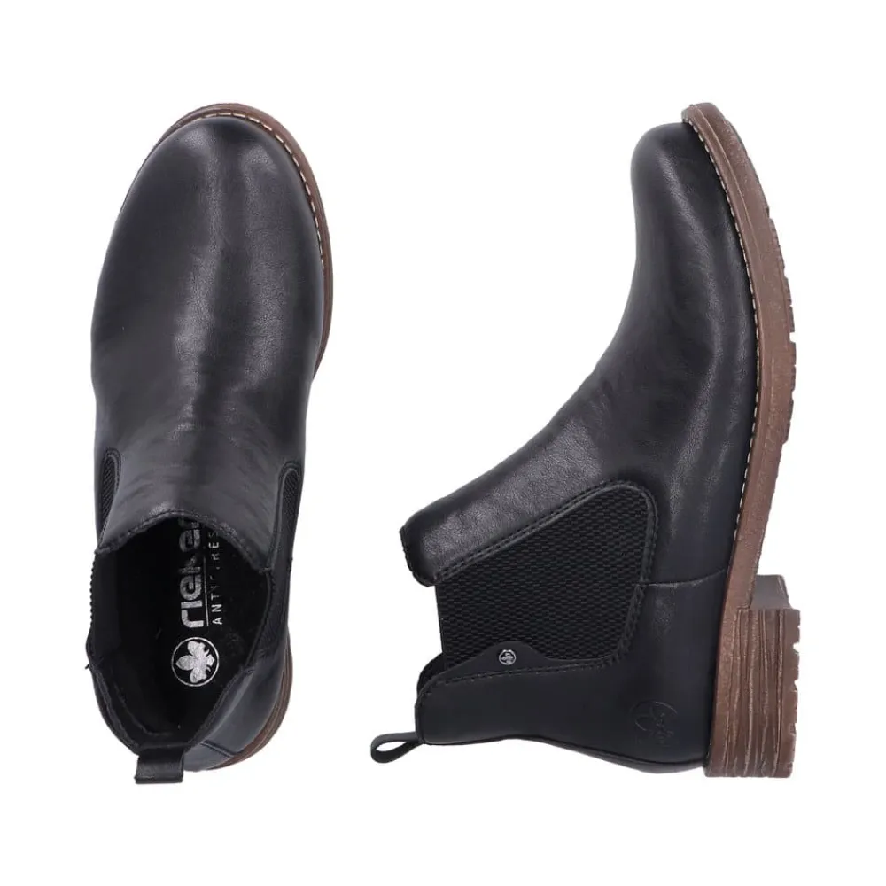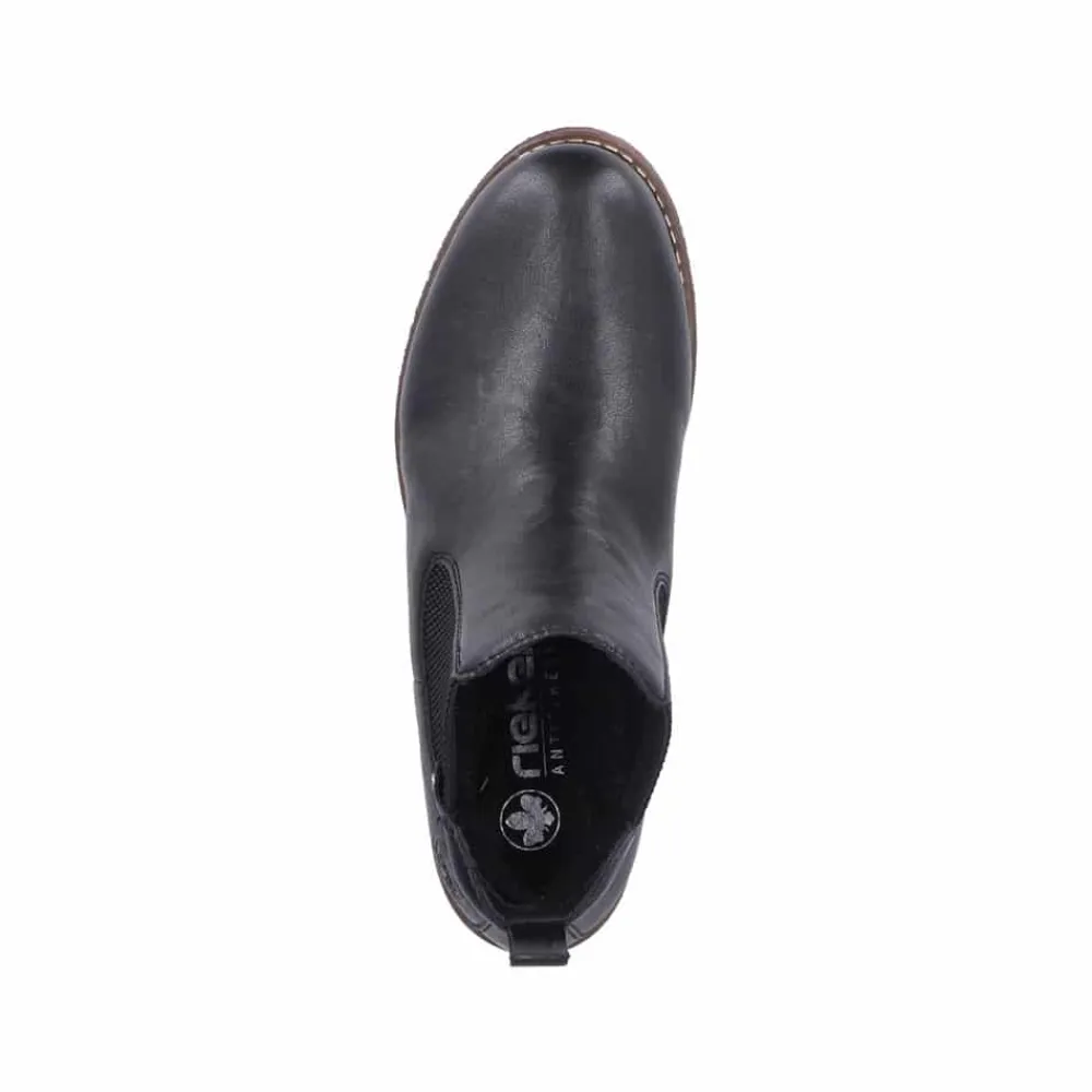 Rieker støvle til dame i sort. Klassisk sort chelseastøvle med elastik i begge sider, som gør den nem at tage af og på. De enkle detaljer giver støvlen et tidløst og stilfuldt udtryk. Indvendigt sørger den varme foring og den bløde, udtagelige indersål for behagelig komfort hele dagen. Den lille blokhæl på ca. 3 cm giver et elegant løft, mens de stødabsorberende egenskaber sikrer ekstra komfort ved hvert skridt.