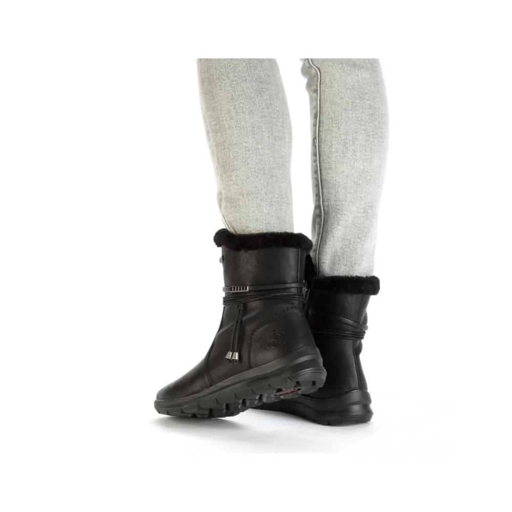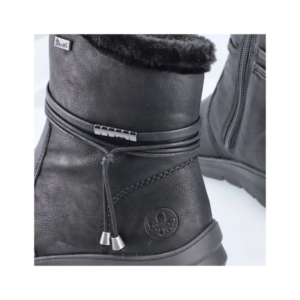 Rieker støvle til dame i sort. Stil og komfort mødes i disse sorte ankelstøvler til kvinder. Lynlåsen gør det nemt og hurtigt at tage støvlerne af og på, mens den pelsbeklædte kant giver et elegant touch. Indvendigt finder du en blød og udtagelig indersål samt en varm foring, der holder fødderne behageligt lune. Med Rieker Tex får du kraftig vandafvisning, og den stødabsorberende ydersål med et godt mønster giver øget støtte og skridsikkerhed.