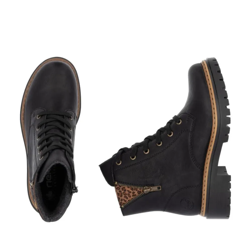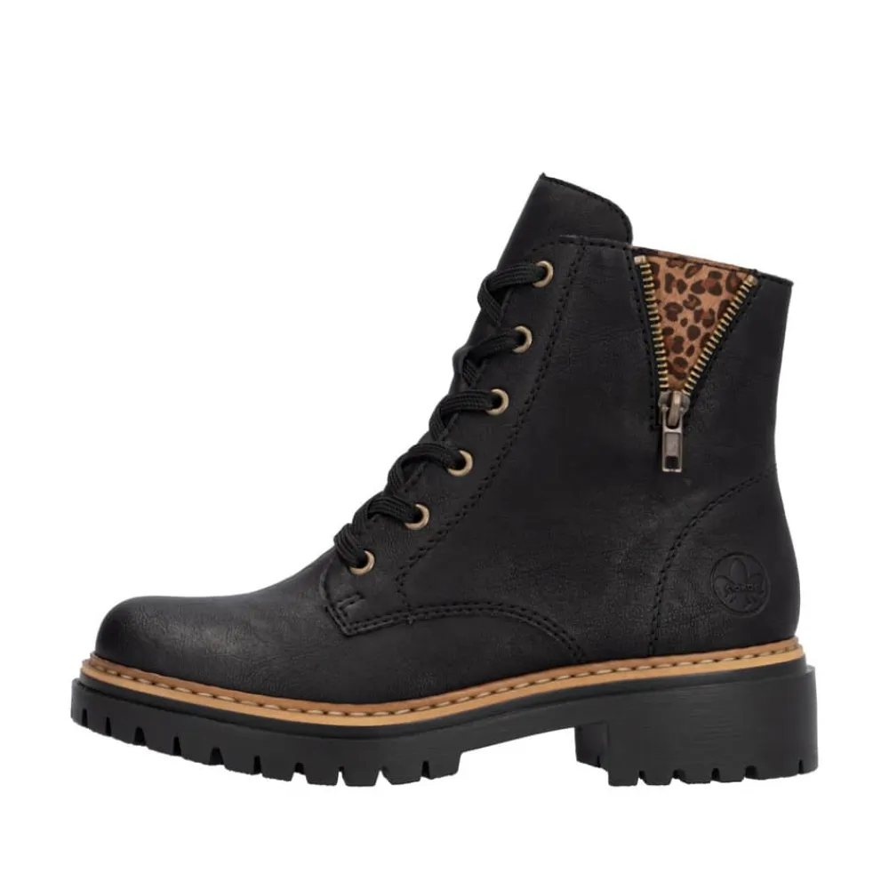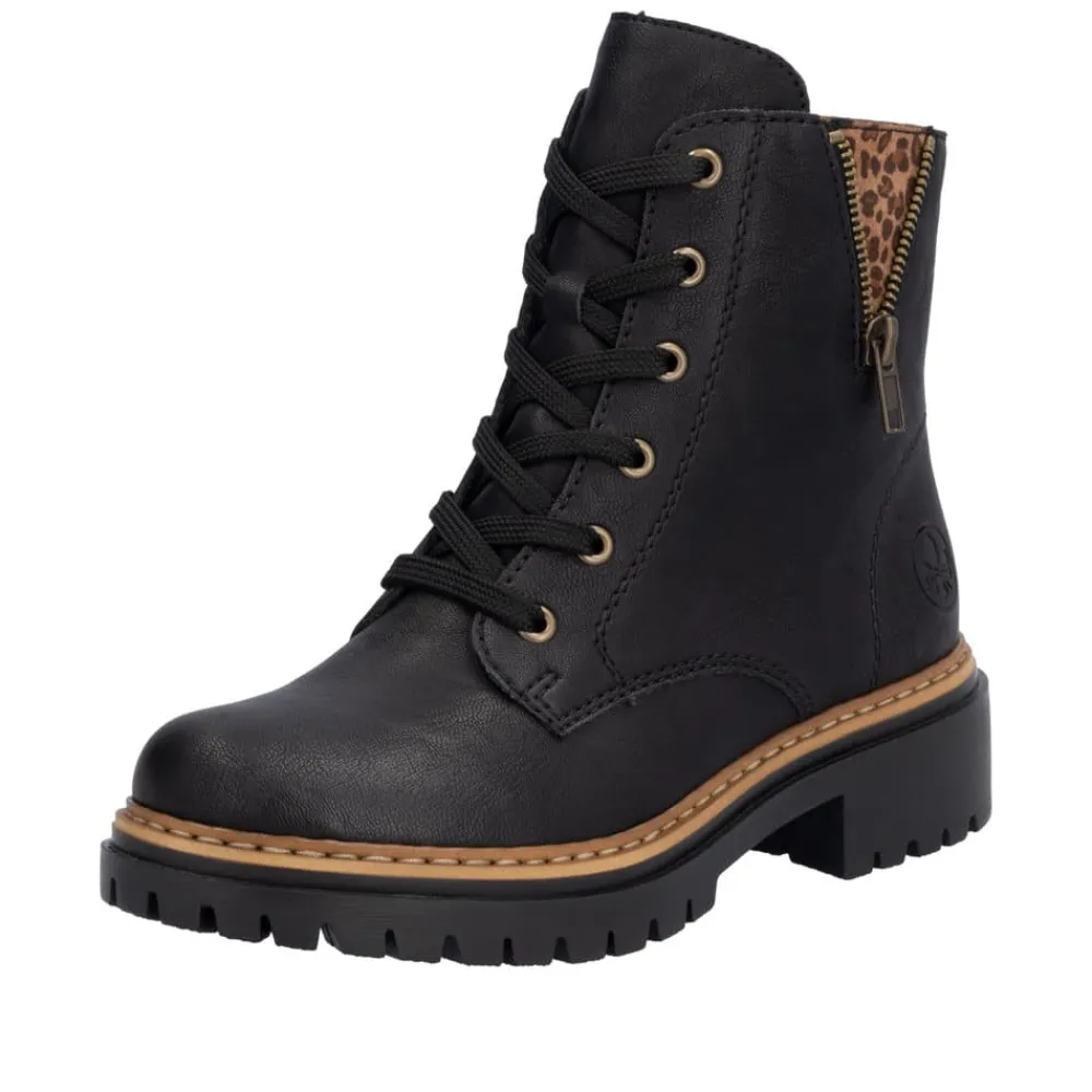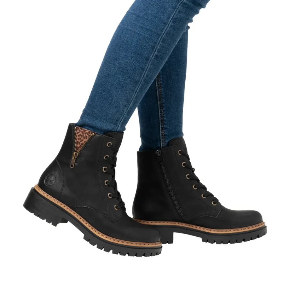 Rieker støvle til dame i sort. Moderne støvle i klassisk sort med flotte leoparddetaljer og pynte lynlås på siden, der giver et ekstra strejf af stil. Støvlen har snørebånd og en funktionel lynlås på indersiden, som gør det nemt at tage den af og på. Indvendigt finder du en let foring, der holder fødderne varme, og en blød indersål, som giver komfort hele dagen. Med en blokhæl på ca 4,5 cm bliver du løftet elegant uden at gå på kompromis med komforten. Ydersålen er mønstret og udstyret med stødabsorbering for øget støtte og skridsikkerhed.