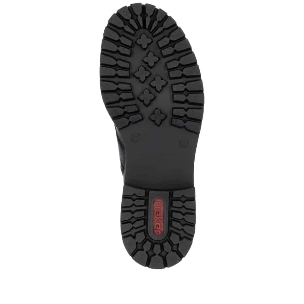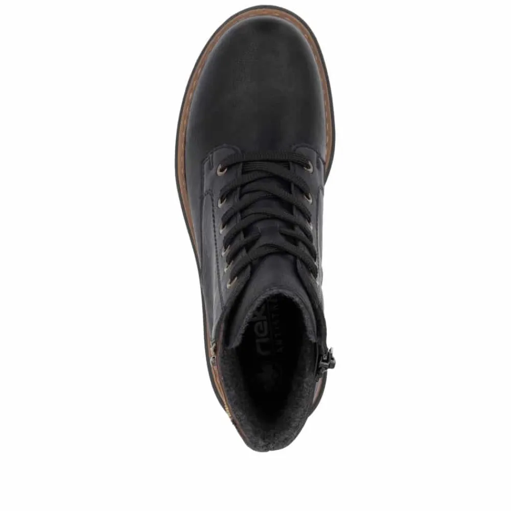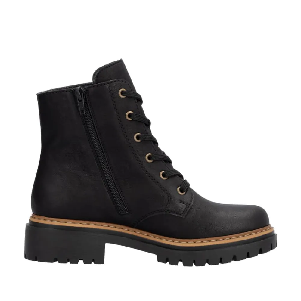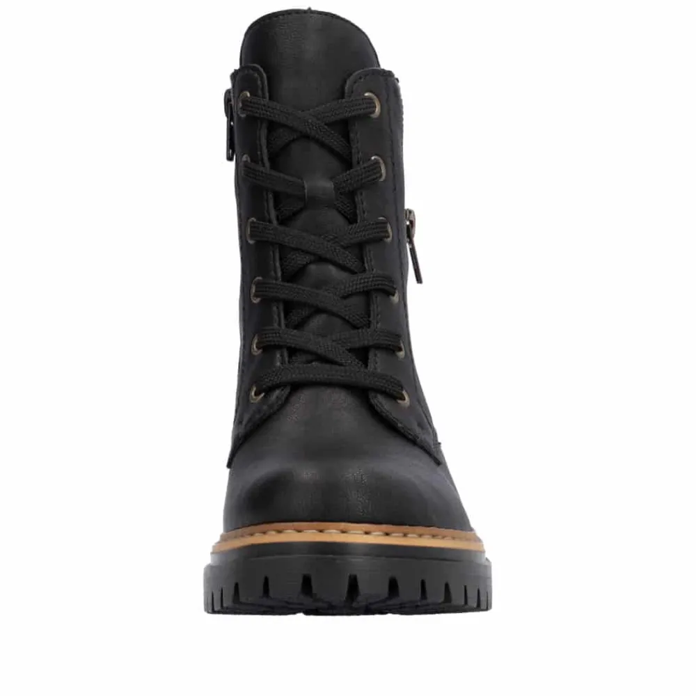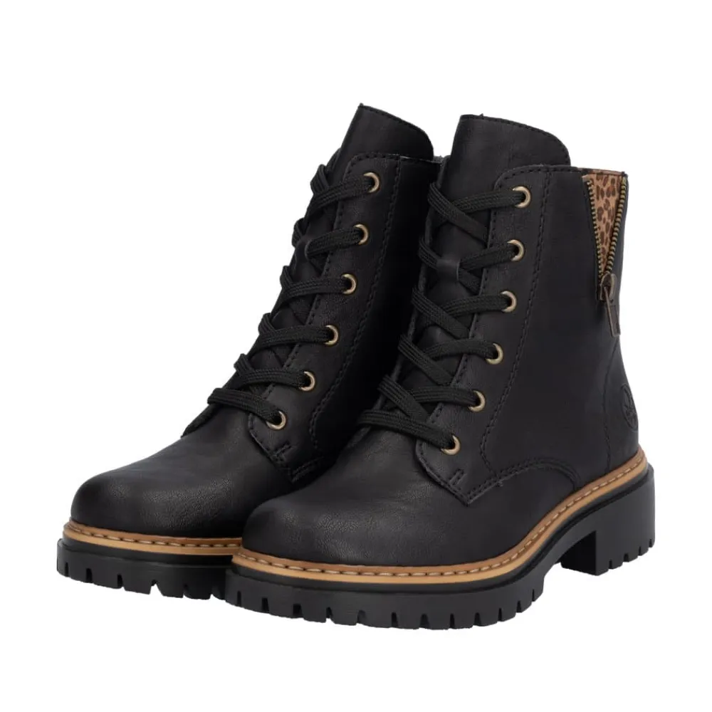 Rieker støvle til dame i sort. Moderne støvle i klassisk sort med flotte leoparddetaljer og pynte lynlås på siden, der giver et ekstra strejf af stil. Støvlen har snørebånd og en funktionel lynlås på indersiden, som gør det nemt at tage den af og på. Indvendigt finder du en let foring, der holder fødderne varme, og en blød indersål, som giver komfort hele dagen. Med en blokhæl på ca 4,5 cm bliver du løftet elegant uden at gå på kompromis med komforten. Ydersålen er mønstret og udstyret med stødabsorbering for øget støtte og skridsikkerhed.