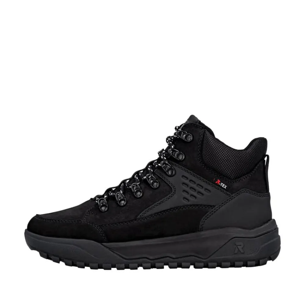 Rieker støvle til herre i sort. Denne støvle kombinerer design og komfort på bedste vis. Den har snørebånd og en funktionel lynlås, så du nemt kan tilpasse pasformen til din fod. Indvendigt finder du en blød Rieker-soft sål og en varm foring, der sikrer behagelig komfort hele dagen. Den ekstra bredde (G) giver mere rummelighed, mens Rieker-Tex gør støvlen kraftigt vandafvisende. Ydersålen med mønster giver øget stødabsorbering og god skridsikkerhed.