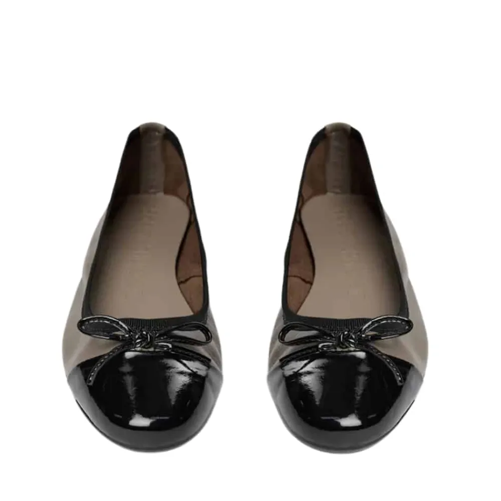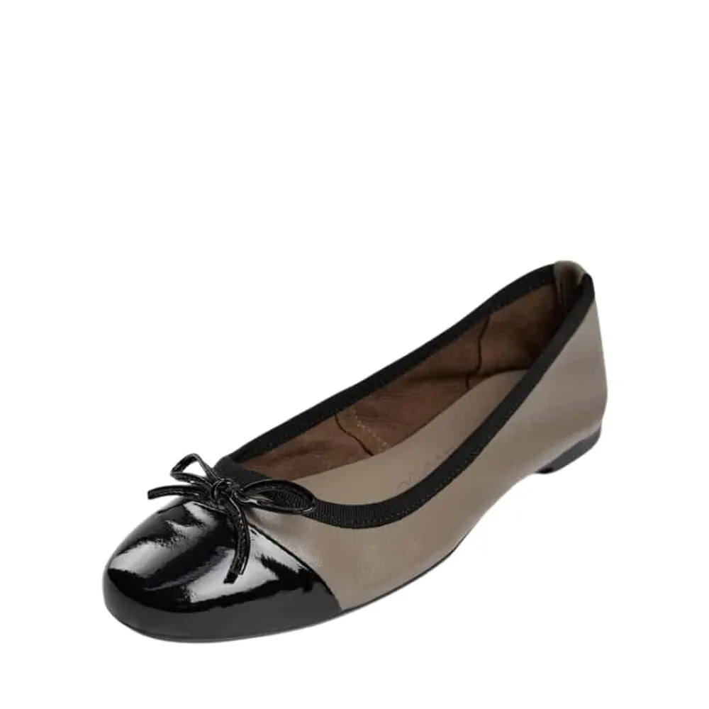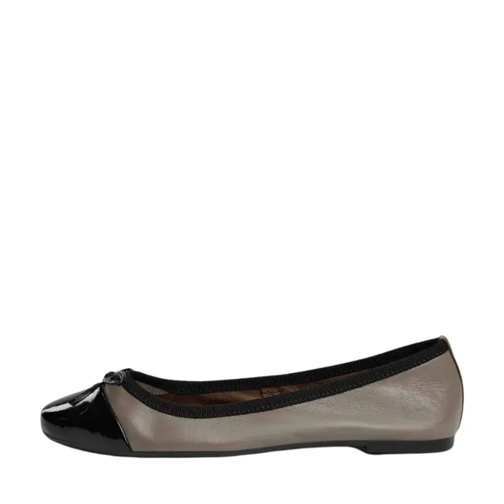 Sofie Schnoor ballerinasko til dame i mørk sand. Fuldend din garderobe med disse smukke ballerina sko fra Sofie Schnoor. Den sandfarvede læderoverdel og den laklakerede snude giver et stilfuldt udtryk, mens sløjfen på forfoden tilføjer et sødt element. Gummisålen med rillet mønster gør, at du står godt fast hele dagen, og skoene er almindelige i størrelsen for en perfekt pasform.