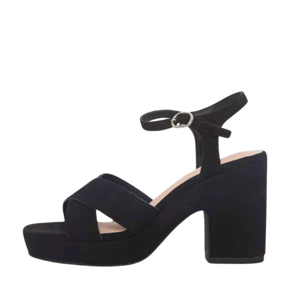 Duffy Malvizzo Uno sandal til dame i sort. Stilfuld sandal i et sort klassisk og tidsløst design, fremstillet af imiteret ruskind. Sandalen er løftet med en plateausål, mens sandalens blokhæl måler ca 6,5 cm. Desuden har sandalen flotte detaljer i form af krydsremme foran samt en justerbar ankelrem.