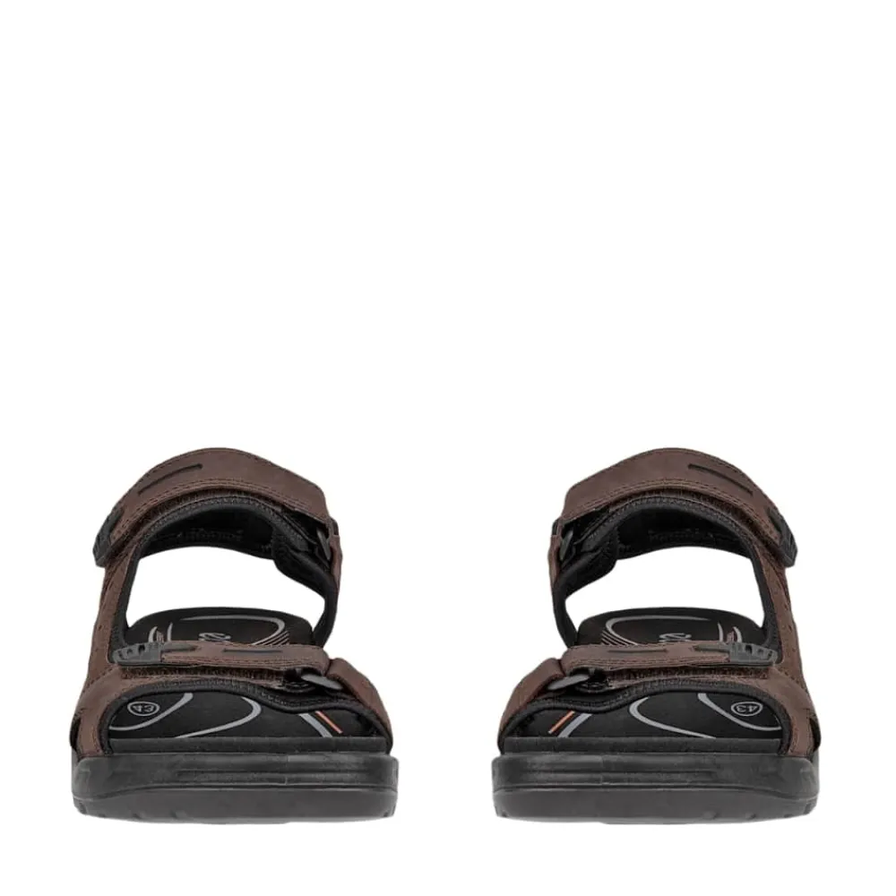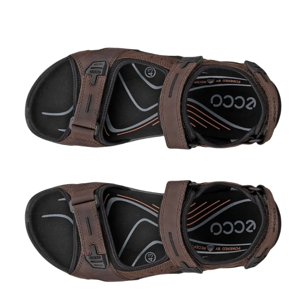 Ecco Offroad sandal til herre i brun. Denne moderne sandal er designet med fokus på komfort og funktionalitet. Den har tre justerbare velcroremme, som gør det nemt at tilpasse din pasform. Sandalen har en formstøbt EVA-fodseng med Fluidform™ teknologi samt mikrofiberbelægning, der giver effektiv stødabsorbering og god stabilitet. Ydersålen er lavet af slidstærkt gummi og har et mønstret design, der øger skridsikkerheden og har et godt greb på varieret terræn.