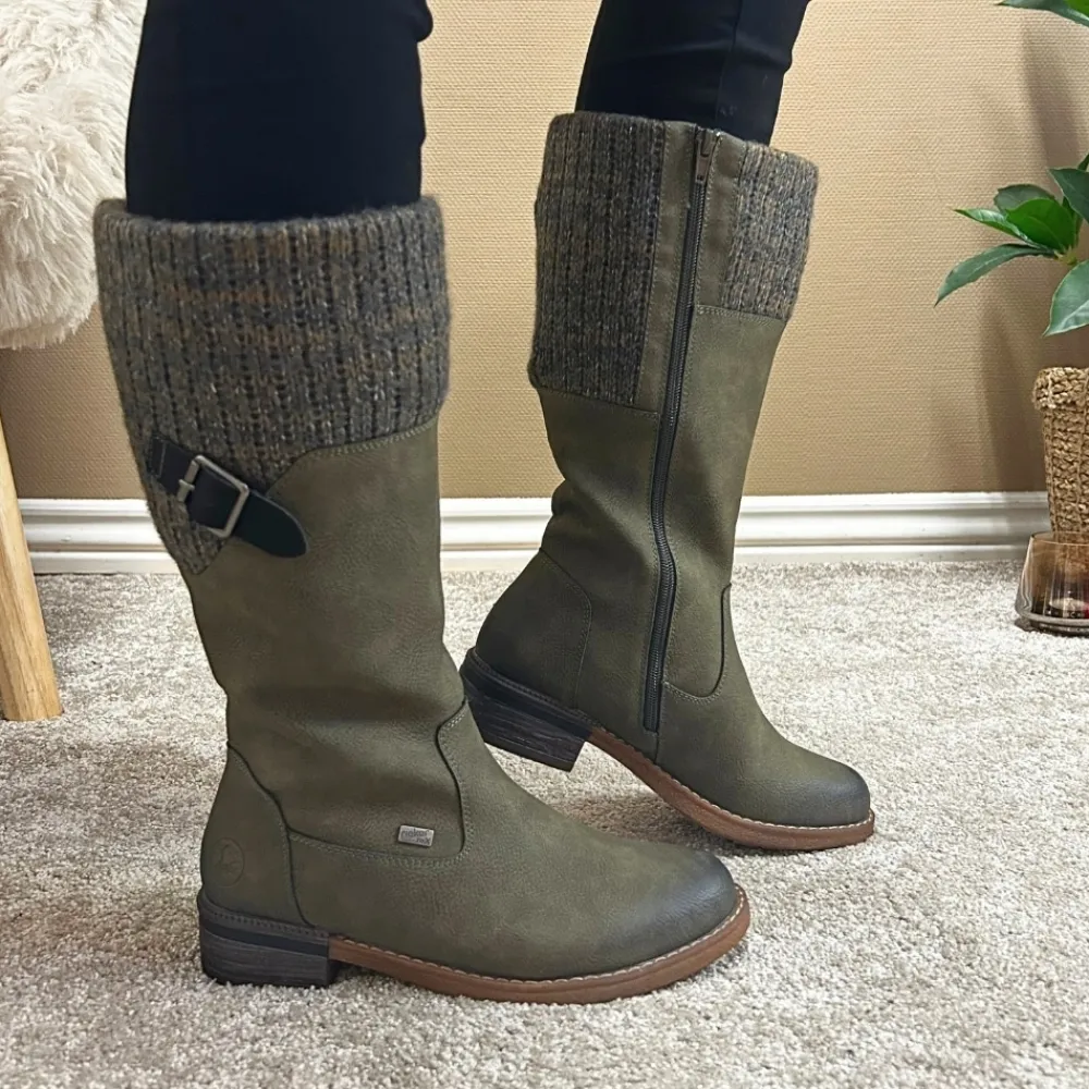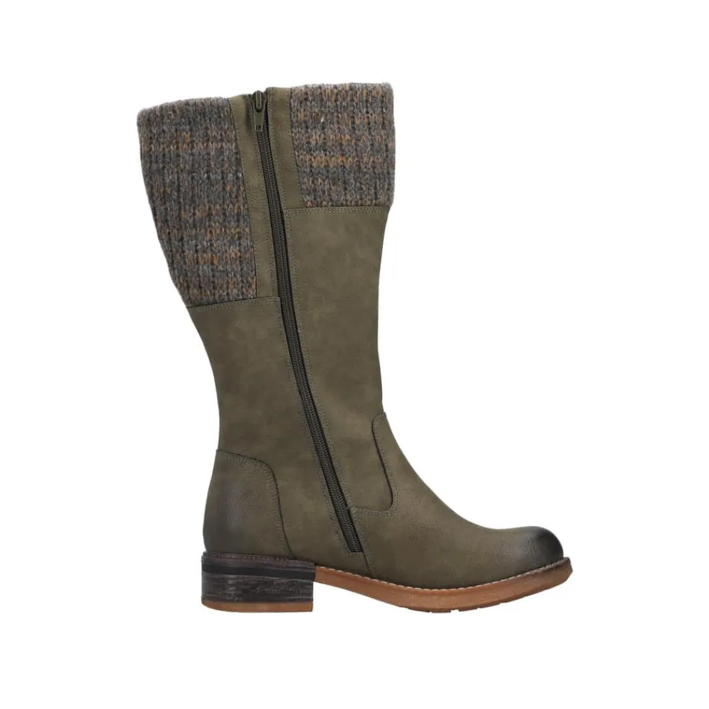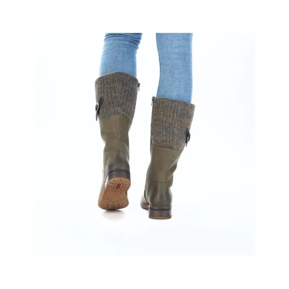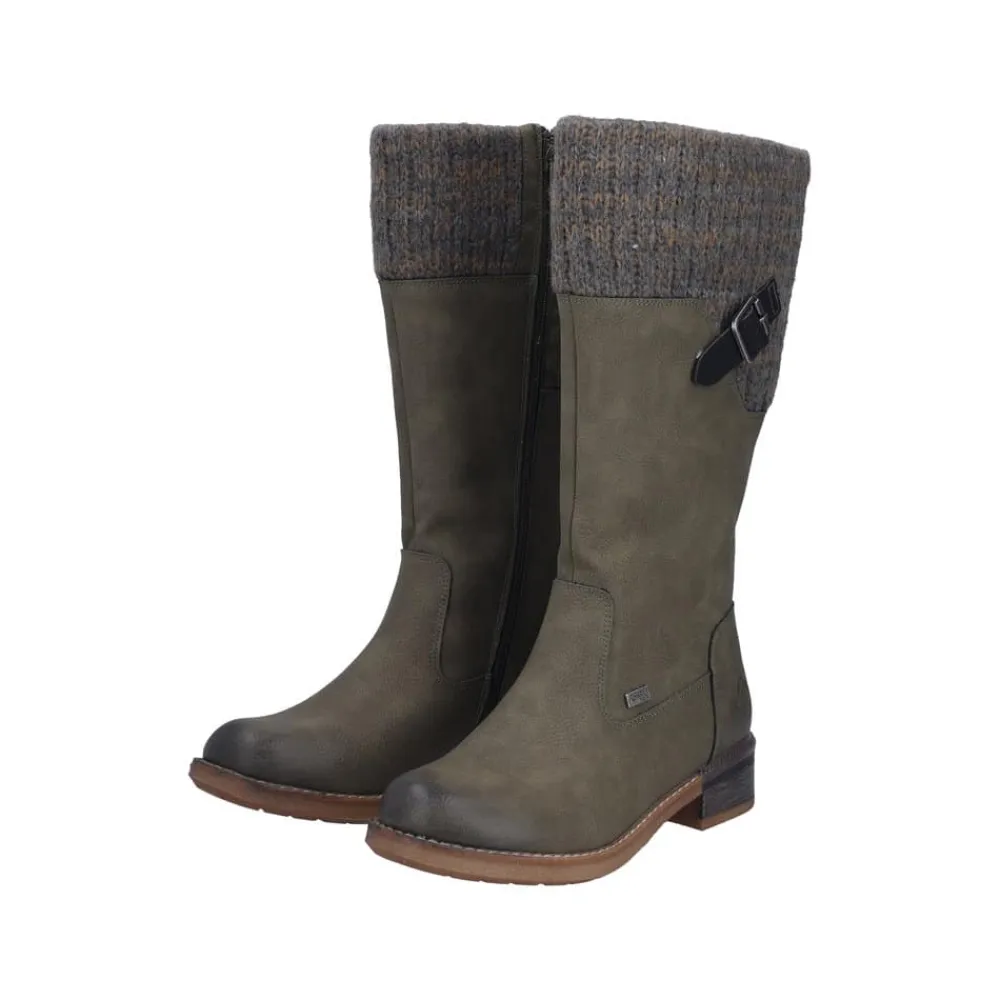 Rieker lang støvle til dame i grøn. Smart vinterstøvle i en moderne grøn farve med flotte detaljer, der giver et stilfuldt udtryk. Støvlen har en strikket krave og en spænde, som tilfører et moderne touch, mens lynlåsen på indersiden gør den nem at tage af og på. Indvendigt finder du en varm foring, der holder fødderne lune, og en blød indersål, som giver komfort hele dagen. Takket være Rieker-Tex er støvlen kraftigt vandafvisende, og den stødabsorberende ydersål med mønster giver god støtte og øget skridsikkerhed.