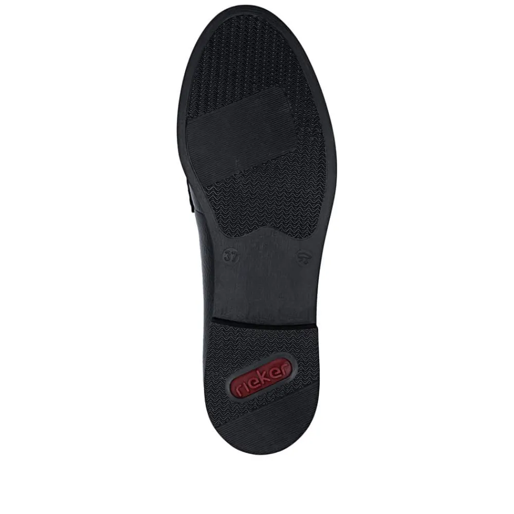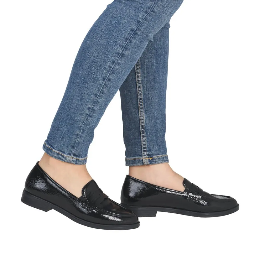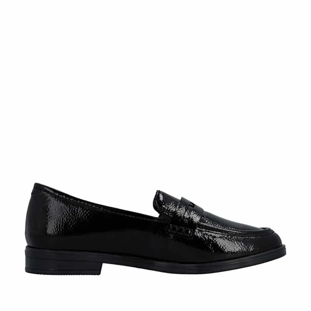 Rieker loafers til dame i sort lak. Denne elegante loafers har en flot lakoverdel og enkle detaljer som giver et pænt og moderne udtryk. Skoen er nem at tage på, da de to elastikker ved åbningen gør det let at komme i skoen og samtidig sikrer en god pasform. Indvendigt er skoen udstyret med en blød skindsål, og sammen med den stødabsorberende ydersål giver det god komfort hele dagen. Ydersålen har et tydeligt mønster som bidrager til stabilitet og øget skridsikkerhed.