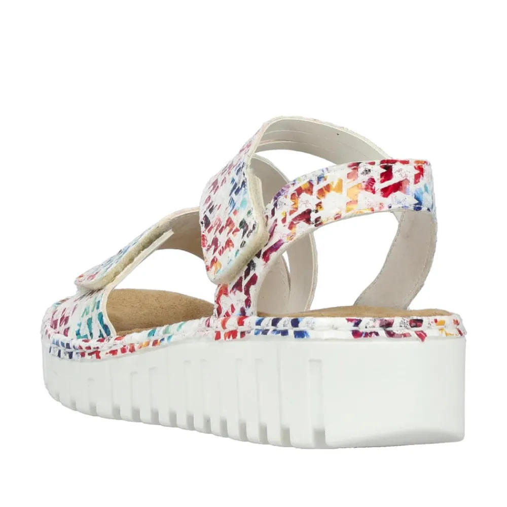 Rieker sandal til dame i hvid. Denne hvide sandal får et livligt og elegant udtryk med de smukke farverige detaljer, der tilfører designet et friskt pust. Velcroremmene gør det nemt at tilpasse pasformen, så sandalen sidder behageligt hele dagen. Den bløde indersål og smalle pasform (E) sikrer komfort, mens kilehælen på ca. 4 cm giver et stilfuldt løft uden at gå på kompromis med komforten. Ydersålen er mønstret og stødabsorberende, hvilket gør sandalen ideel til både hverdag og fritid.