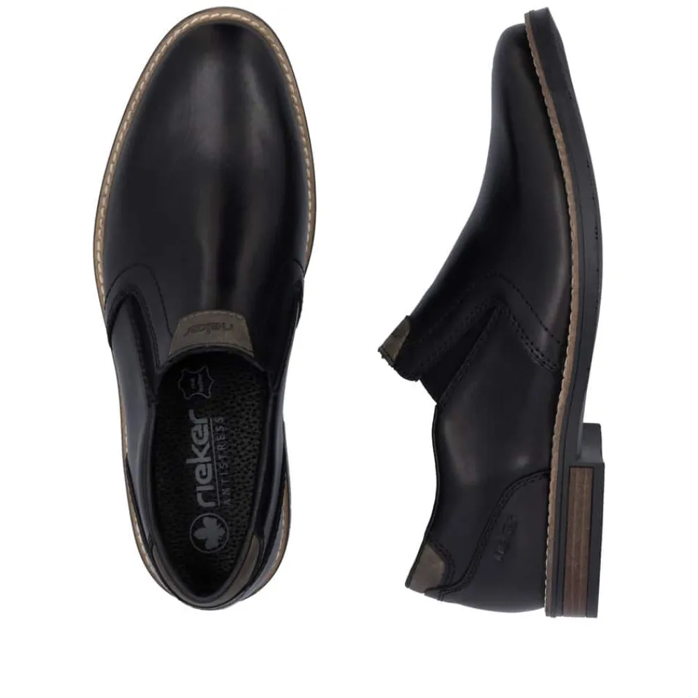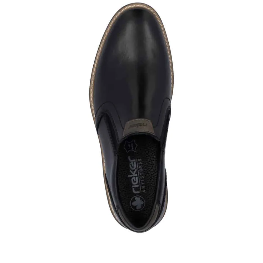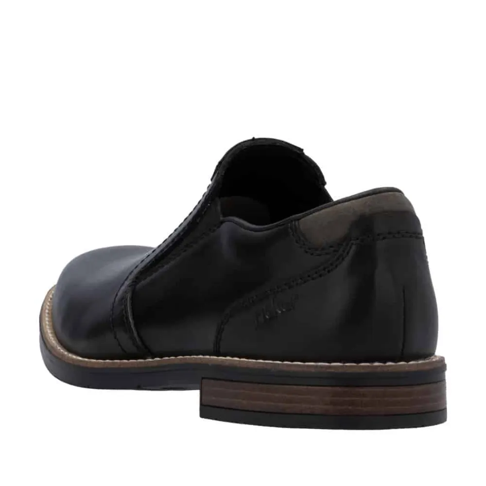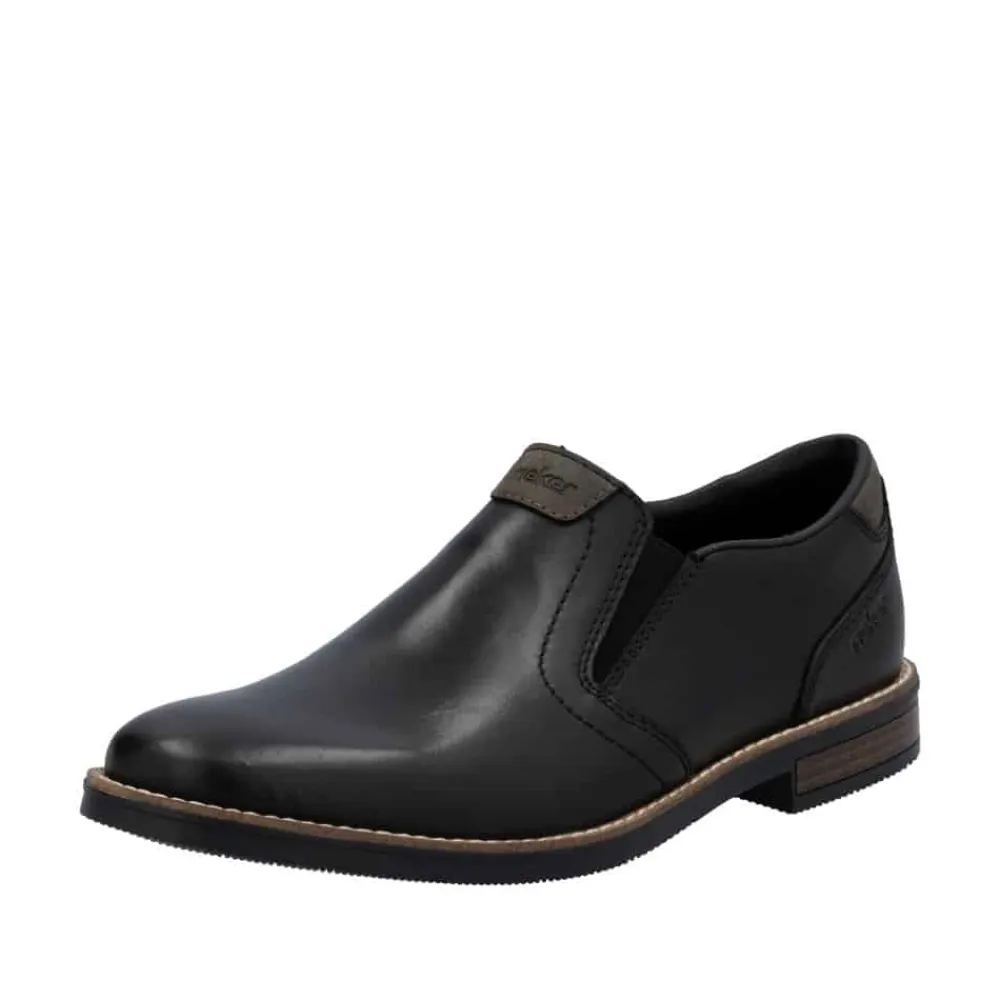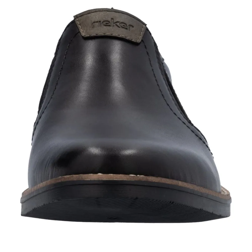 Rieker hyttesko til herre i sort. Denne stilfulde herresko fra Rieker er det ideelle valg til både hverdagsbrug og festlige anledninger. Overdelen i ægte læder giver skoen et eksklusivt look, mens den bløde læderindersål sikrer en komfortabel oplevelse hele dagen. De elastiske paneler i siderne gør det hurtigt og nemt at tage skoene af og på, samtidig med at de giver en fleksibel og tilpasset pasform. Den robuste ydersål i syntetisk materiale sikrer holdbarhed og et godt fodfæste. En klassisk og alsidig sko, der kombinerer elegance og funktionalitet perfekt.
