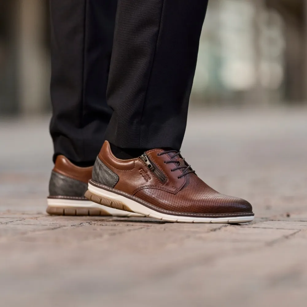 Rieker sko til herre i brun. Stilfulde brune sko i skind, der er designet med fokus på både funktion og komfort. Kombinationen af snørebånd og lynlås gør skoen nem at bruge i hverdagen og sikrer en god pasform. Indvendigt finder du en blød sål, som giver behagelig komfort dagen igennem. Med Rieker Antistress får du en let og fleksibel sko, og den mønstrede ydersål giver øget stødabsorbering og skridsikkerhed.