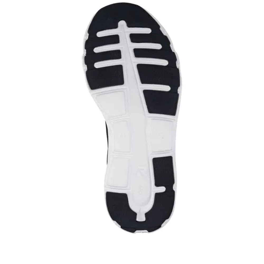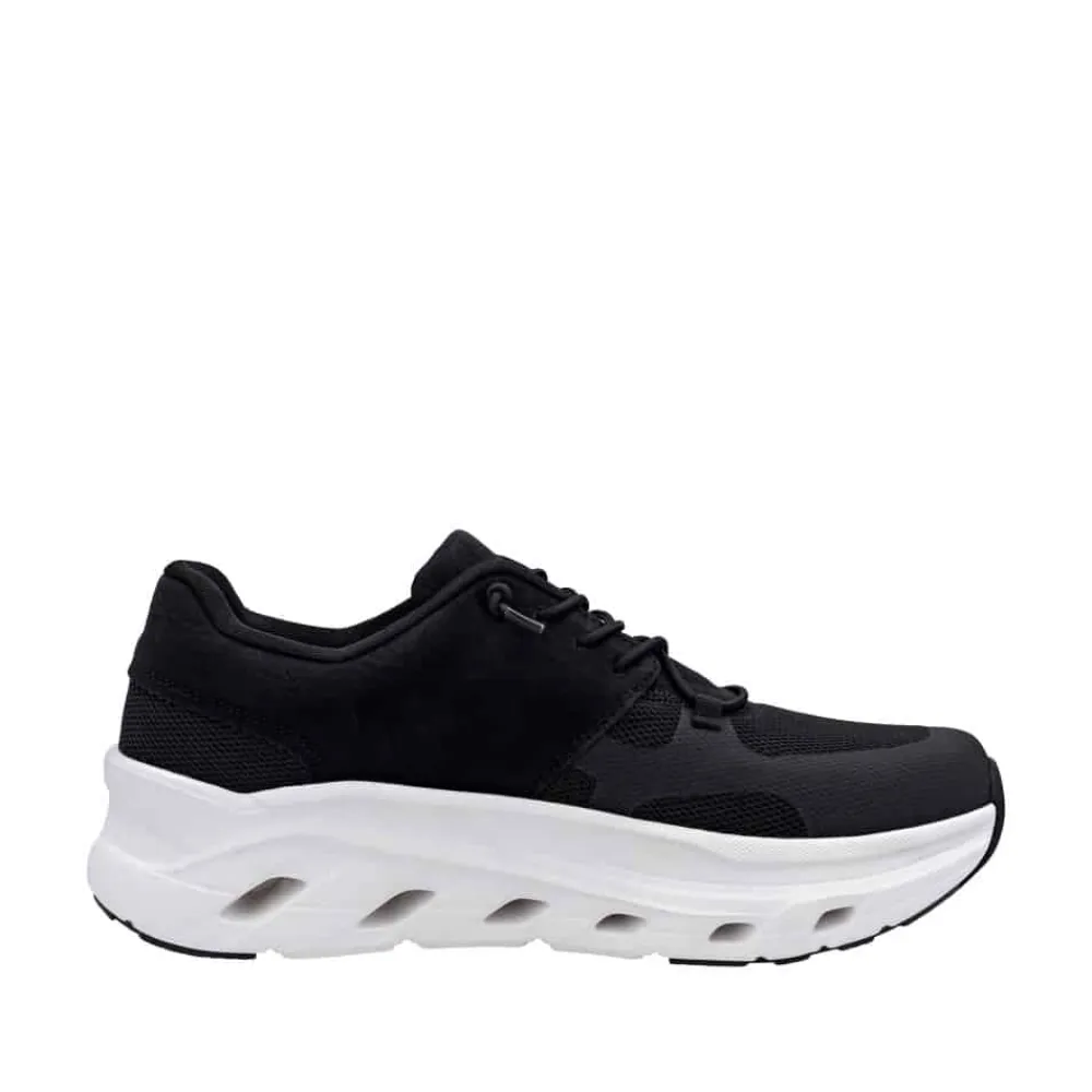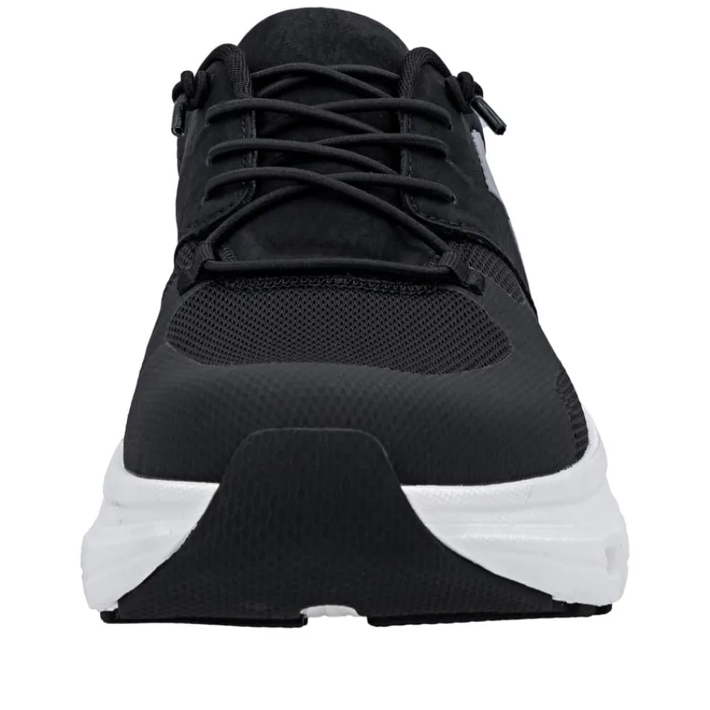Rieker sneakers til herre i sort. Disse sorte sneakers kombinerer smart design med praktisk funktion. Skoen har elastik over vristen og leveres med snørebånd, så du selv kan vælge, hvad der passer bedst. Indvendigt finder du en blød og udtagelig Rieker-Soft indersål, der sikrer komfort hele dagen. Modellen har ekstra bredde (H), som giver god plads og fleksibilitet, mens den mønstrede ydersål bidrager med både øget stødabsorbering og skridsikkerhed.