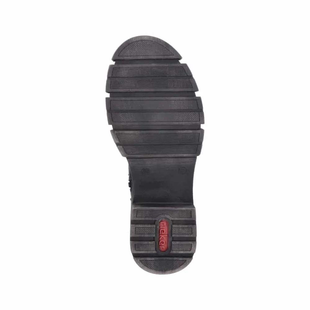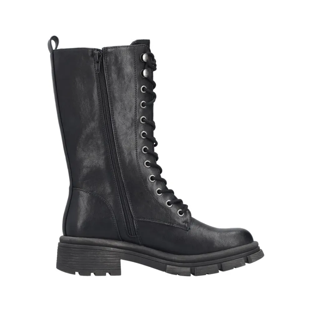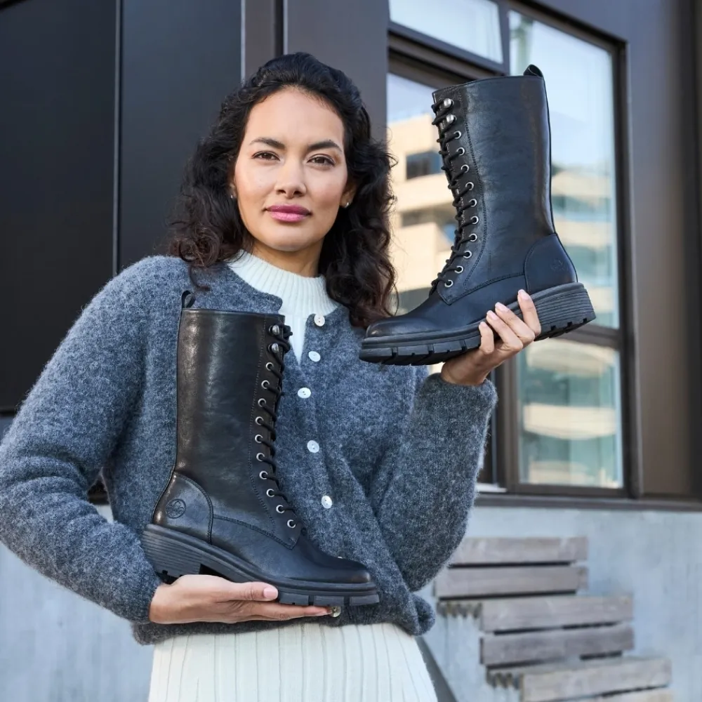 Rieker støvle til dame i sort. Flot støvle i klassisk sort, der kombinerer stil med praktiske funktioner. Modellen er udstyret med snørebånd og en funktionel lynlås, som gør den nem at tage af og på. Indvendigt giver en varm foring og en blød sål for høj komfort gennem hele dagen. Den chunky ydersål fuldender designet og giver både øget stødabsorbering og skridsikkerhed.