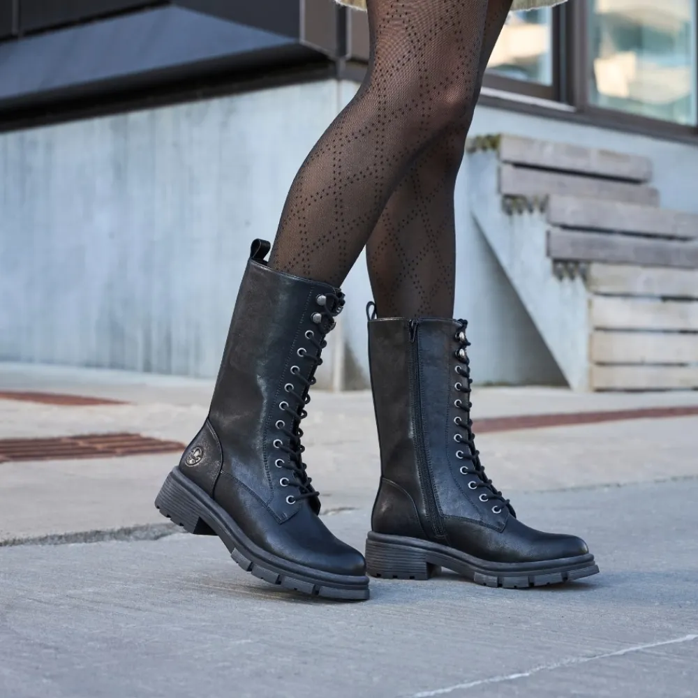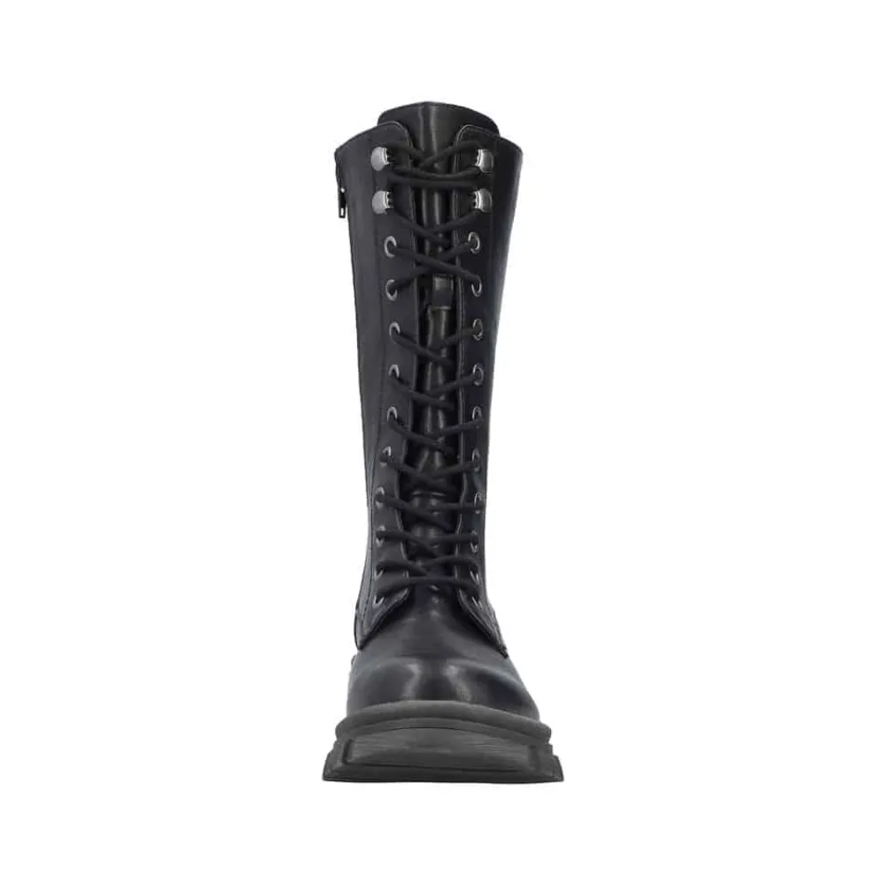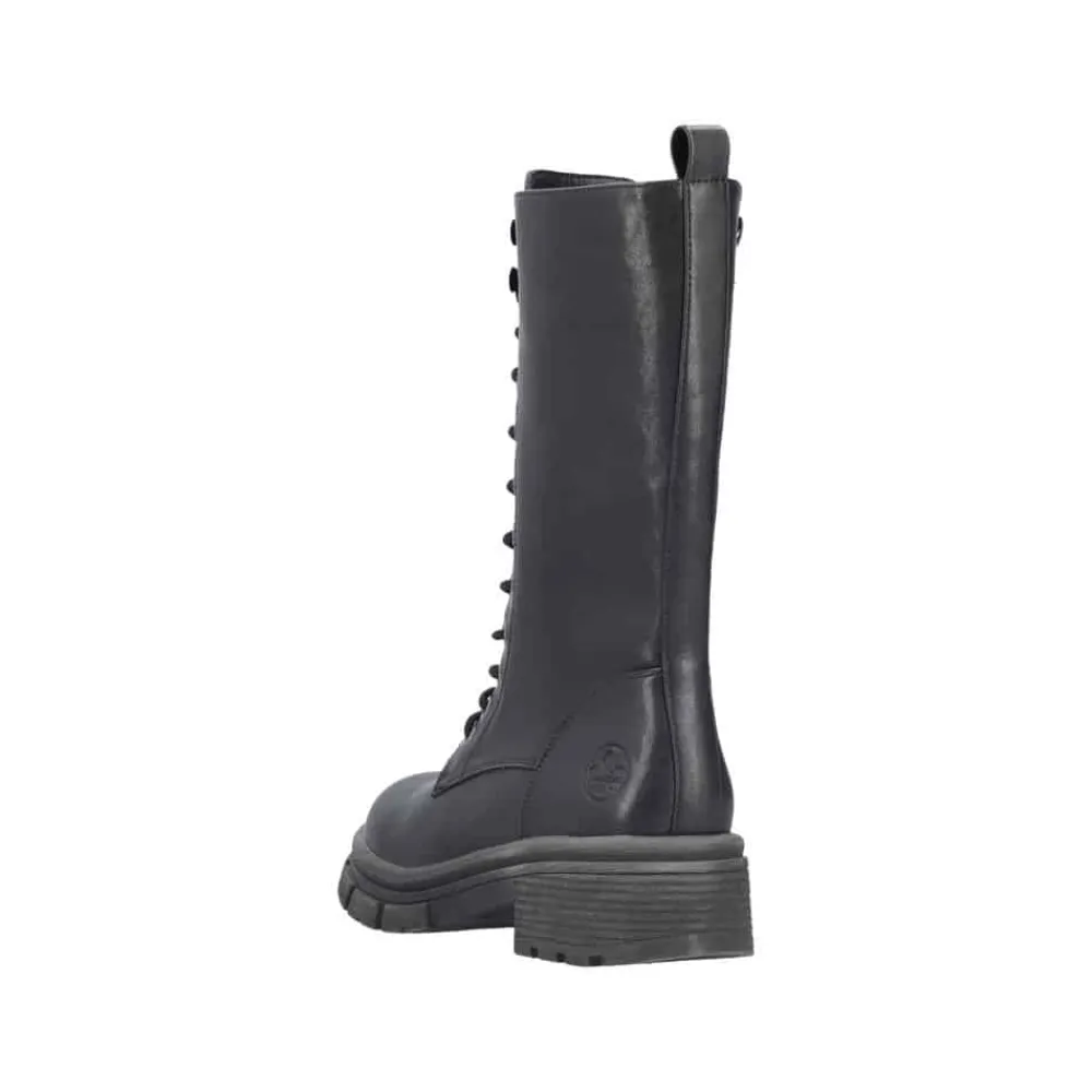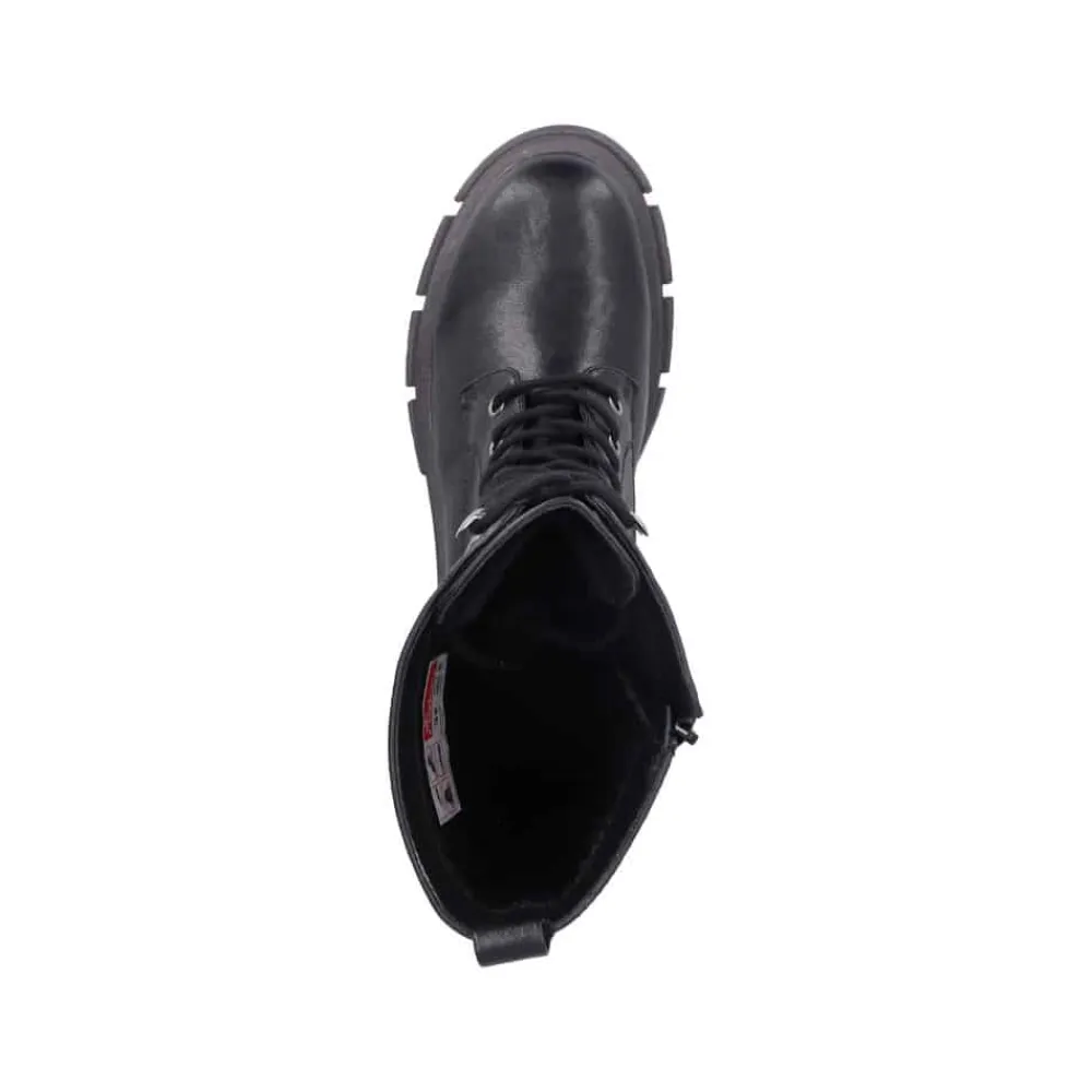 Rieker støvle til dame i sort. Flot støvle i klassisk sort, der kombinerer stil med praktiske funktioner. Modellen er udstyret med snørebånd og en funktionel lynlås, som gør den nem at tage af og på. Indvendigt giver en varm foring og en blød sål for høj komfort gennem hele dagen. Den chunky ydersål fuldender designet og giver både øget stødabsorbering og skridsikkerhed.