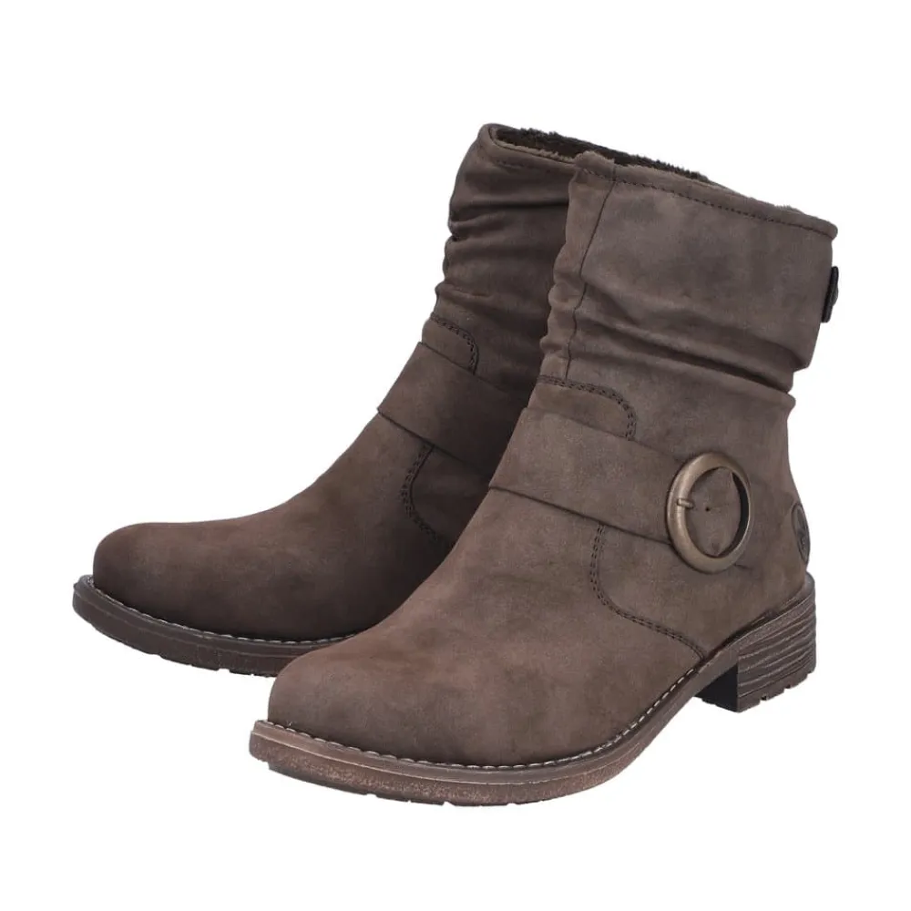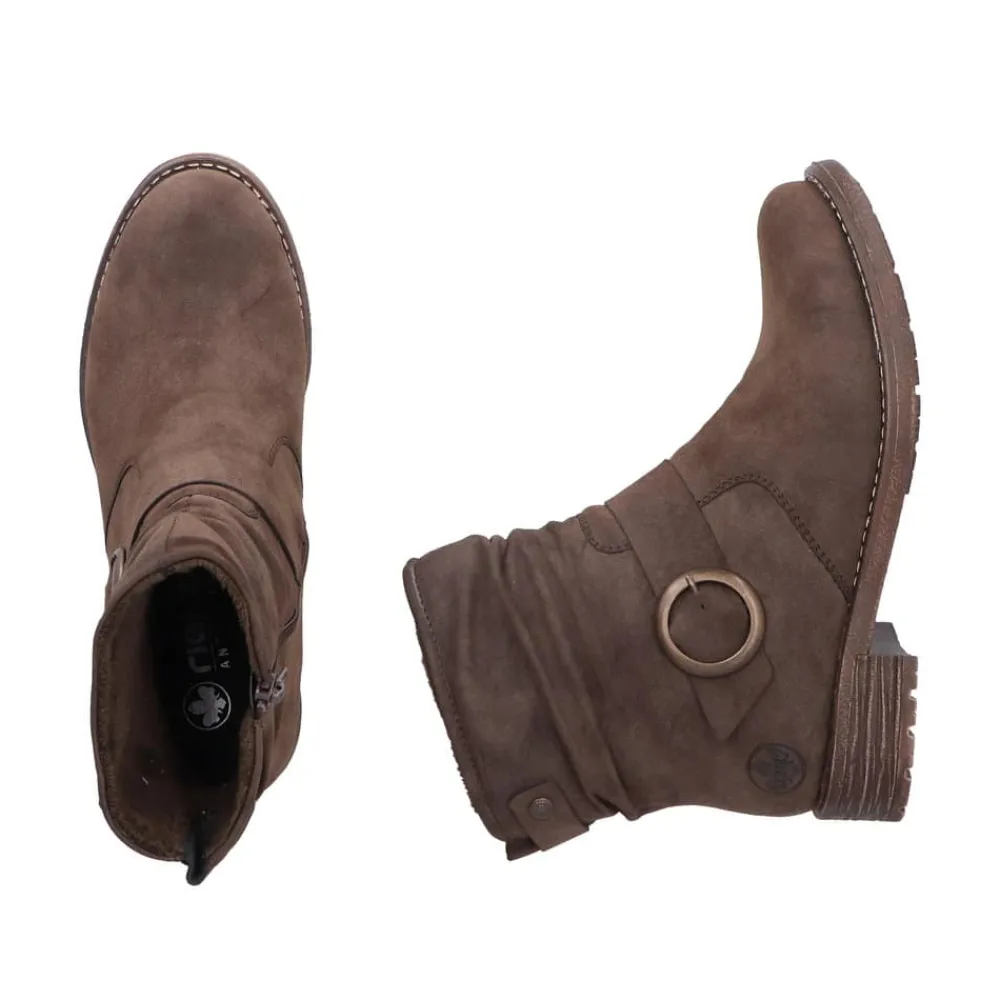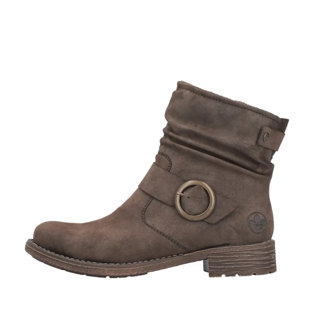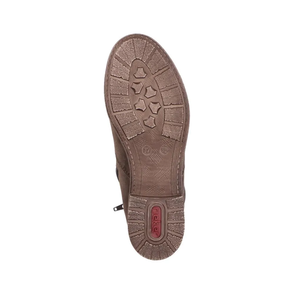Rieker støvle til dame i mørkebrun. Moderne støvle i en smuk brun farve med en dekorativ spænde på siden, der tilfører et feminint og stilfuldt udtryk. Støvlen er udstyret med en funktionel lynlås på indersiden, så den er nem at tage af og på. Indvendigt finder du en let foring og en blød, udtagelig indersål, som giver høj komfort gennem hele dagen. Den lille blokhæl på ca. 3,5 cm giver et elegant løft, mens den stødabsorberende ydersål med mønster giver øget støtte og skridsikkerhed.