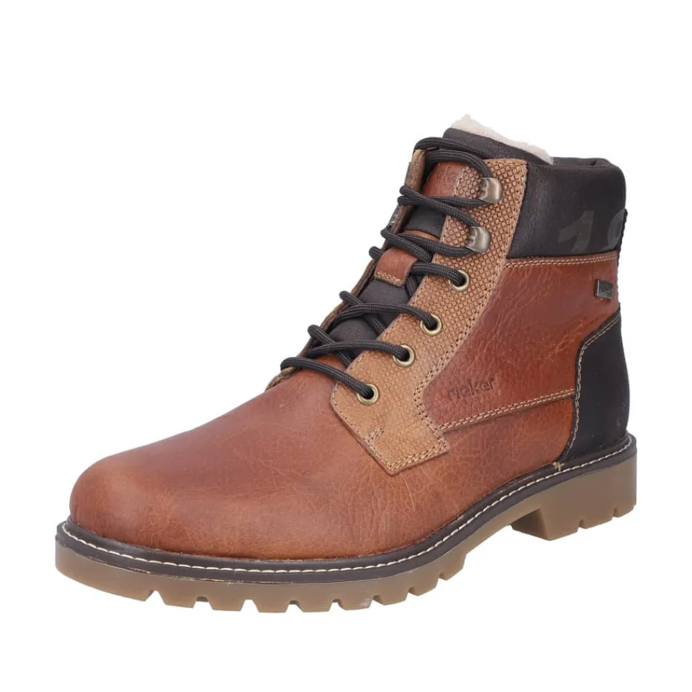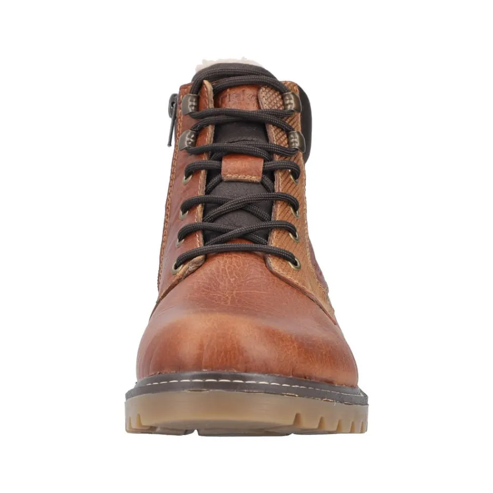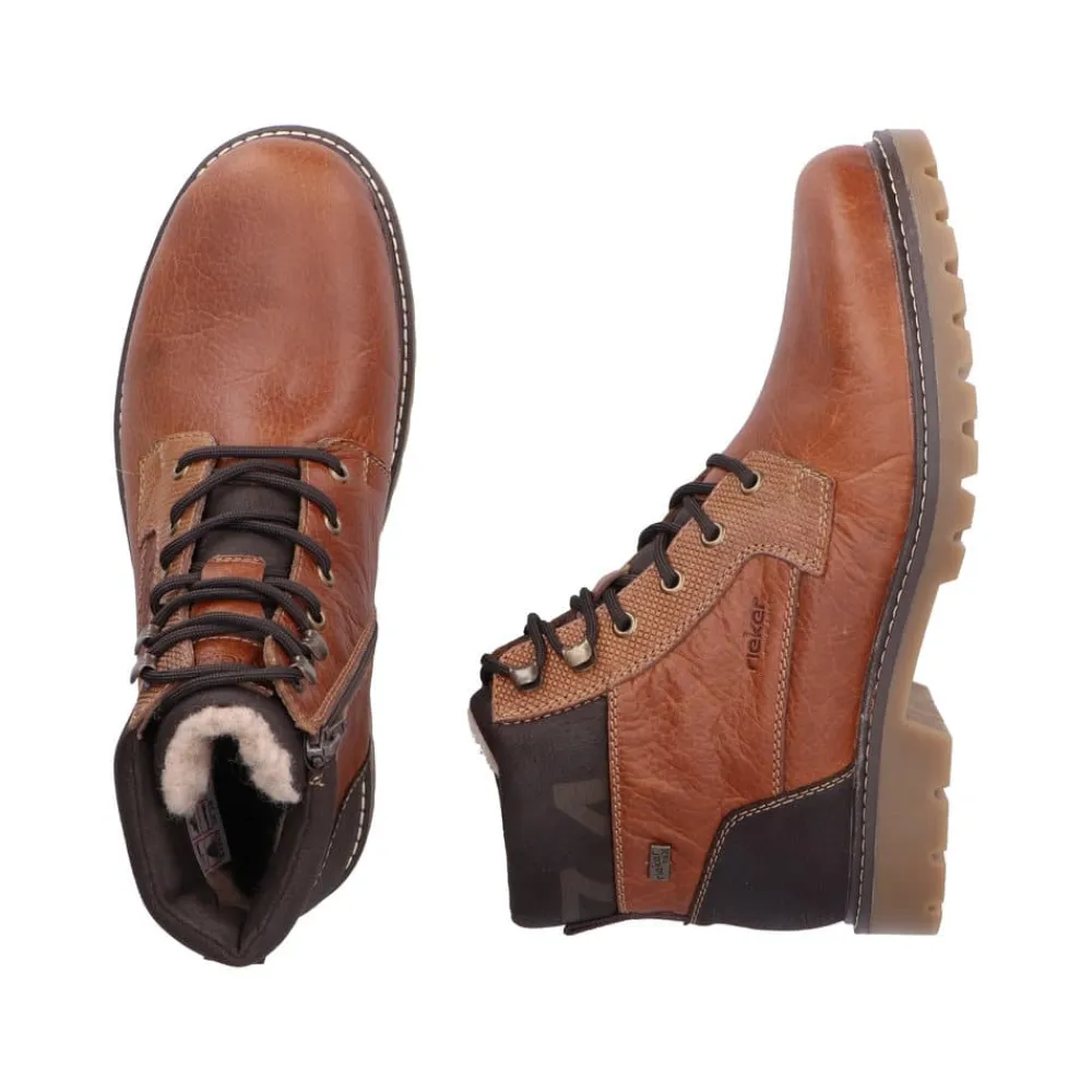 Rieker støvle til herre i brun. Smart og praktisk støvle i en flot brun farve med en overdel af skind, der kombinerer komfort og funktionalitet. Støvlen er udstyret med snørebånd foran samt en funktionel lynlås på indersiden, der gør det nemt og hurtigt at komme i og af den. Snørebåndene sikrer en optimal pasform, imens den skridsikrer ydersål sikrer øget skridsikkerhed og optimal komfort med dens stødabsorberende egenskaber. Indvendigt bliver du mødt af en blød indersål og en dejlig varm foring, der holder dine fødder varme. Med RiekerTEX er den støvle også vandafvisende.