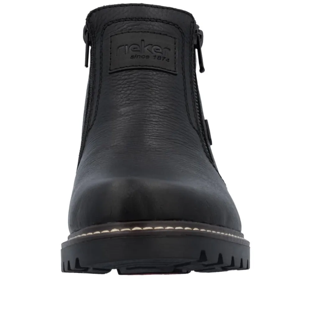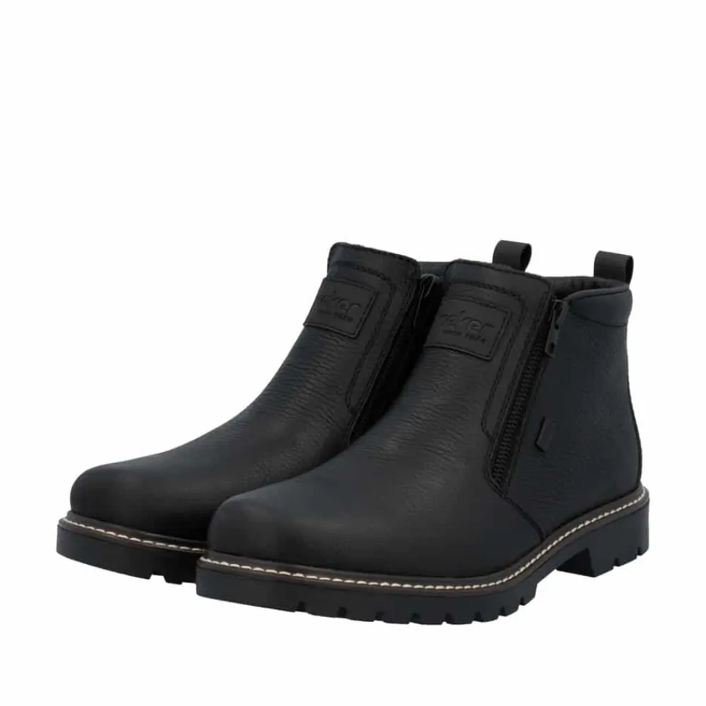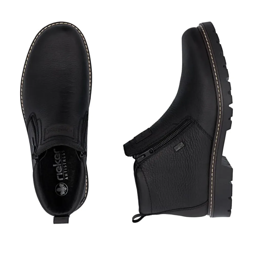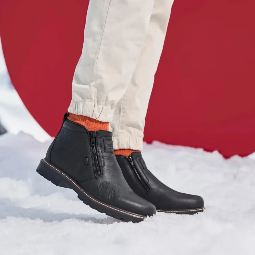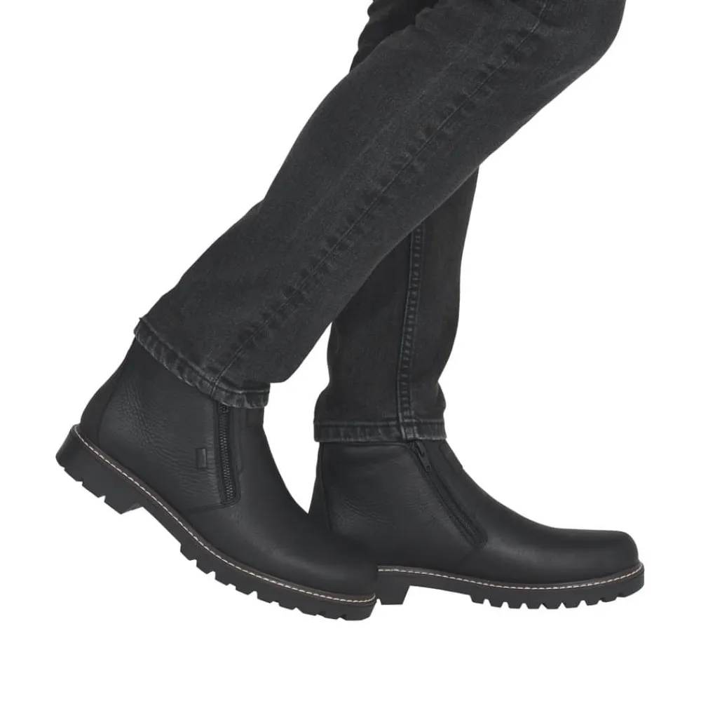 Rieker støvle til herre i sort. Moderne vinterstøvle i sort med klassiske detaljer og en skindoverdel, der giver et stilrent udtryk. Støvlen er udstyret med to funktionelle lynlåse, som gør den nem at tage af og på. Indvendigt sørger en blød indersål og en varm foring for høj komfort og lune fødder i den kolde tid. Pasformen er rummelig med ekstra bredde G, og Rieker-Tex giver kraftig vandafvisning. Med en solid Fiber-Grip ydersål der er udstyret med stødabsorbering og et godt mønster, får du øget skridsikkerhed og støtte.