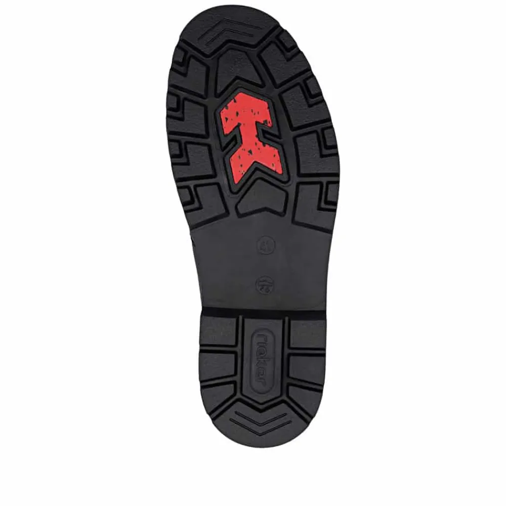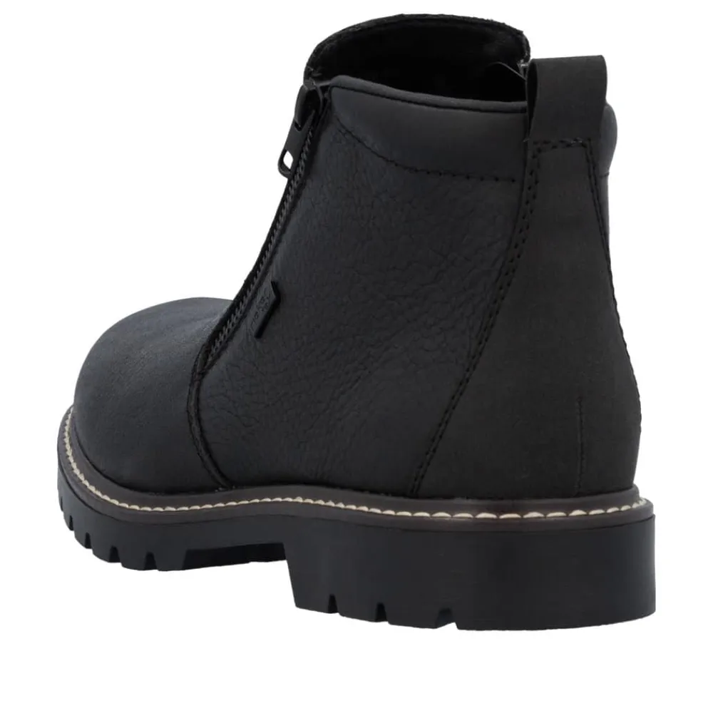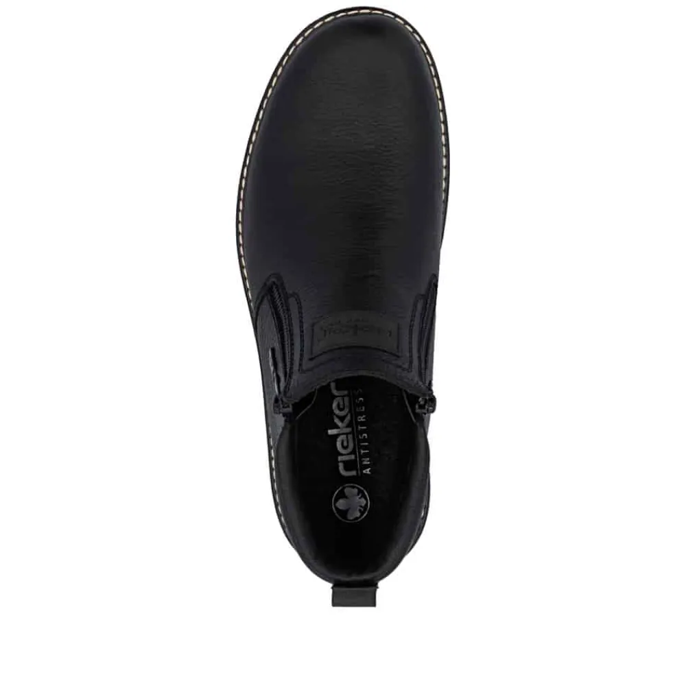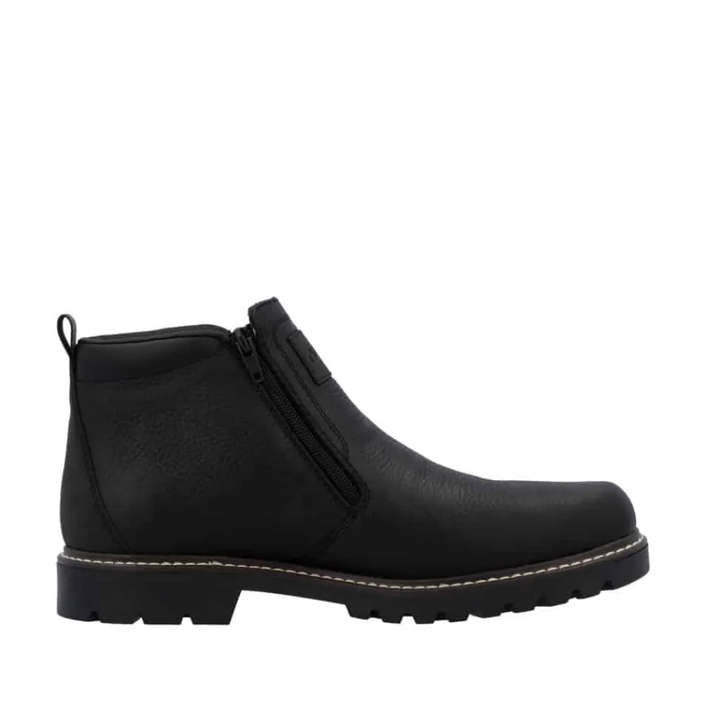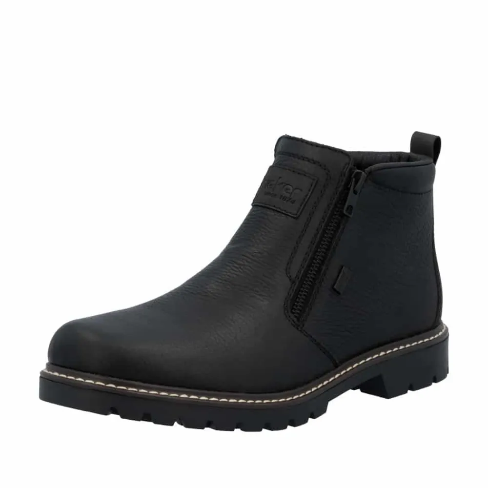 Rieker støvle til herre i sort. Moderne vinterstøvle i sort med klassiske detaljer og en skindoverdel, der giver et stilrent udtryk. Støvlen er udstyret med to funktionelle lynlåse, som gør den nem at tage af og på. Indvendigt sørger en blød indersål og en varm foring for høj komfort og lune fødder i den kolde tid. Pasformen er rummelig med ekstra bredde G, og Rieker-Tex giver kraftig vandafvisning. Med en solid Fiber-Grip ydersål der er udstyret med stødabsorbering og et godt mønster, får du øget skridsikkerhed og støtte.