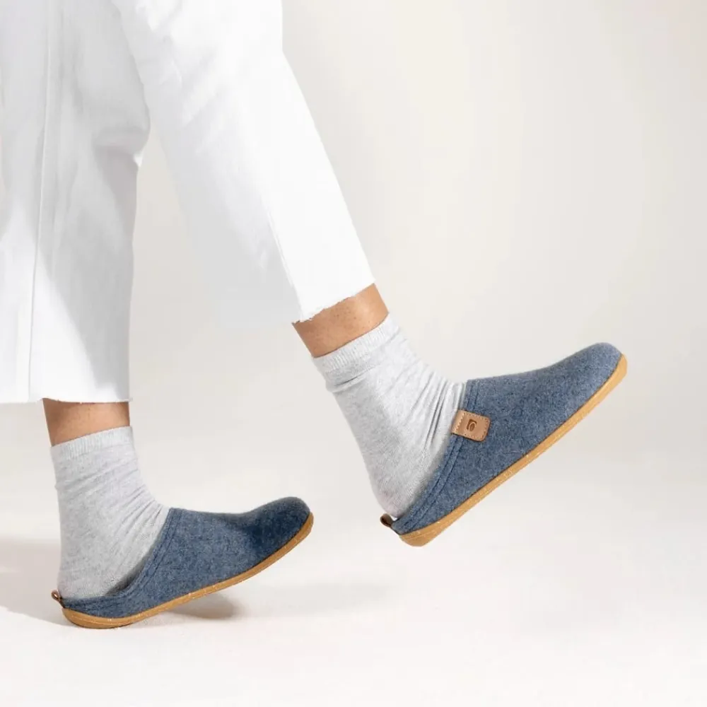 Rohde Greenys N°35 hjemmesko til dame i blå. Oplev den perfekte blanding af stil og komfort med denne bløde og ergonomiske hjemmesko. Den har en skridsikker gummisål lavet af delvist genanvendte materialer og en behagelig udtagelig læderindlægssål, der forkæler dine fødder. Hjemmeskoen er lavet af 50% genanvendt uld, hvilket gør den både luftgennemtrængelig og varm.