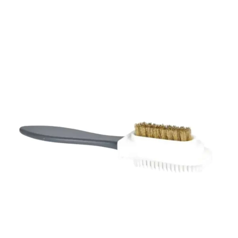 Ruskindsbørste til sko og støvler. Børste som anvendes til ruskind og nubuck. Fjerner snavs og støv. OBS. Start med gummisiden, da stålsiden er mere kraftig.
