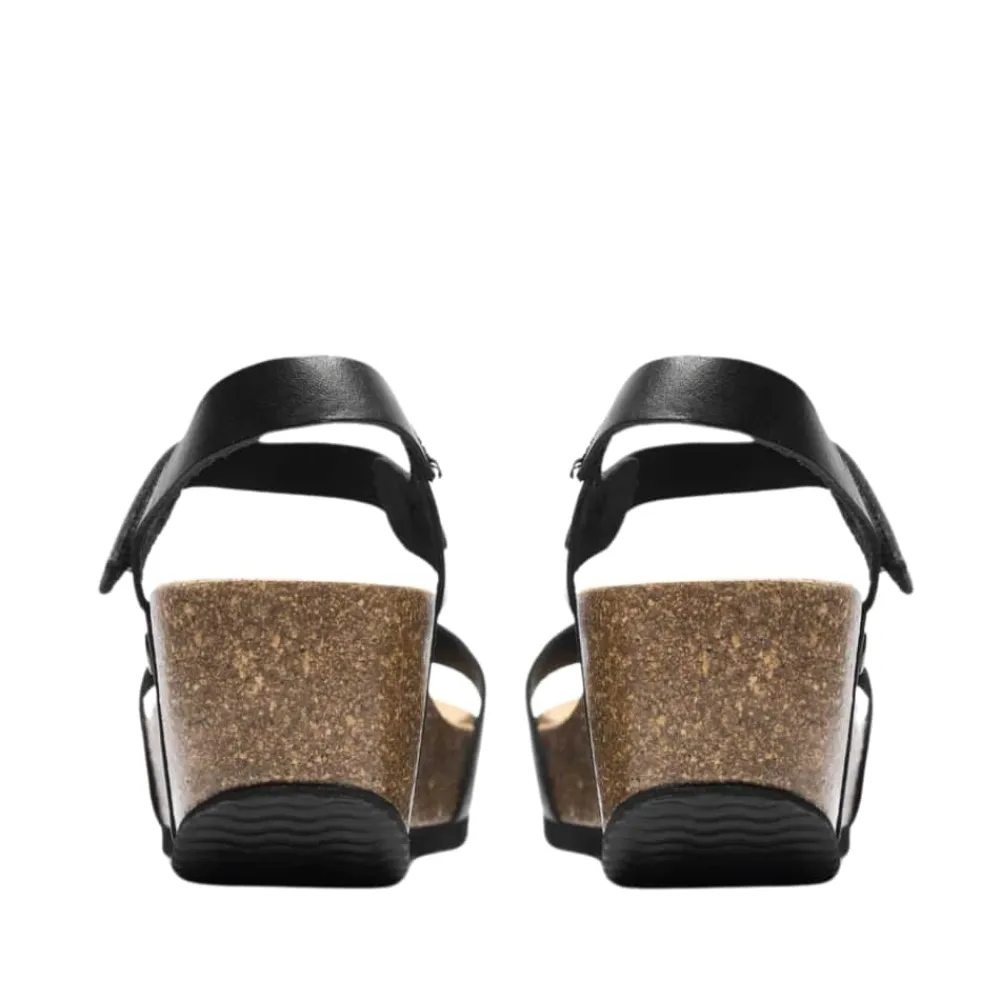 Cashott Casanni sandal til dame i sort. Sandal med kort kilehæl, skabt til mode- og komfortbevidste kvinder. Denne elegante sandal med ca. 6 cm. hæl kombinerer stil med ekstraordinær støtte takket være dens innovative funktioner. Med en letvægts EVA-ydersål og en blød kork- og latexsål former den sig efter din fod for en behagelig gang hele dagen. Hælstroppen tilføjer ekstra stabilitet, mens skindet fra LWG-certificerede garverier sikrer både luksus og bæredygtighed. Justerbare velcrobånd giver den perfekte pasform, og hver sandal er håndlavet i Spanien af dygtige håndværkere.