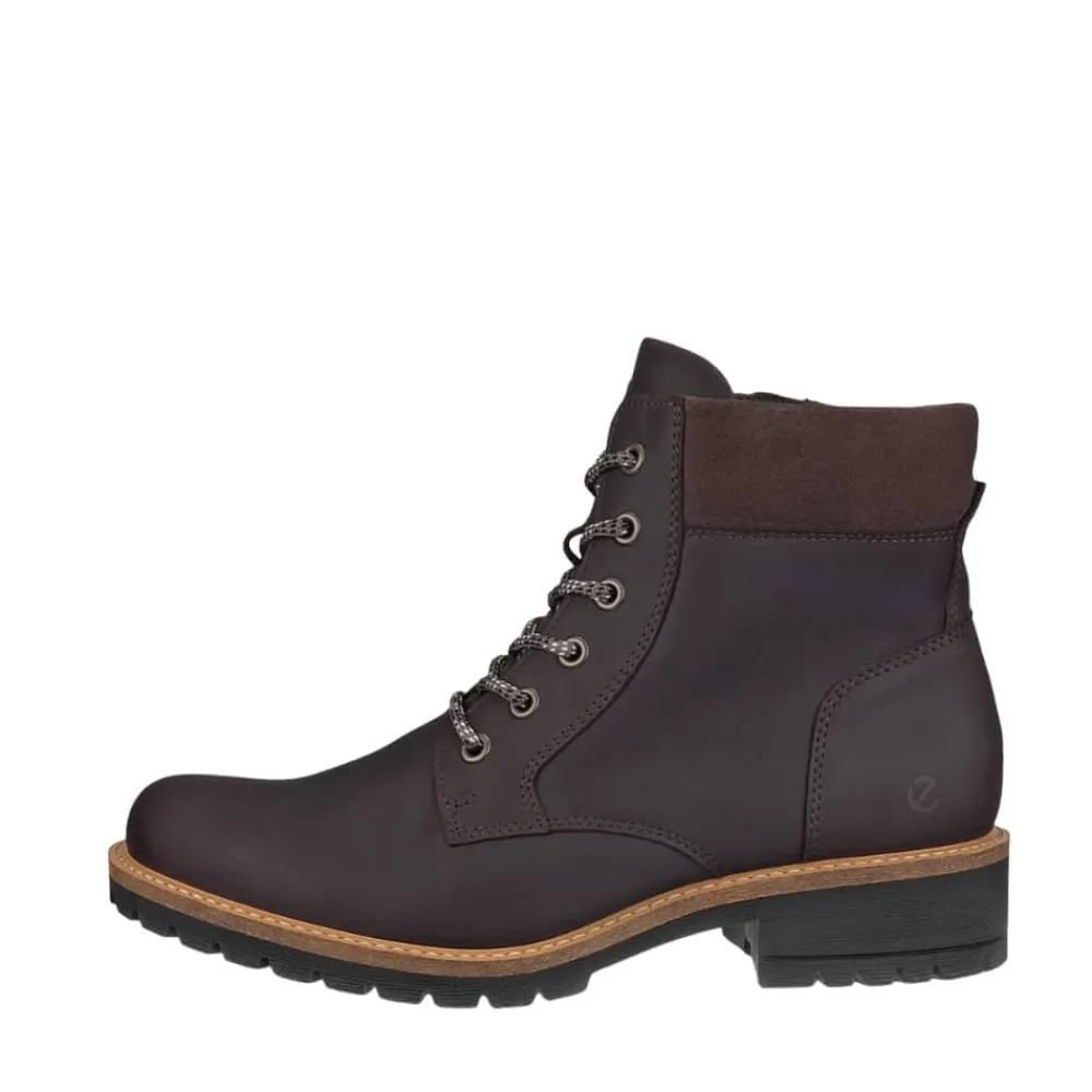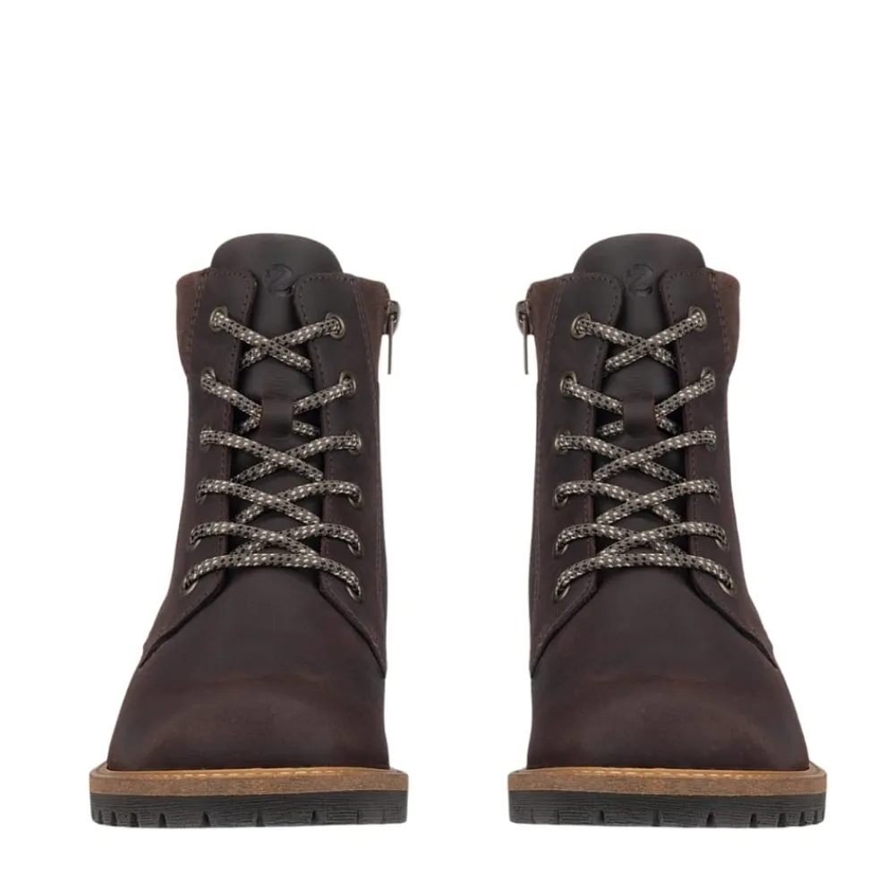 Ecco Elaina støvle til dame i brun. Smart ankelstøvle i nubucklæder, der kombinerer moderne design med høj komfort. Støvlen har snørebånd foran, så du kan justere pasformen, samt en funktionel lynlås på indersiden, der gør den nem at tage af og på. Indvendigt sikrer en blød, udtagelig indersål god støtte, mens Ecco Fluidform™ teknologien følger fodens naturlige bevægelser for ekstra komfort. Den stabile ydersål med blokhæl på ca. 4 cm og mønster giver solid støtte og øget skridsikkerhed hele dagen.