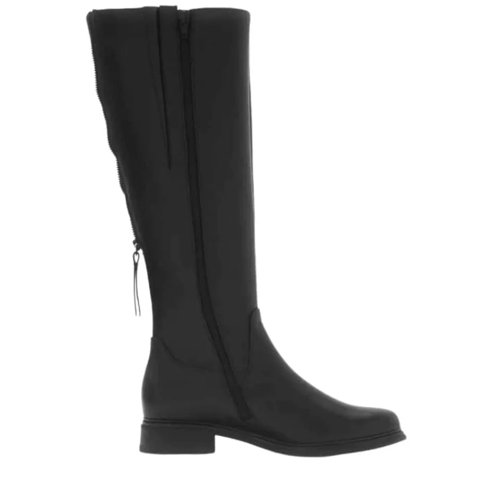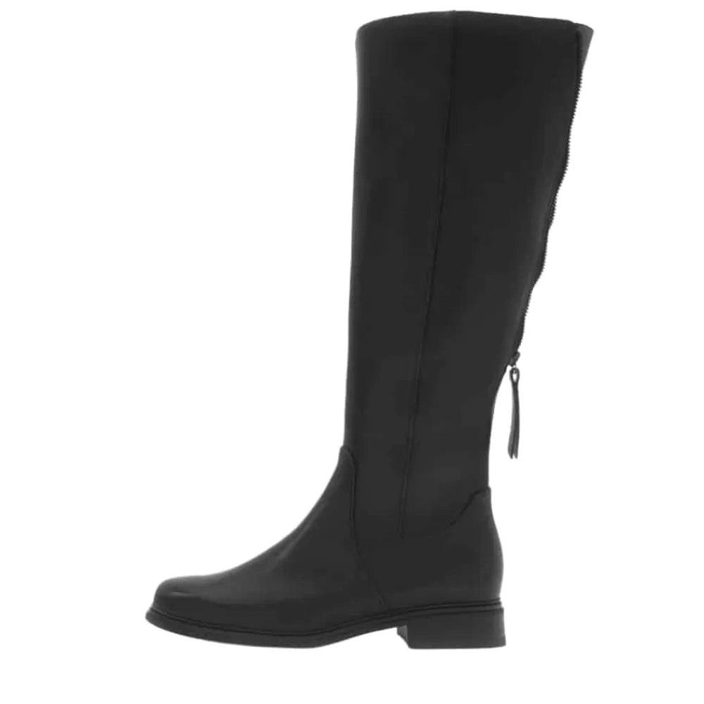 Gabor lang støvle til dame i sort. Klassisk og elegant sort støvle med en skindoverdel, der giver et tidløst look. Bagpå har modellen en funktionel lynlås, som tilfører et flot touch, mens skaftvidde L giver en mere rummelig pasform. På indersiden er støvlen udstyret med endnu en lynlås, der gør det nemt at tage den af og på. Indvendigt finder du en blød udtagelig sål, der giver god komfort, mens den mønstrede ydersål øger skridsikkerheden.