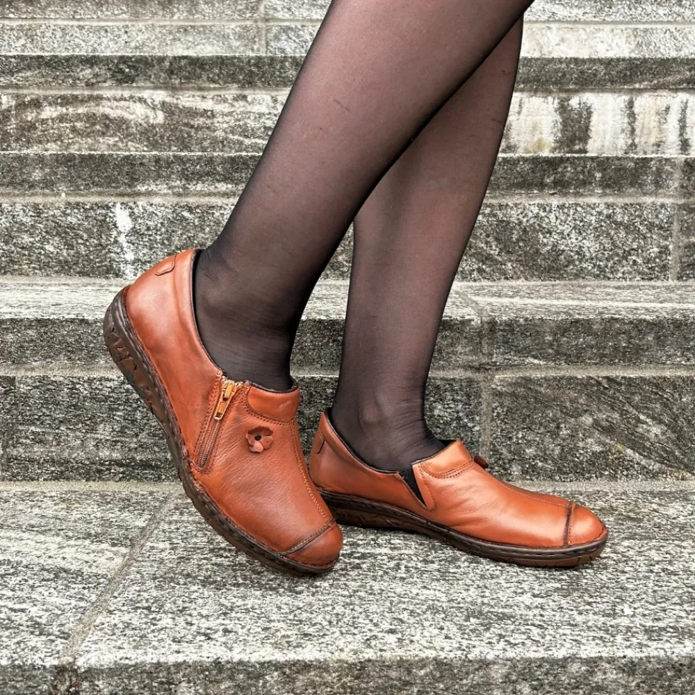 Relaxshoe sko til dame i brun. Flot sko i en smuk brun farve med en blomst på siden, som giver et stilfuldt udtryk. Overdelen er fremstillet i blødt skind, der sikrer en behagelig fornemmelse og høj komfort. De to funktionelle lynlåse gør det nemt at tage skoen af og på. Indvendigt finder du en blød og udtagelig indersål i skind, der giver optimal komfort gennem hele dagen. Den solide ydersål er mønstret, hvilket giver øget støtte og skridsikkerhed.