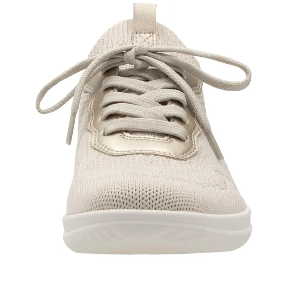 Remonte sneakers til dame i beige. Denne lette og fleksible sneakers i beige er designet med elegante gyldne og glitrende detaljer, der giver et stilfuldt touch. Snørebåndene foran sikrer en justerbar pasform og gør skoen nem at tage af og på. Overdelen er fremstillet i blødt og åndbart materiale, som giver en behagelig fornemmelse hele dagen. Indvendigt finder du en udtagelig Remonte Soft-indersål, der sikrer optimal komfort. Den rummelige pasform (G) giver ekstra plads til fødderne, mens den lette Lite n Soft-ydersål sørger for fleksibilitet og effektiv stødabsorbering.