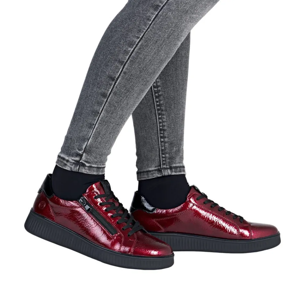Remonte sneakers til dame i rød. Moderne sneakers til dame i en flot rød farve med fine detaljer. Skoen har både snørebånd og en funktionel lynlås, som gør den nem at tage på og tilpasse til foden. Indvendigt finder du en blød udtagelig Remonte-Soft indersål, der giver komfort hele dagen. Modellen har ekstra bredde (G), hvilket sikrer mere plads og en fleksibel pasform. Den lette og fleksible ydersål har et godt mønster, som øger både stødabsorbering og skridsikkerhed.