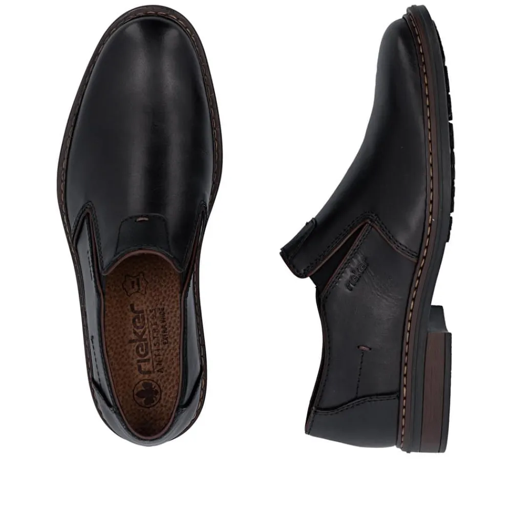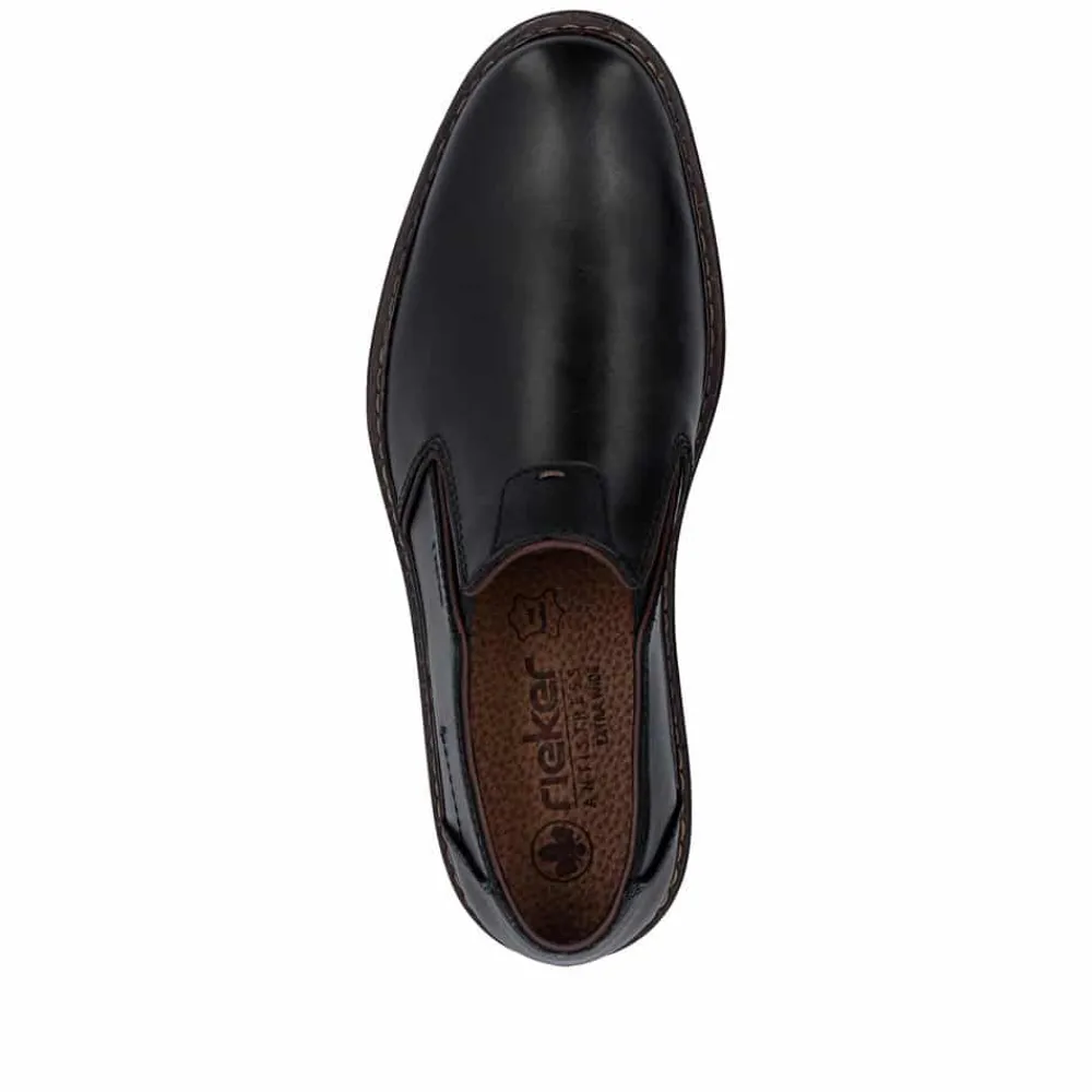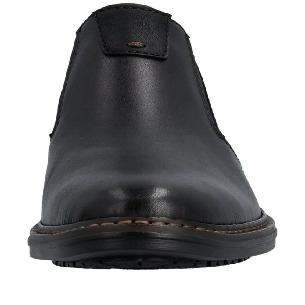 Rieker hyttesko til herre i sort. Denne flotte sko med skindoverdel er et alsidigt valg, der passer perfekt til både hverdag og finere begivenheder. Skoen har elastik, som gør den let at komme i og af og samtidig giver en behagelig pasform. Indvendigt er skoen udstyret med en blød skindsål, der sikrer god komfort hele dagen, mens ekstra bredde (H) giver god rummelighed til foden. Ydersålen er designet med et mønster, som giver øget stødabsorbering og skridsikkerhed i hverdagen.