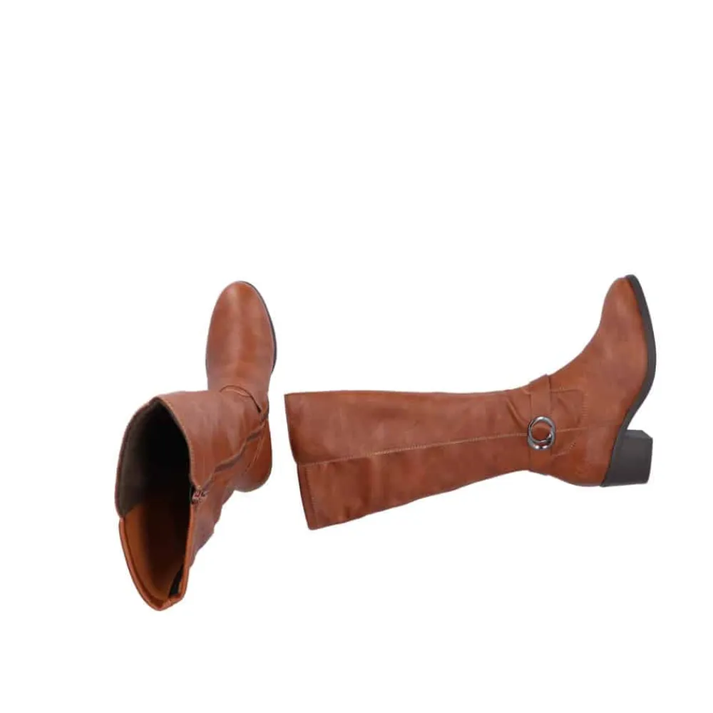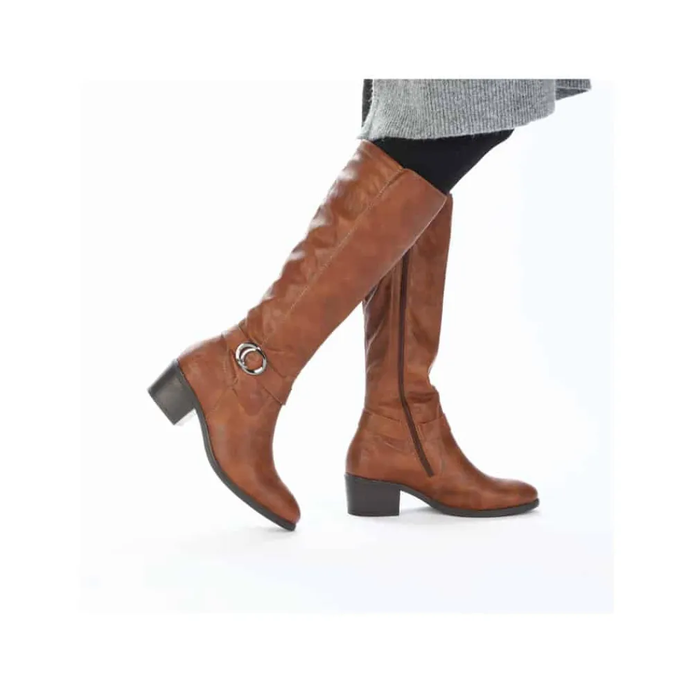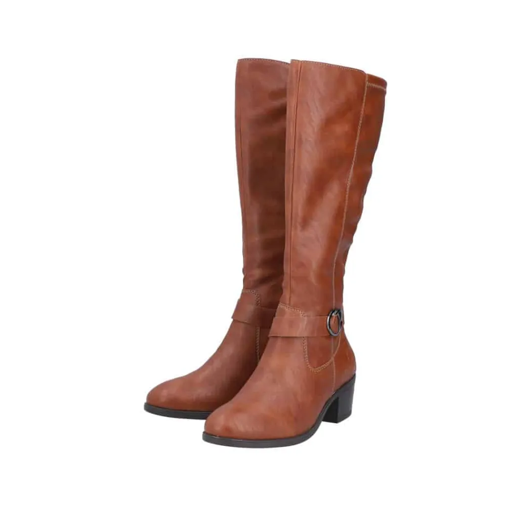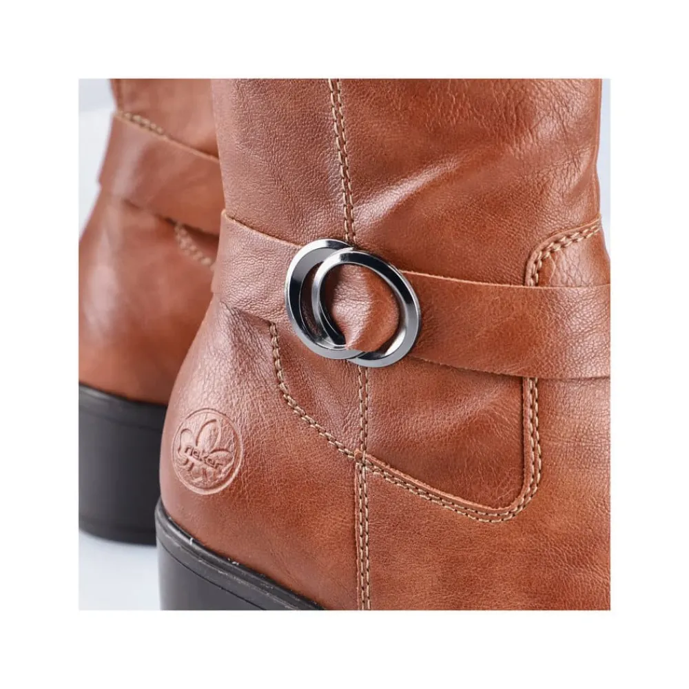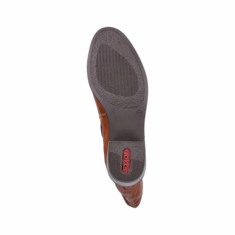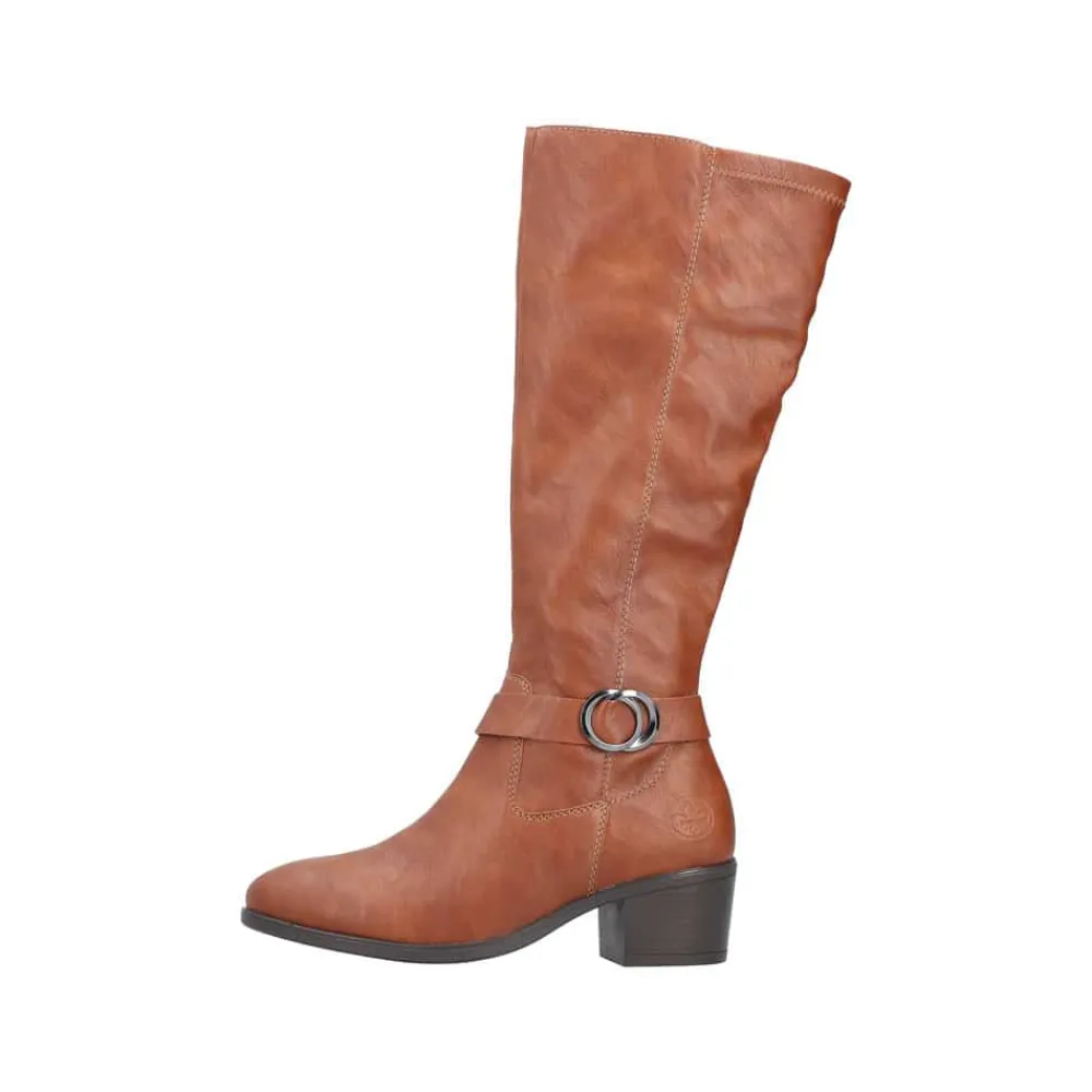 Rieker lang støvle til dame i brun. Smuk brun støvle med langt skaft og en flot detalje på siden, der giver et stilfuldt udtryk. Støvlen har en funktionel lynlås på indersiden, så den er nem at tage af og på. Indvendigt sørger en let foring for at holde fødderne lune, mens den bløde indersål giver ekstra komfort. Den elegante blokhæl på cirka 5,5 cm løfter looket, uden at det går ud over komforten. Ydersålen har stødabsorberende egenskaber, som giver god støtte hele dagen.