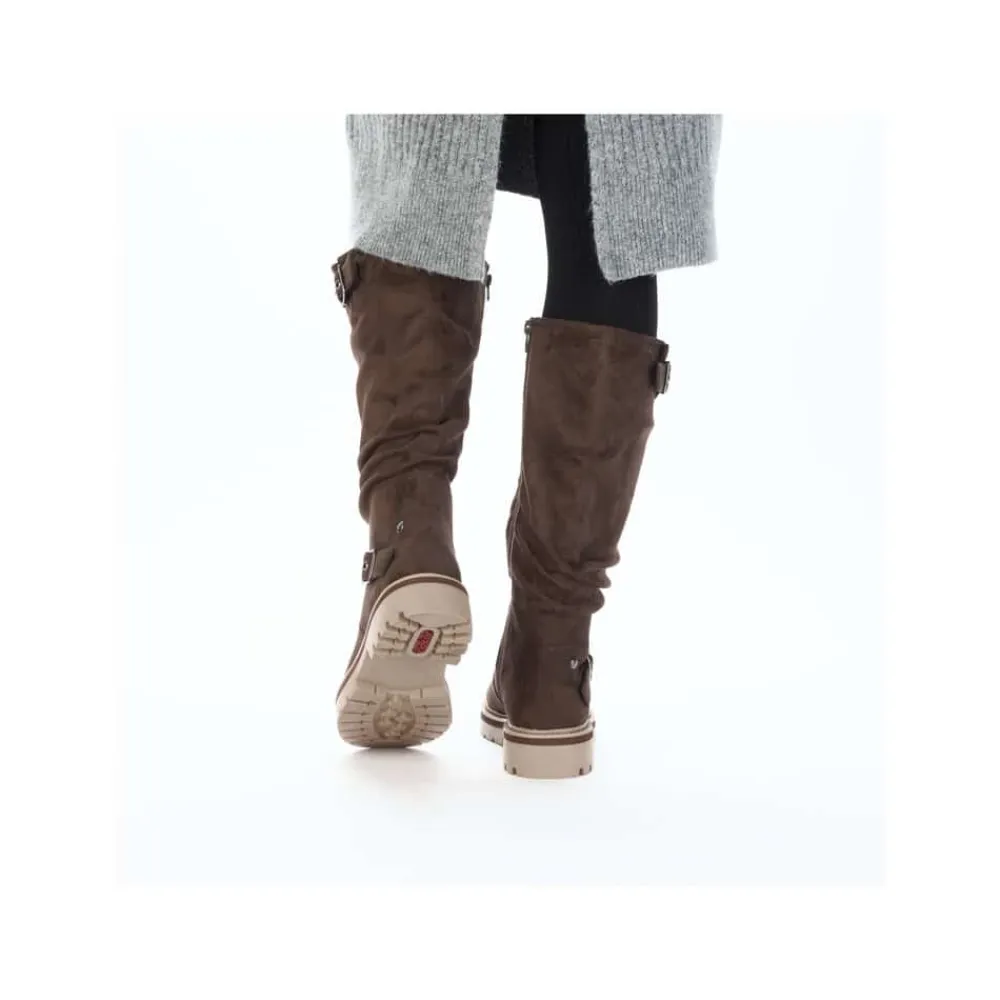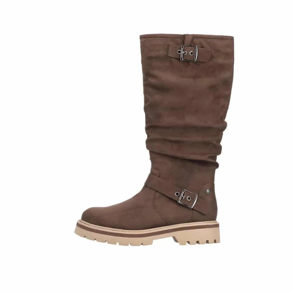 Rieker lang støvle til dame i brun. Stilfuld støvle i brun med flotte spænder og et langt skaft, der giver et moderne udtryk. Støvlen er udstyret med en funktionel lynlås på indersiden, som gør den nem at tage af og på. Indvendigt finder du en let foring og en blød sål, der sikrer høj komfort hele dagen. Den chunky ydersål med stødabsorberende egenskaber og et godt mønster giver øget støtte og skridsikkerhed.