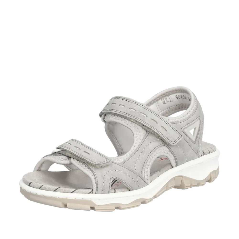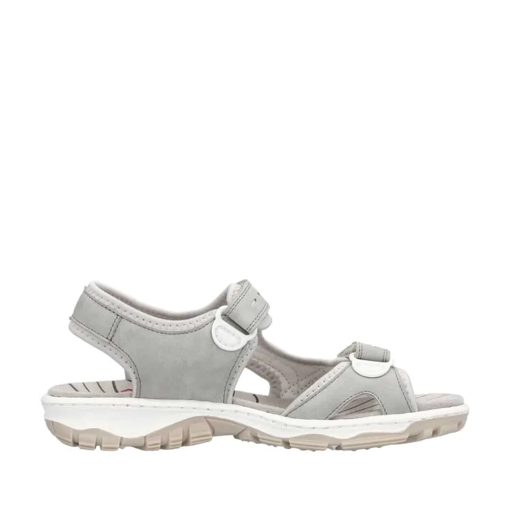 Rieker sandal til dame i grå. Denne fine sandal er lavet i en flot lys grå farve. Sandalen har to velcrolukninger, så den er nem at tilpasse foden. Dertil har sandalen rigtig gode stødabsorberende og fleksible antistress såler, som er med til at skabe en super god pasform og god komfort til fødderne. Sandalen har også en ydersål med et godt mønster der giver øget skridsikkerhed.