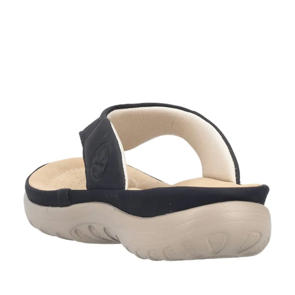 Rieker sandal til dame i sort. Denne lette sandal i sort kombinerer et klassisk udtryk med moderne detaljer. Tå-remmen giver et elegant og feminint look, mens slip-in funktionen gør det nemt at tage sandalen på. Indersålen er blød og sikrer komfort gennem hele dagen. Den solide ydersål med stødabsorbering og mønster giver både støtte og skridsikkerhed, hvilket gør sandalen perfekt til både hverdag og fritid.