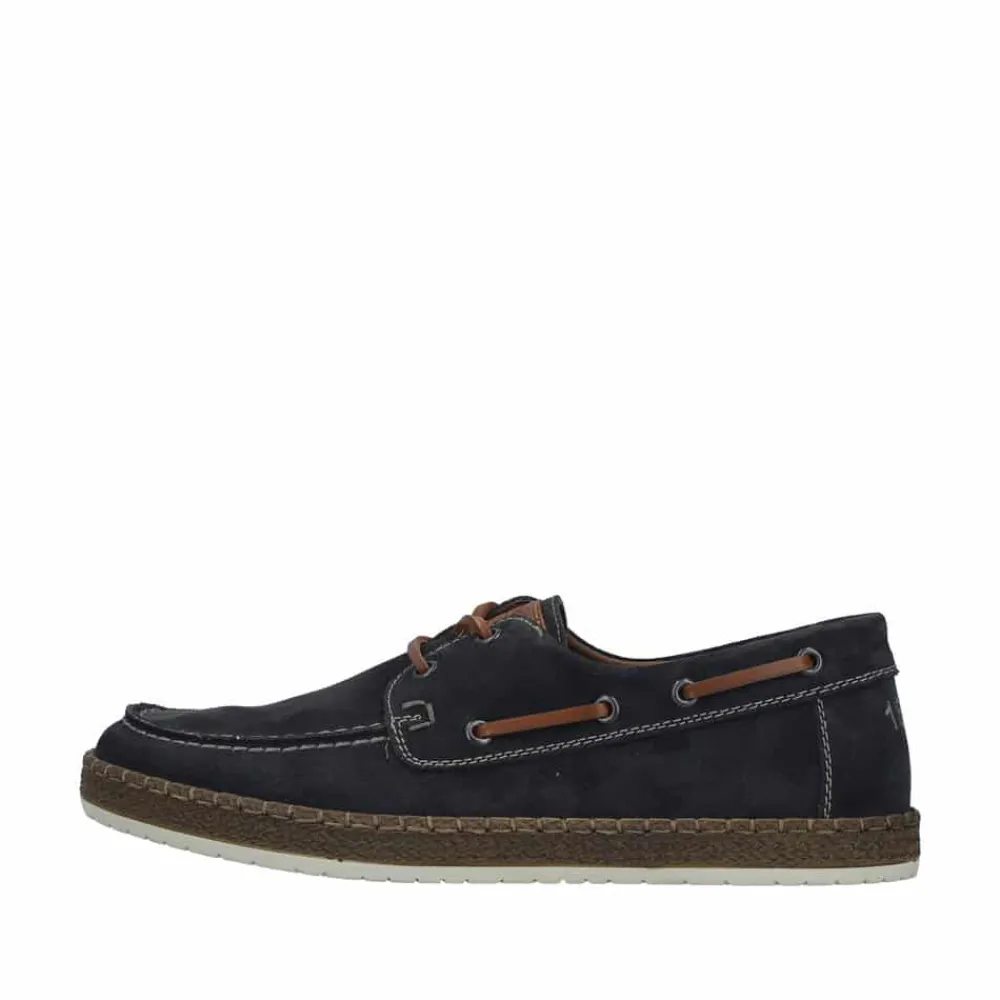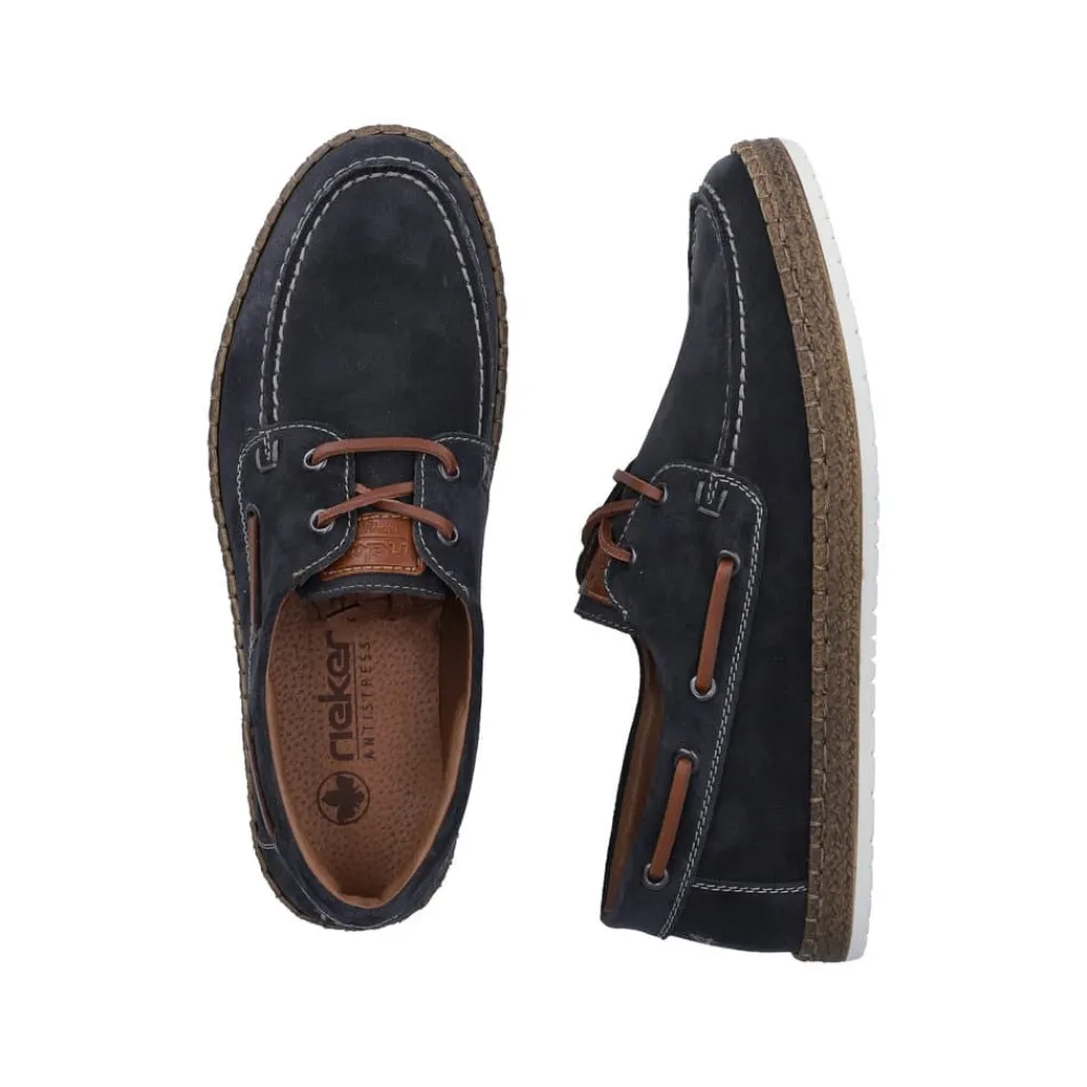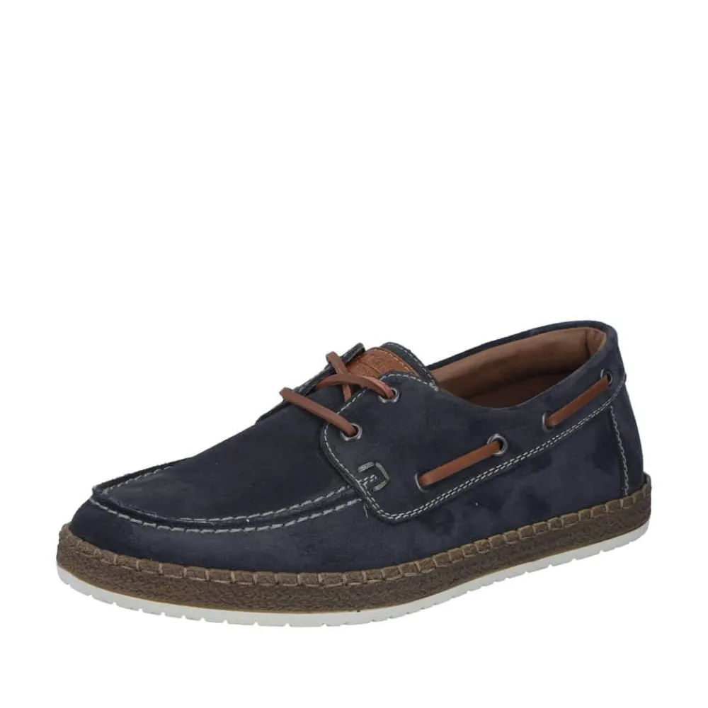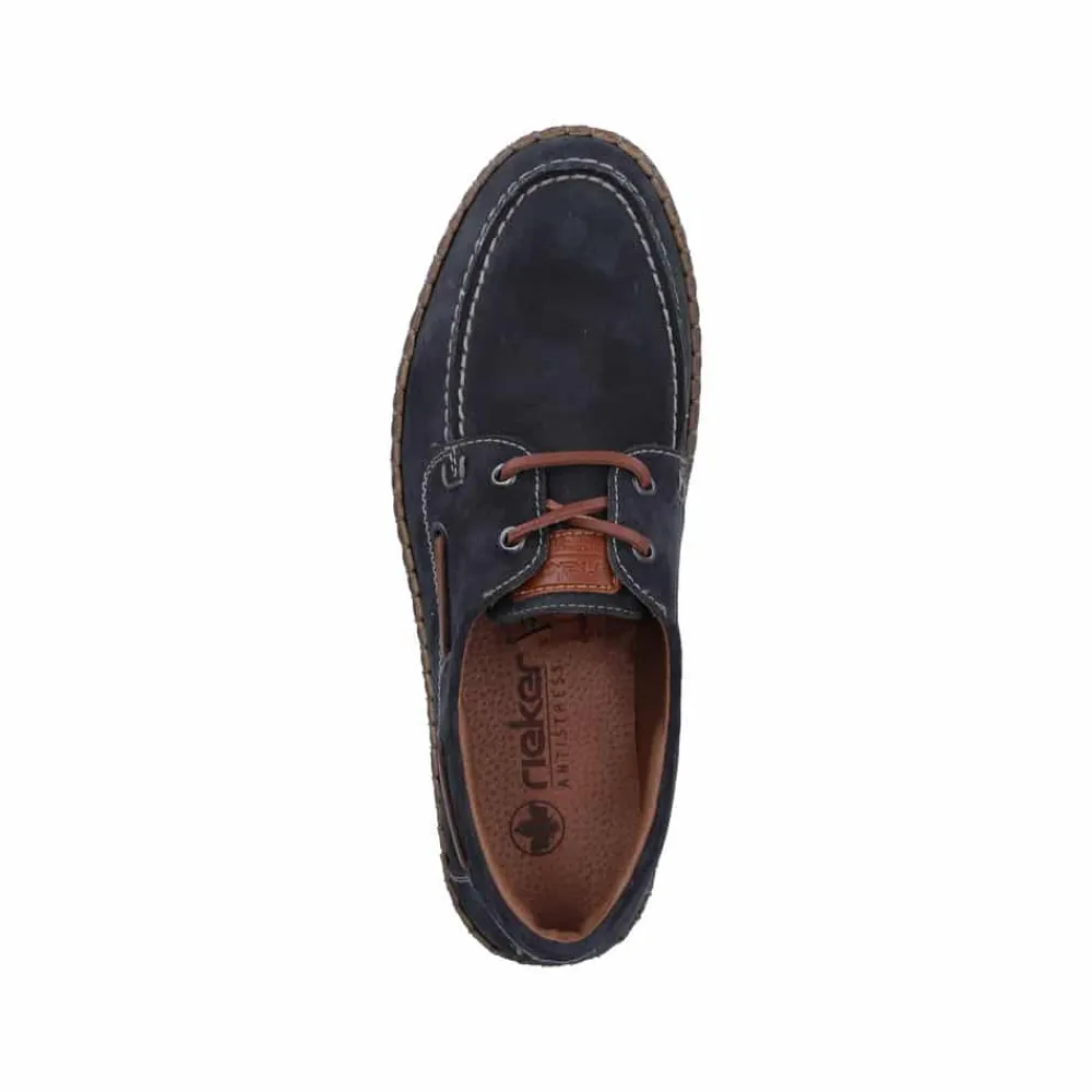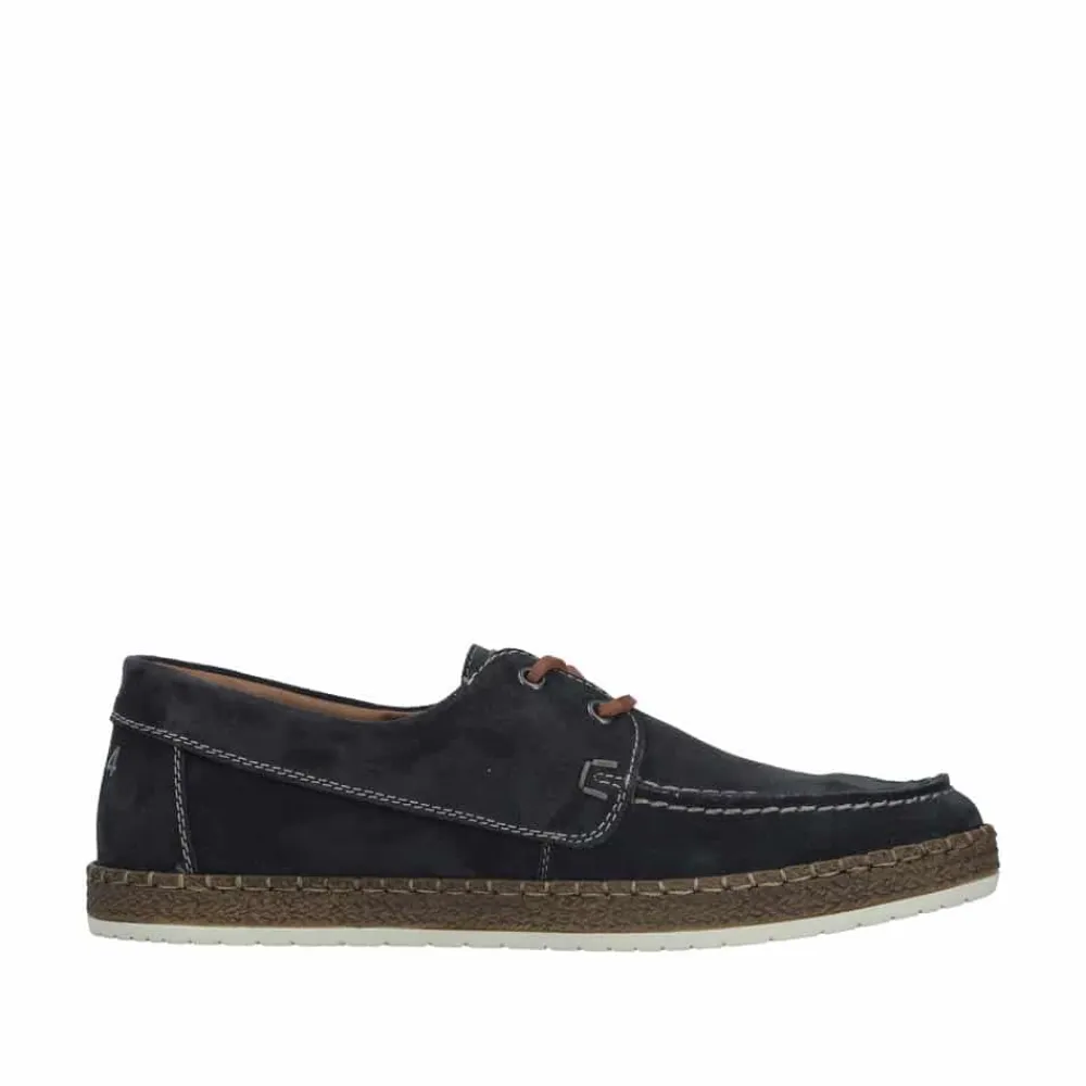 Rieker sejlersko til herre i mørkeblå. Moderne sejlersko i mørkeblå ruskind med snøredetaljer langs siden og foran, som giver det klassiske sejlerskos look. Snørebåndet gør det muligt at justere pasformen, så skoen sidder behageligt på foden. Indvendigt er skoen udstyret med en blød skindsål med ekstra bredde G, som giver god rummelighed og komfort hele dagen. Den lette og fleksible ydersål er designet med stødabsorbering, der sikrer god komfort ved daglig brug.