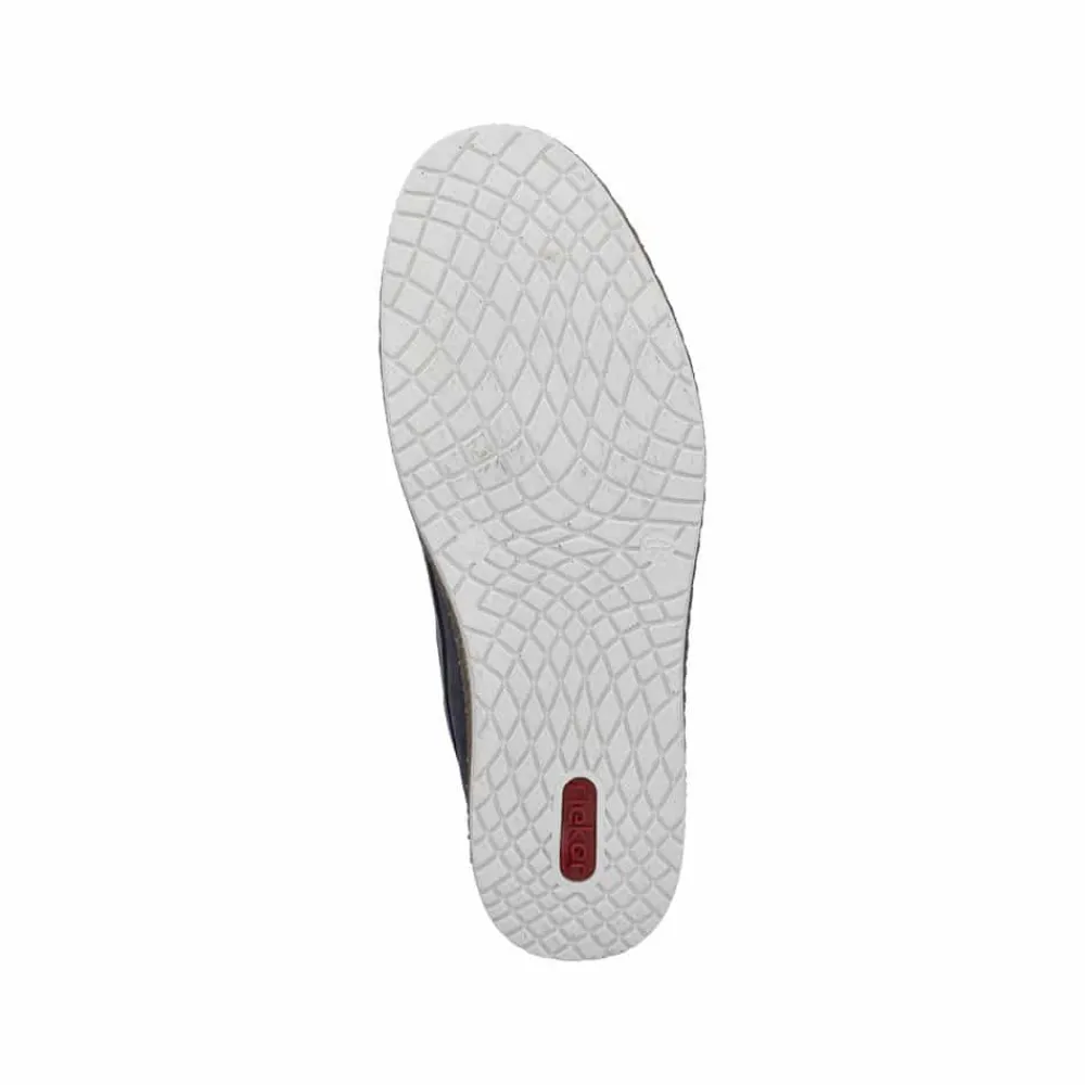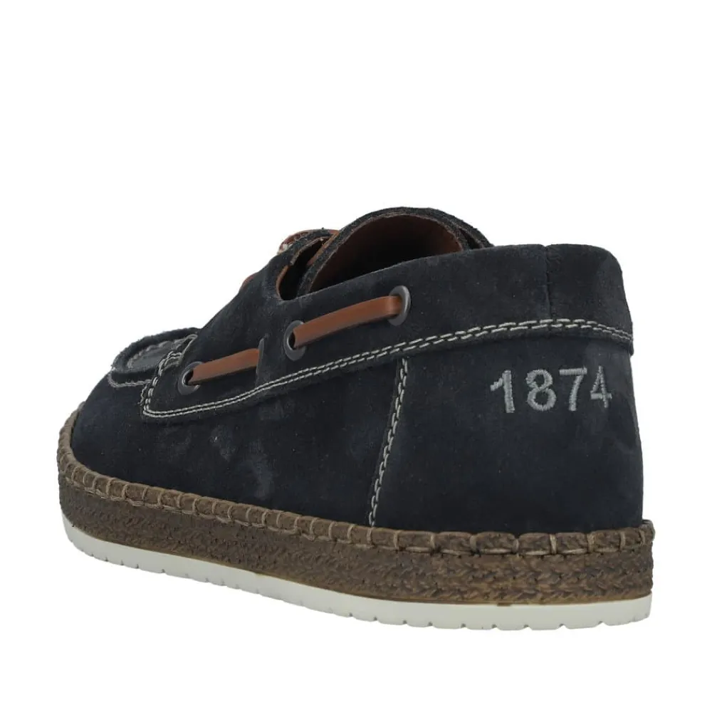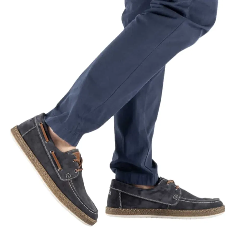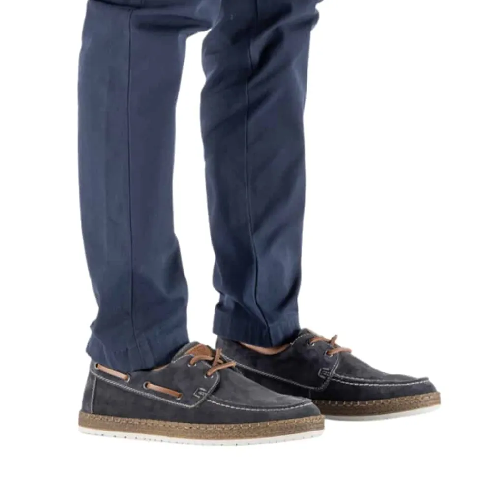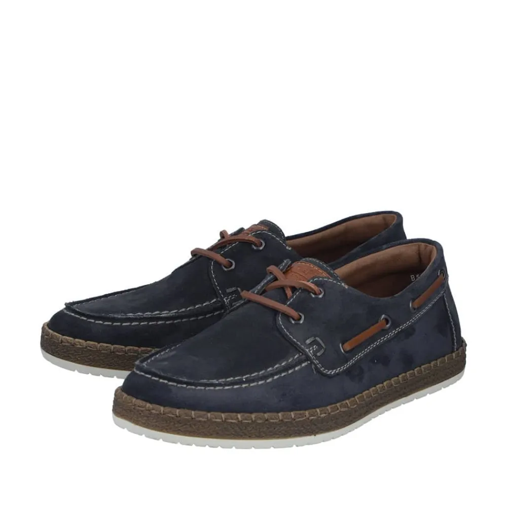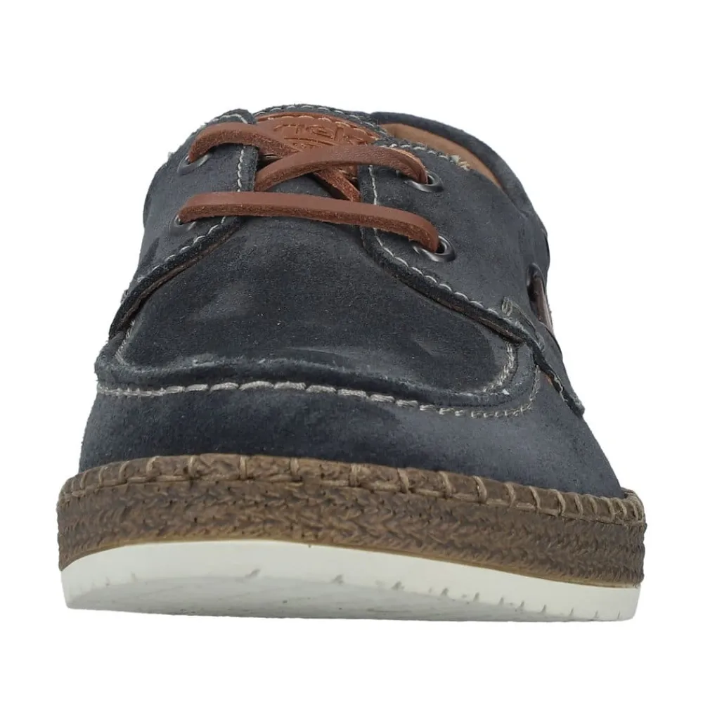 Rieker sejlersko til herre i mørkeblå. Moderne sejlersko i mørkeblå ruskind med snøredetaljer langs siden og foran, som giver det klassiske sejlerskos look. Snørebåndet gør det muligt at justere pasformen, så skoen sidder behageligt på foden. Indvendigt er skoen udstyret med en blød skindsål med ekstra bredde G, som giver god rummelighed og komfort hele dagen. Den lette og fleksible ydersål er designet med stødabsorbering, der sikrer god komfort ved daglig brug.